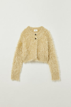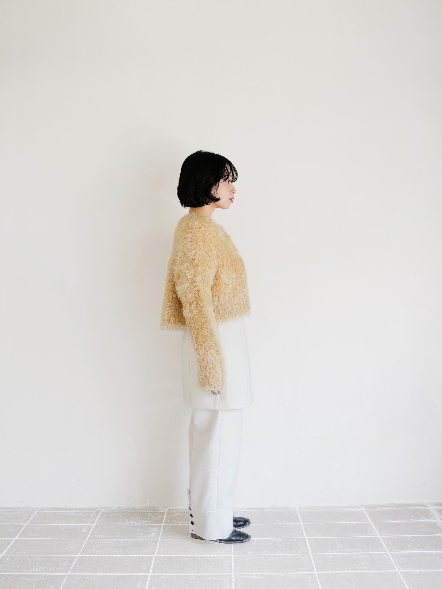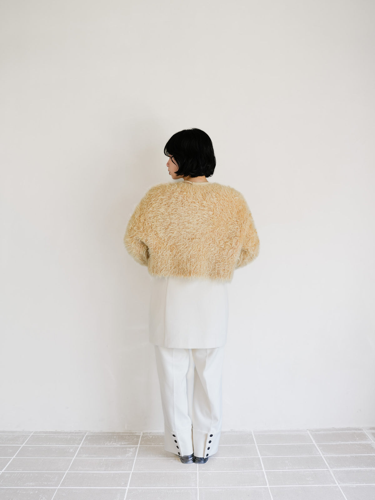 オフホワイトのロングトップスに毛足のあるショートカーディガンを重ねた、ニュートラルなワントーンコーデ。