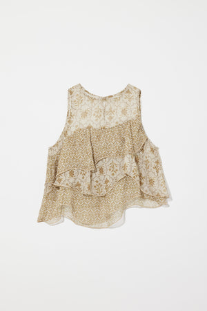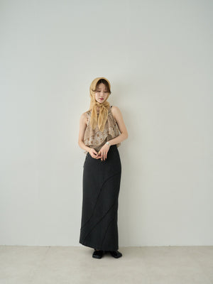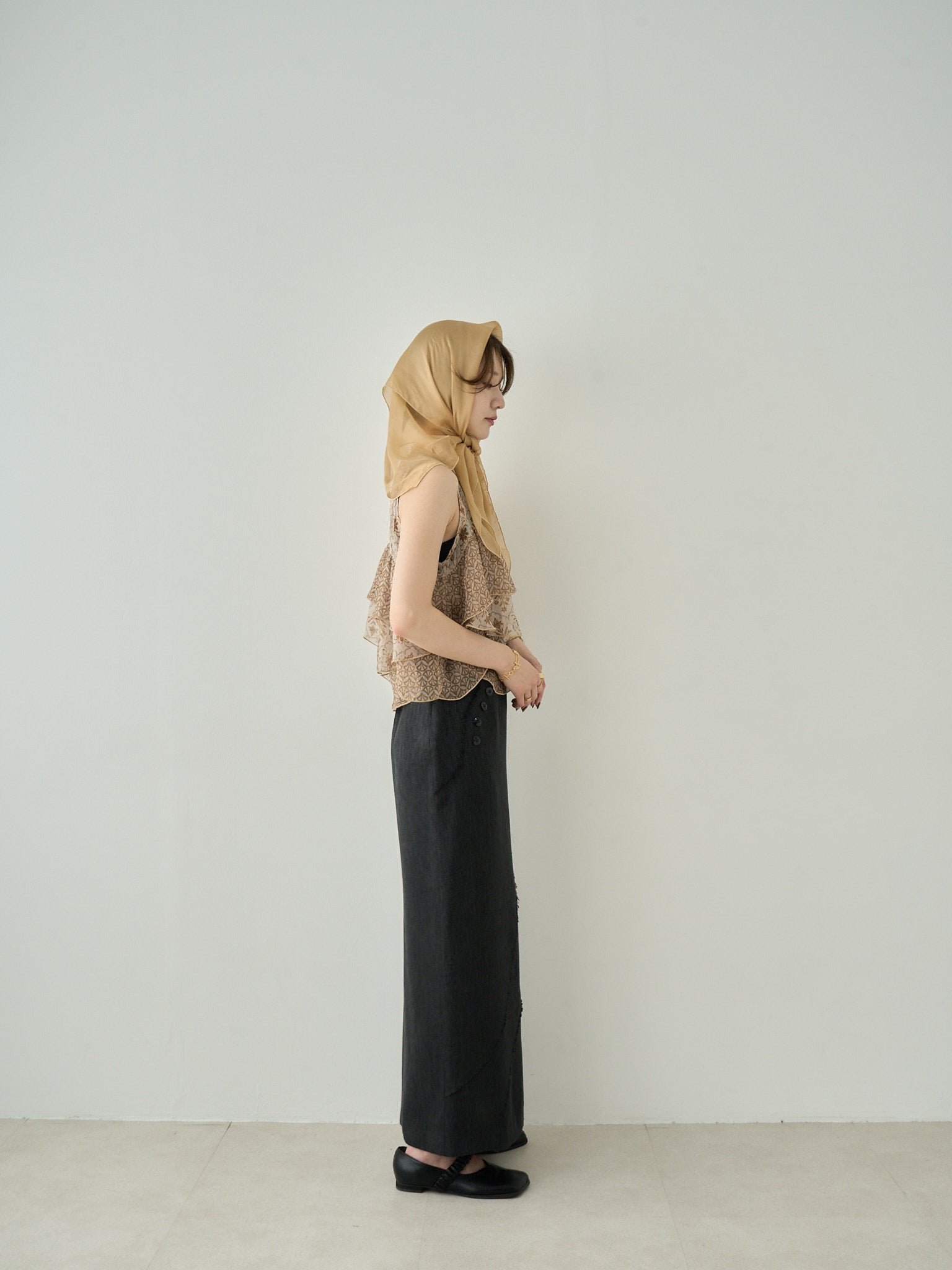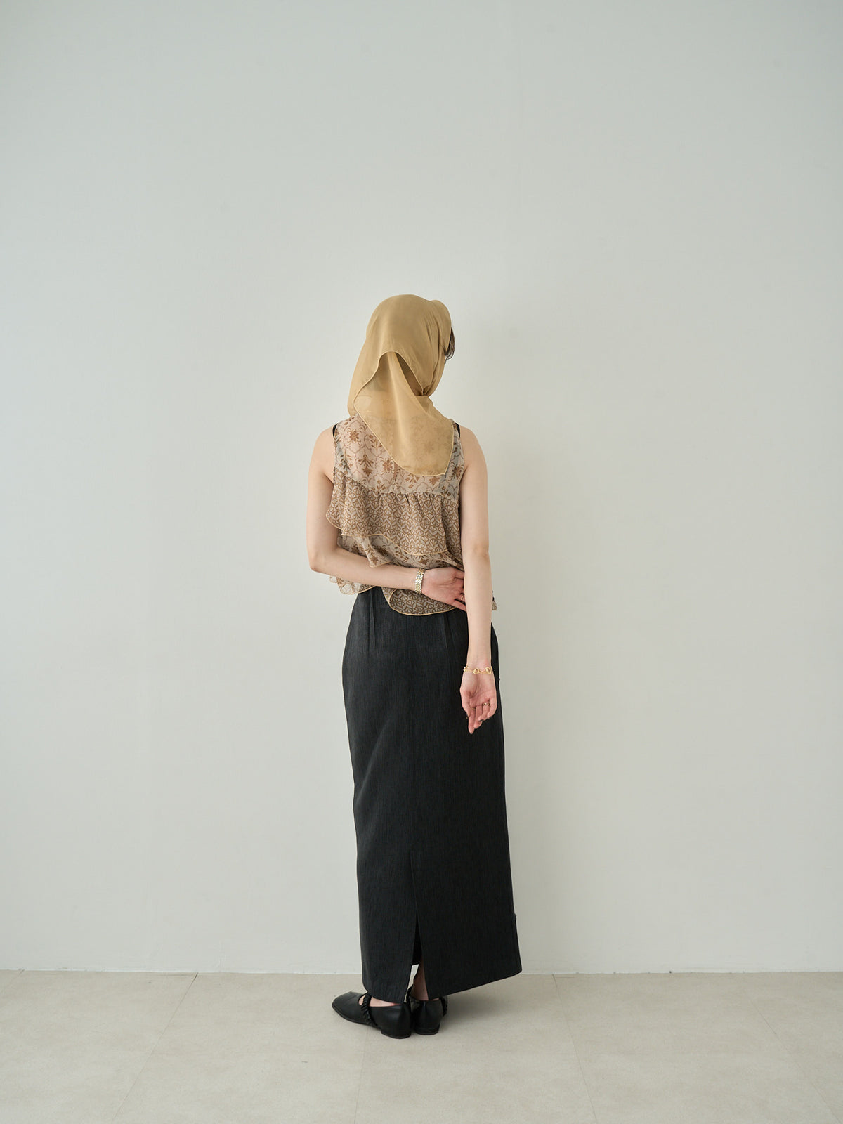 クラシカルとモダンが交差する、スカーフスタイル。繊細なデザイントップスとウェーブラインが印象的なスカートの組み合わせに、スカーフをターバン風に巻いてアクセントに。ヴィンテージライクな品のあるムードを引き立てています。