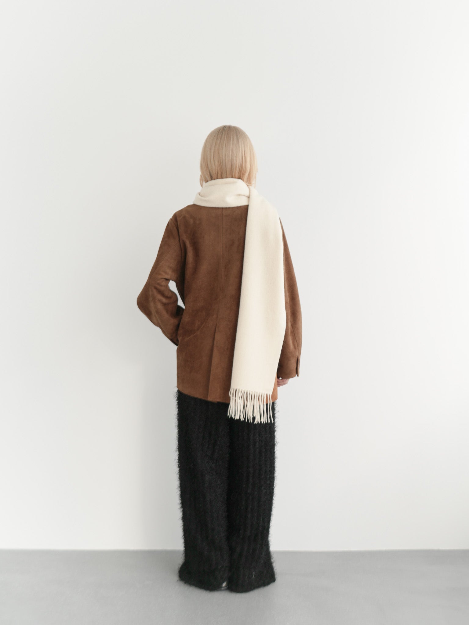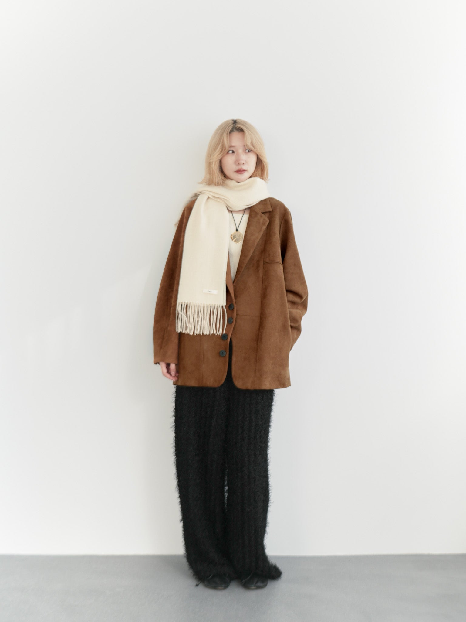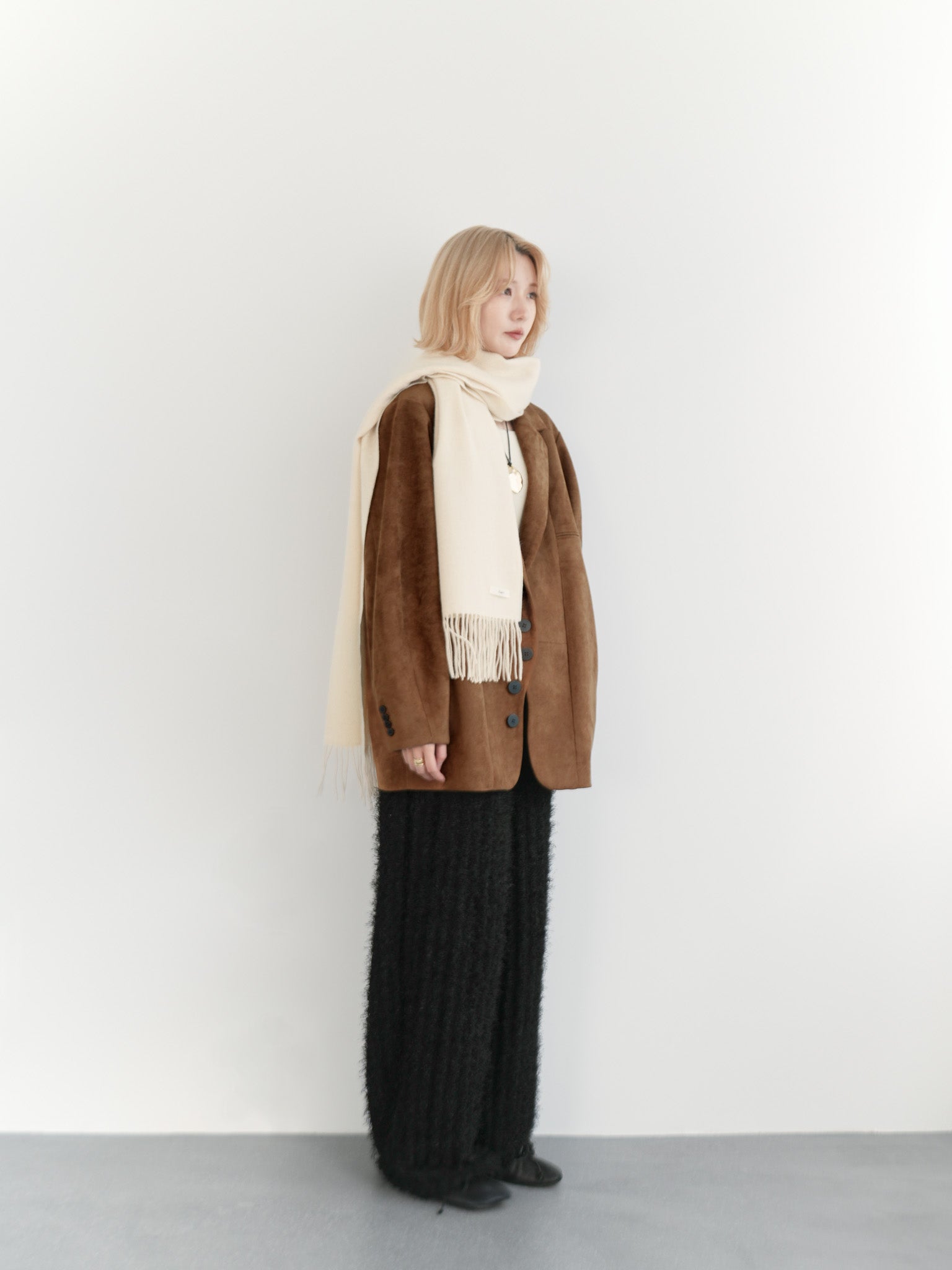 ふんわりとしたアイボリーマフラーを加え、柔らかい光を差し込んだようなニュアンスを演出。ジャケットのカラーとの相性がよく、ブラックパンツの重さを軽やかに中和してくれます。素材のレイヤードを楽しむ、冬らしい温度感のあるスタイルです。