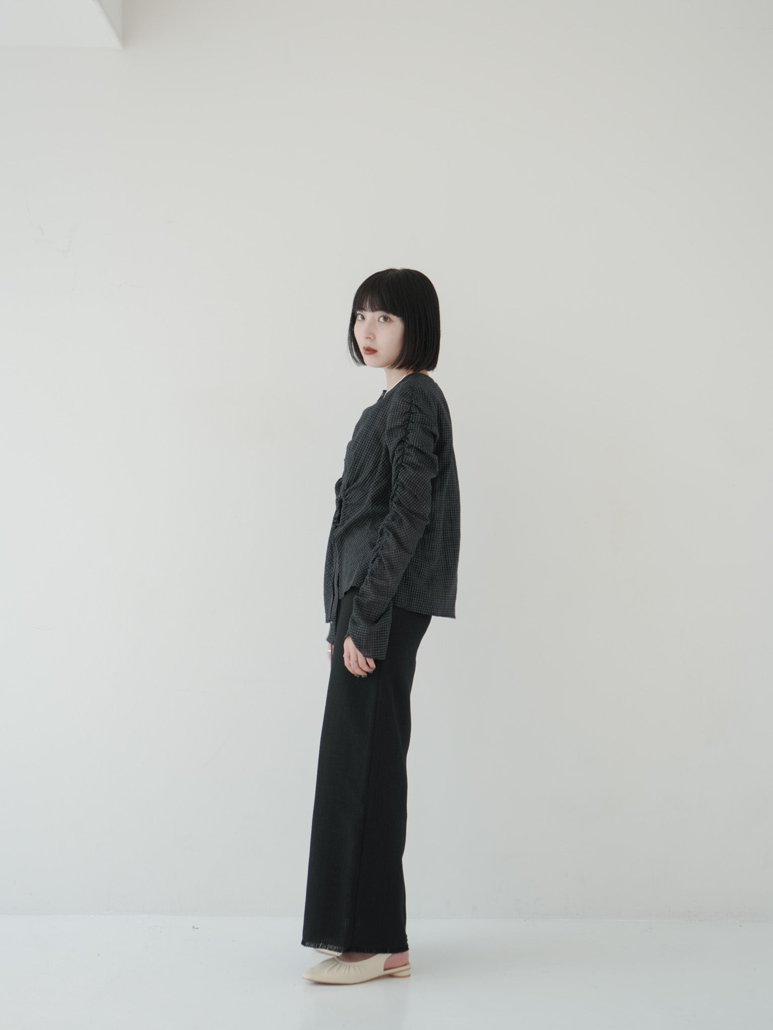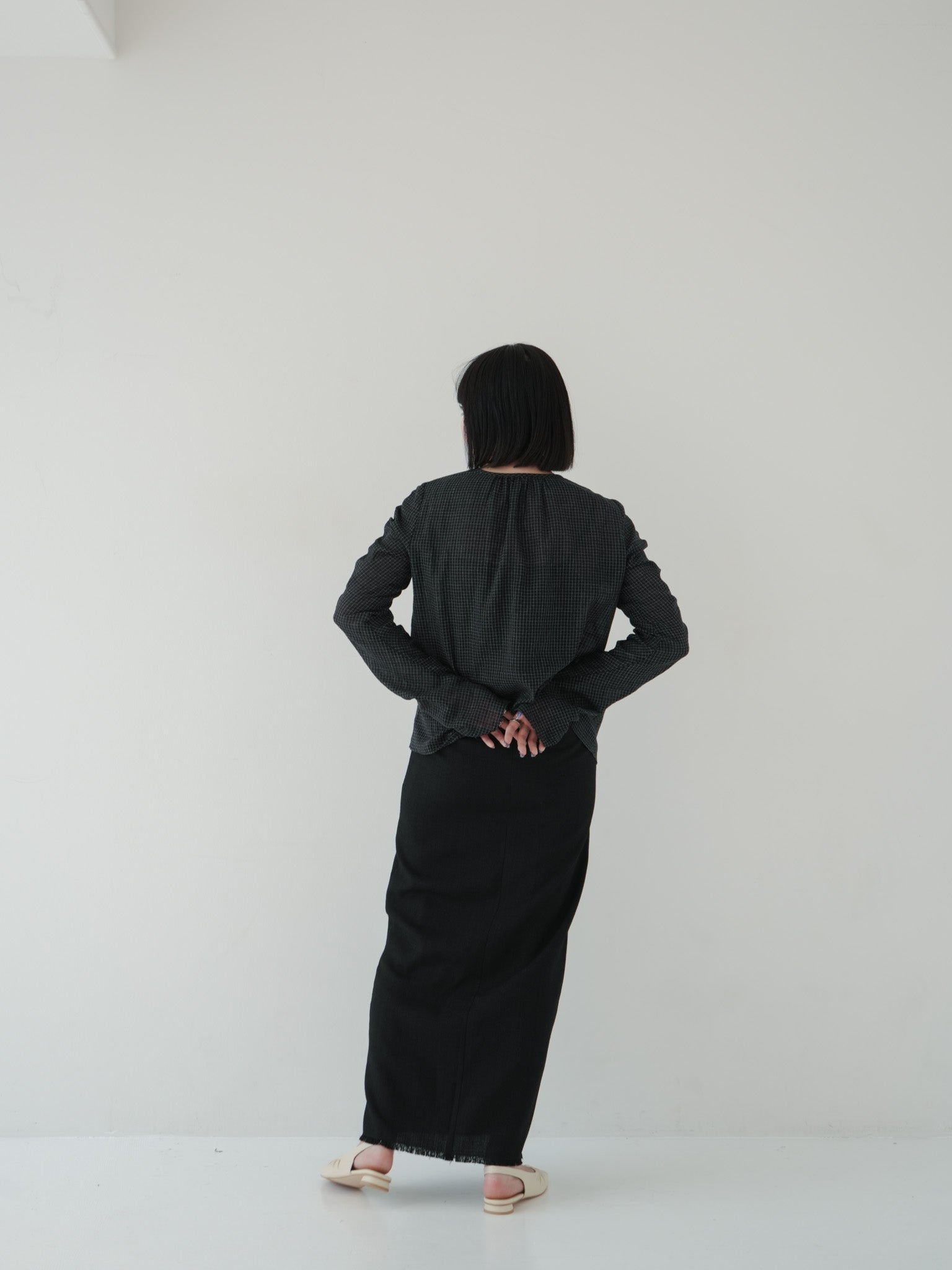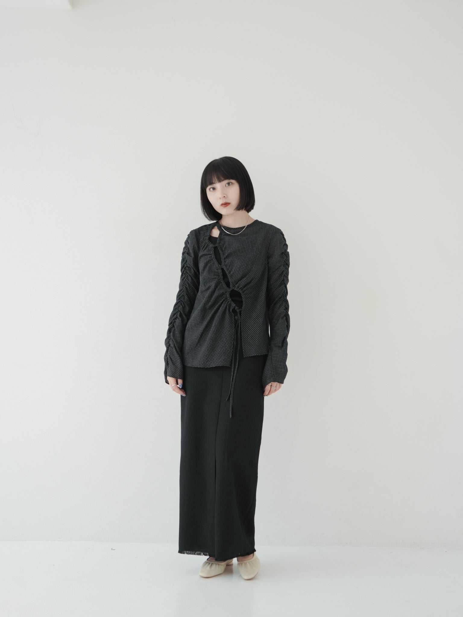 チェック柄のトップスを大胆にカットアウトし、ドローストリングでシルエットを変化させたモードな一着。直線的なスカートとの組み合わせで、洗練されたシルエットを引き立てています。