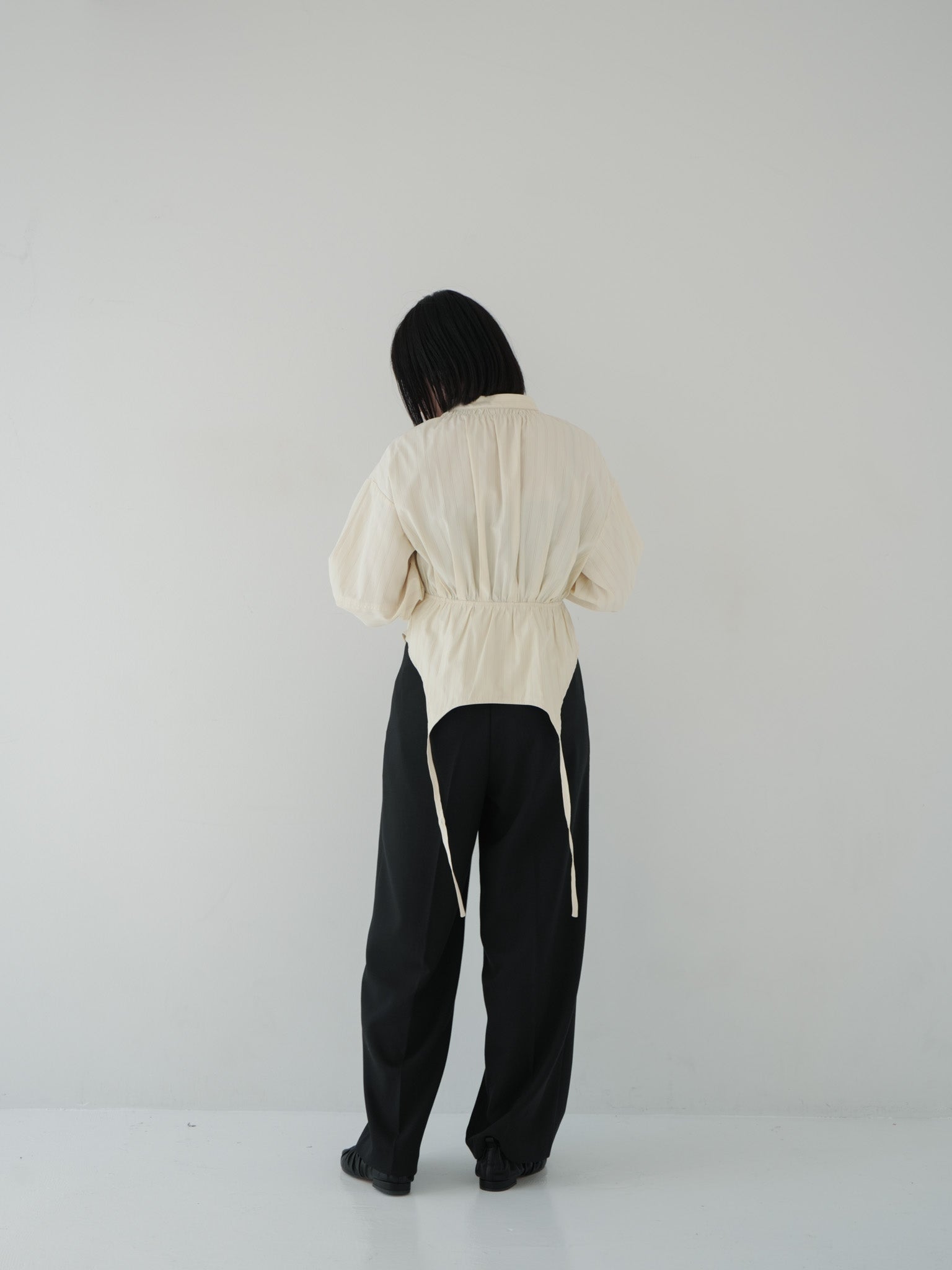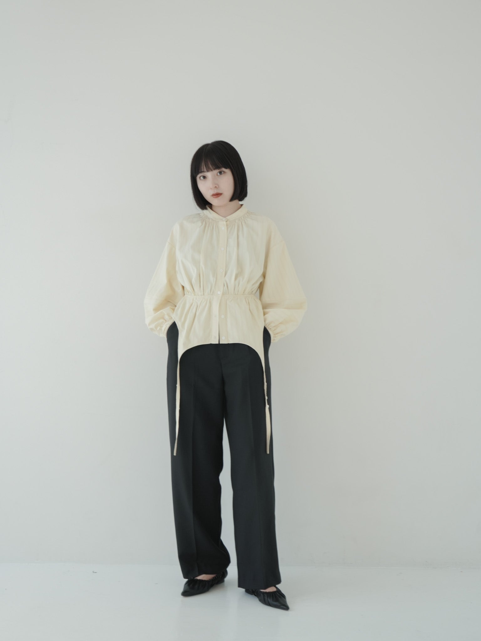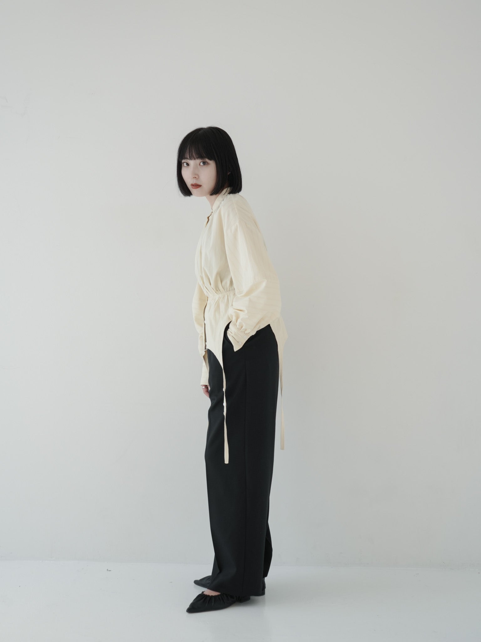 ウエストを絞ったデザインシャツが印象的なコーディネート。黒のワイドパンツを合わせることで、アイボリートーンの柔らかさを引き立てつつシャープな印象に仕上げています。