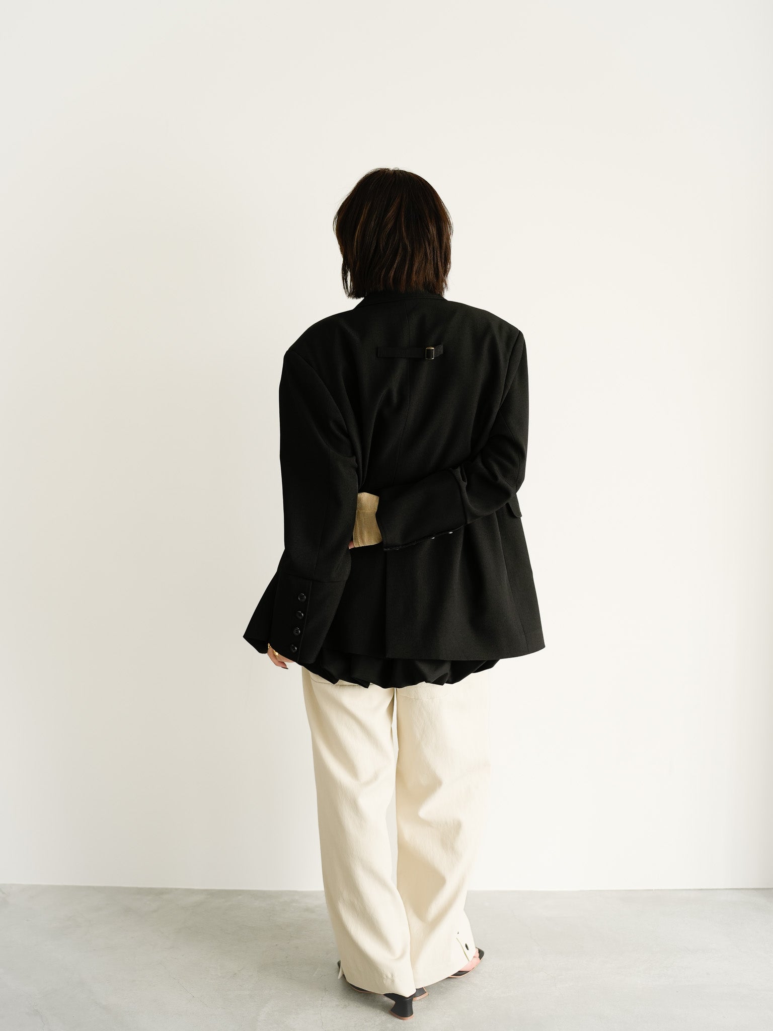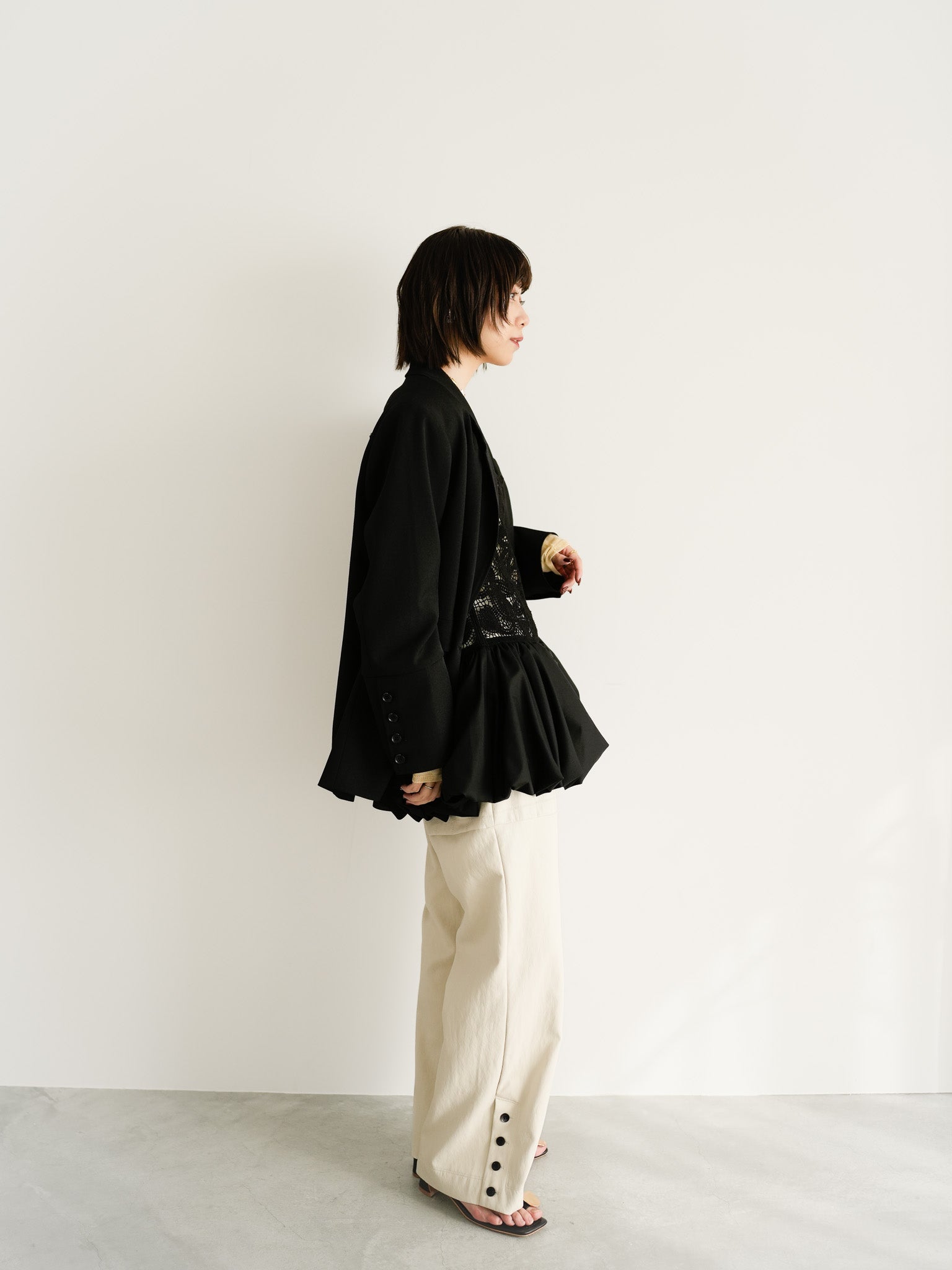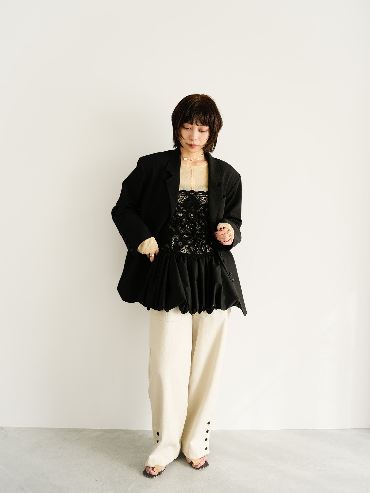 ブラックを基調に、レースの質感と立体フォルムを重ねた奥行きのあるスタイリング。ジャケットのメンズライクなシルエットが、華やかさの中に凛とした強さを添えます。