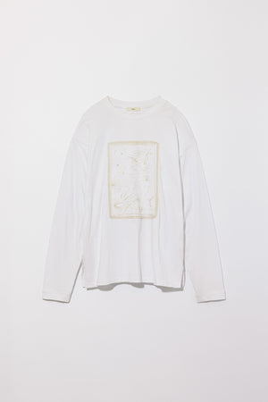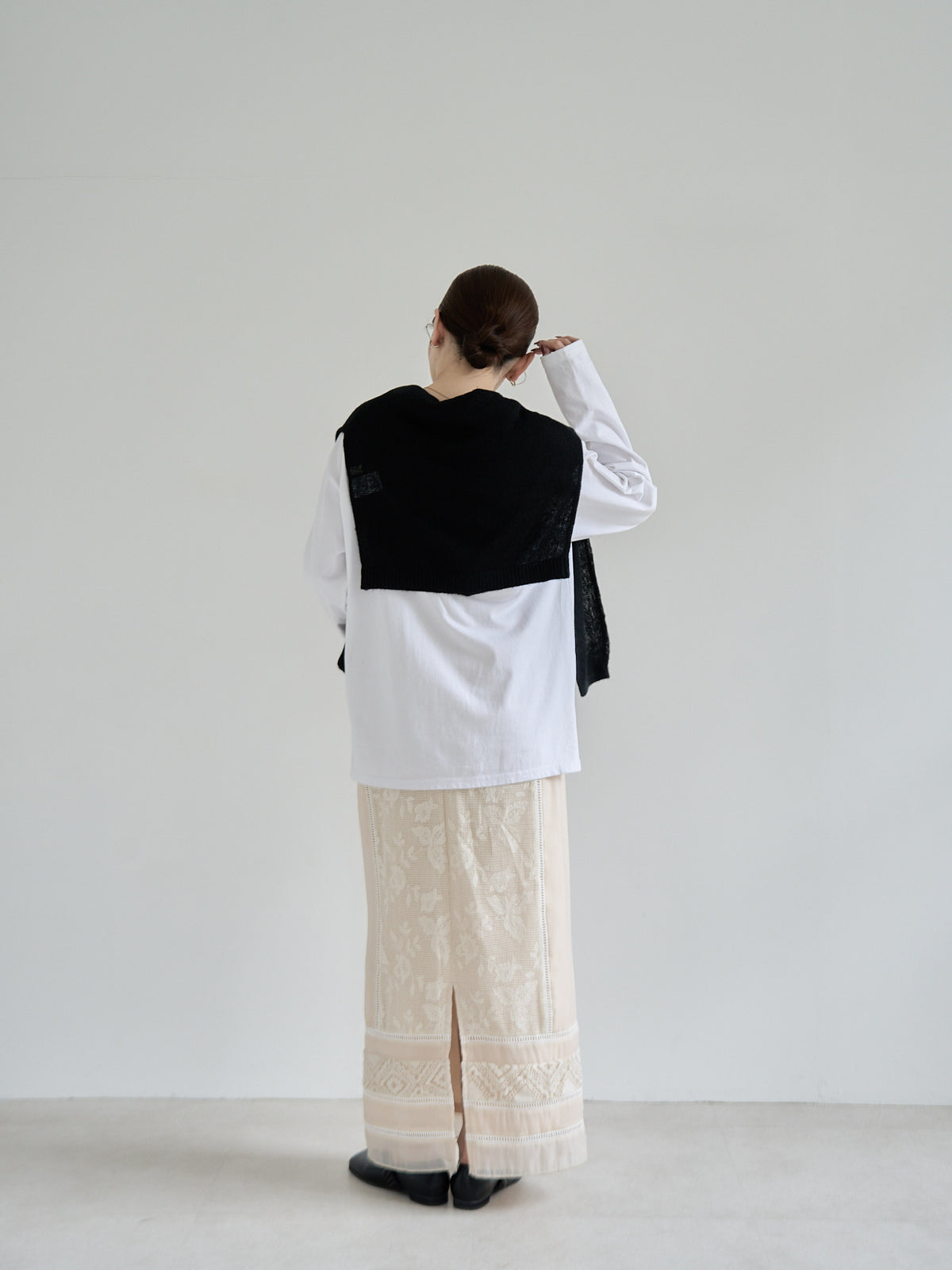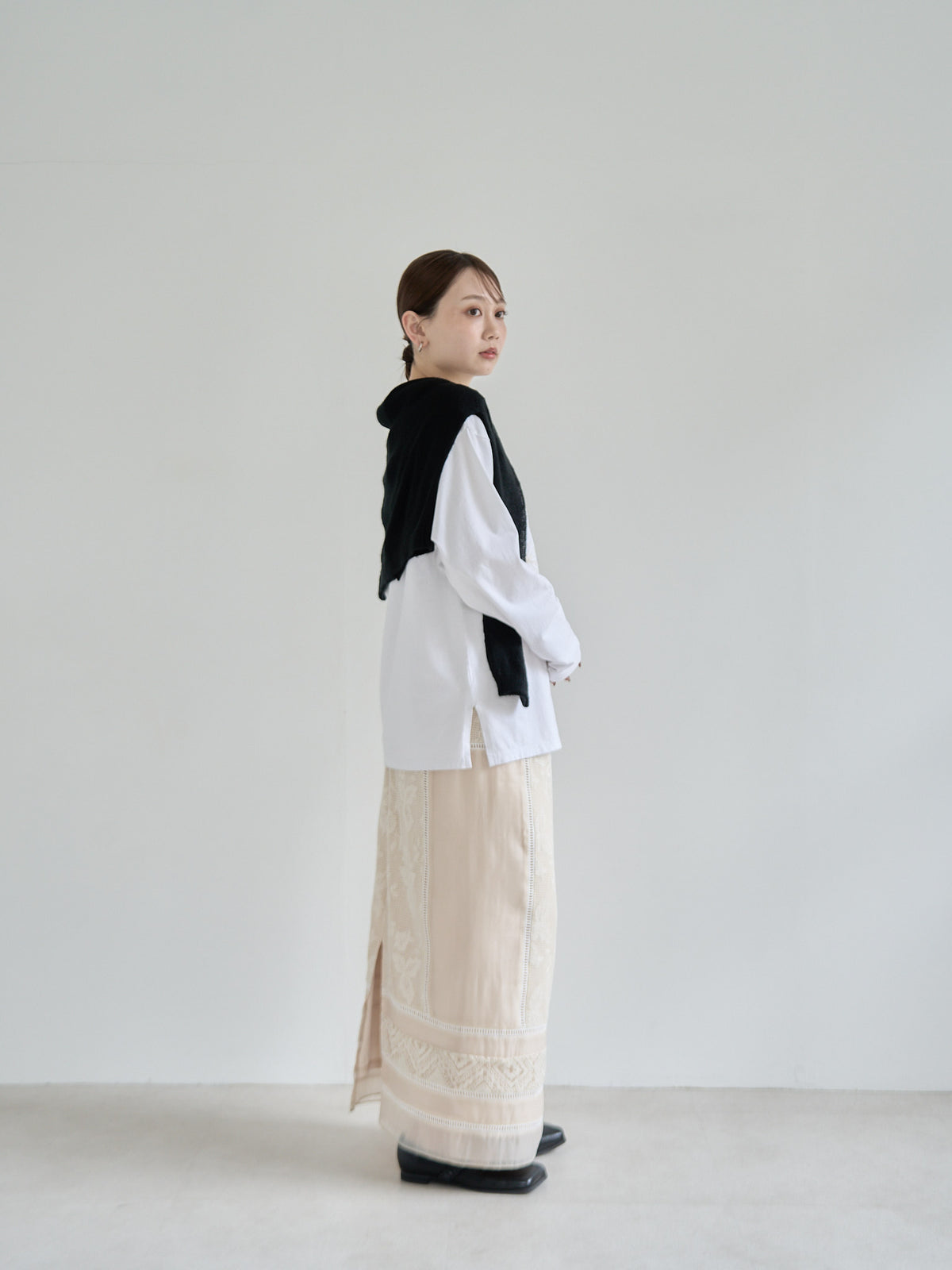 ゆったりとしたカットソーに、ヴィンテージライクな刺繍スカートを合わせたシンプルスタイル。ブラックのトップスを肩掛けし、引き締めと抜けを両立した着こなしに仕上げました。