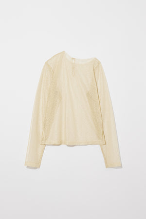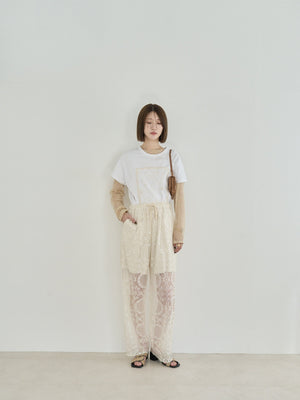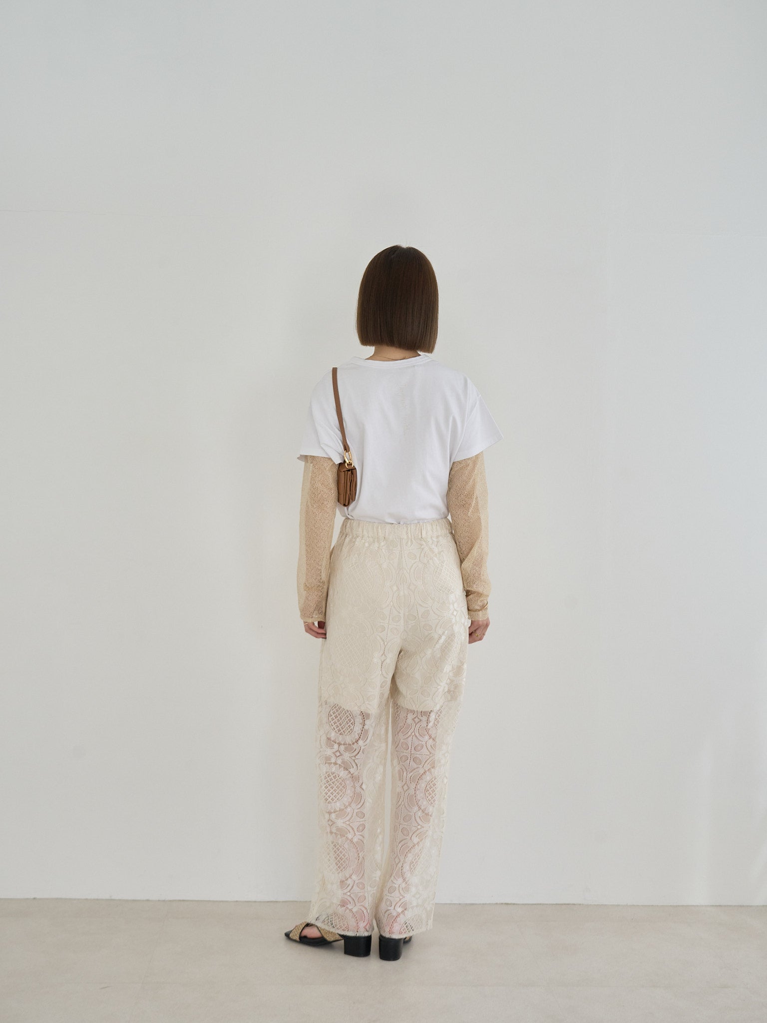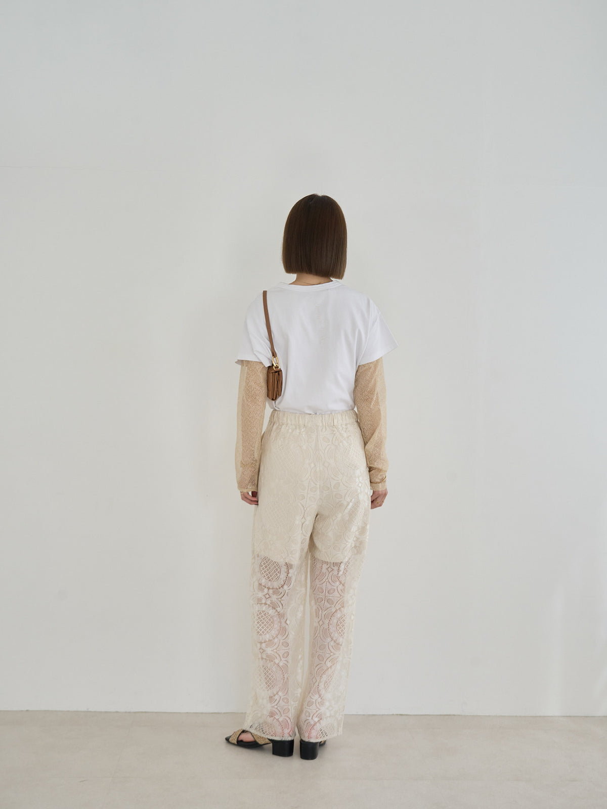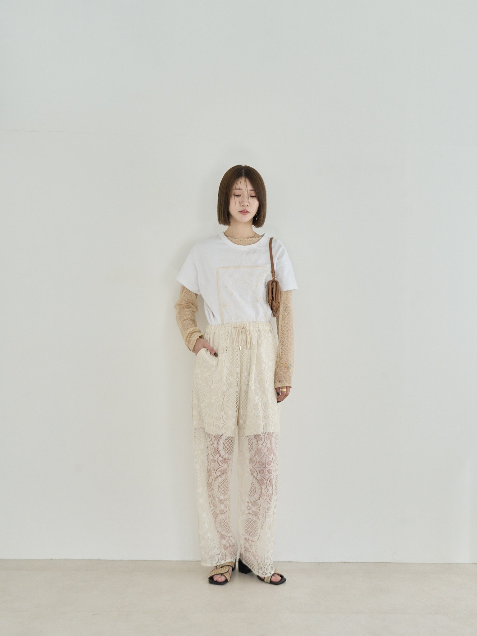 レースの透け感パンツを引き立てるように、MADE IN INDIAのトップス、さらにシアートップスをレイヤード。カジュアルさとフェミニンさを絶妙にミックスしたコーディネートです。