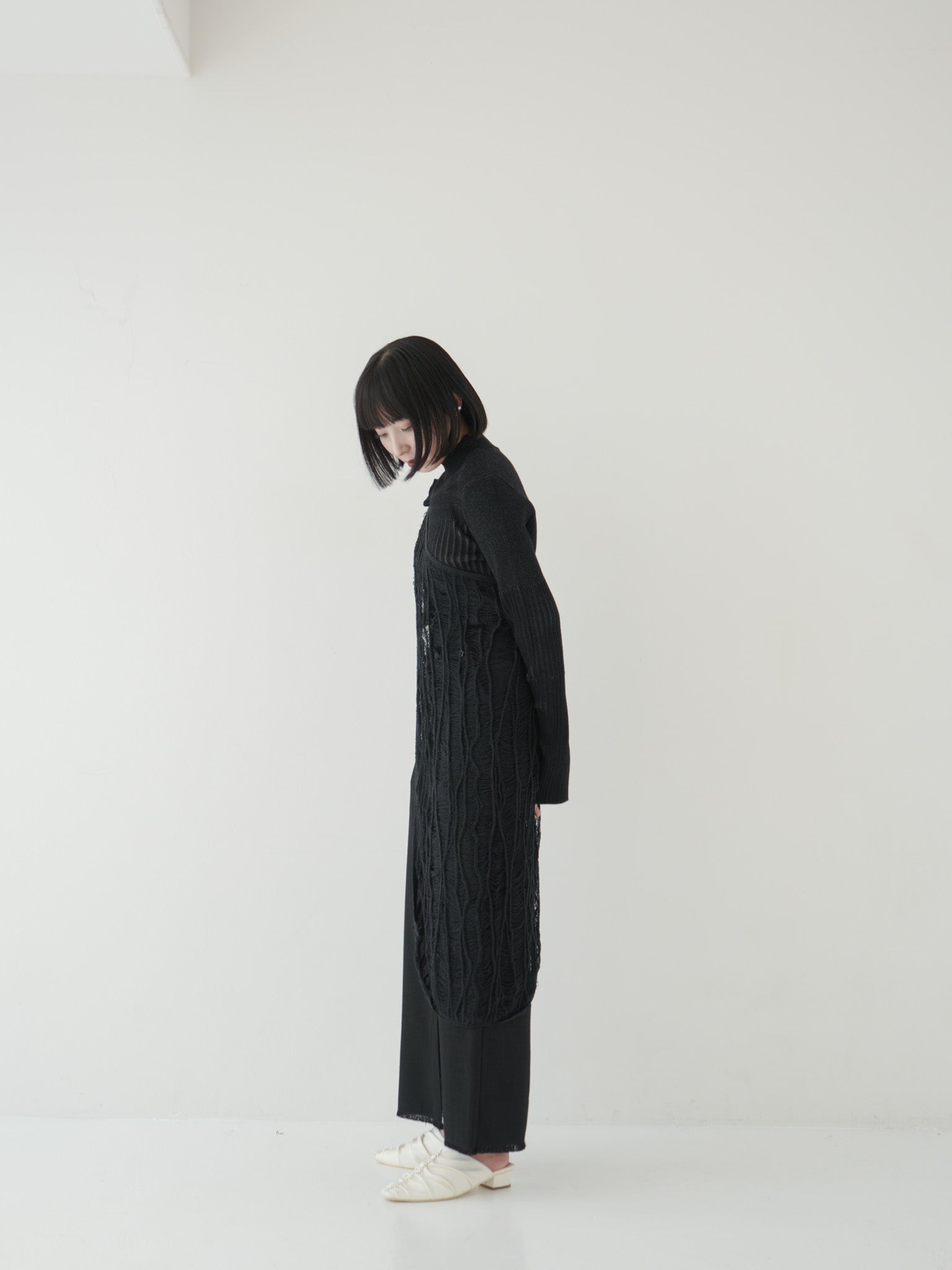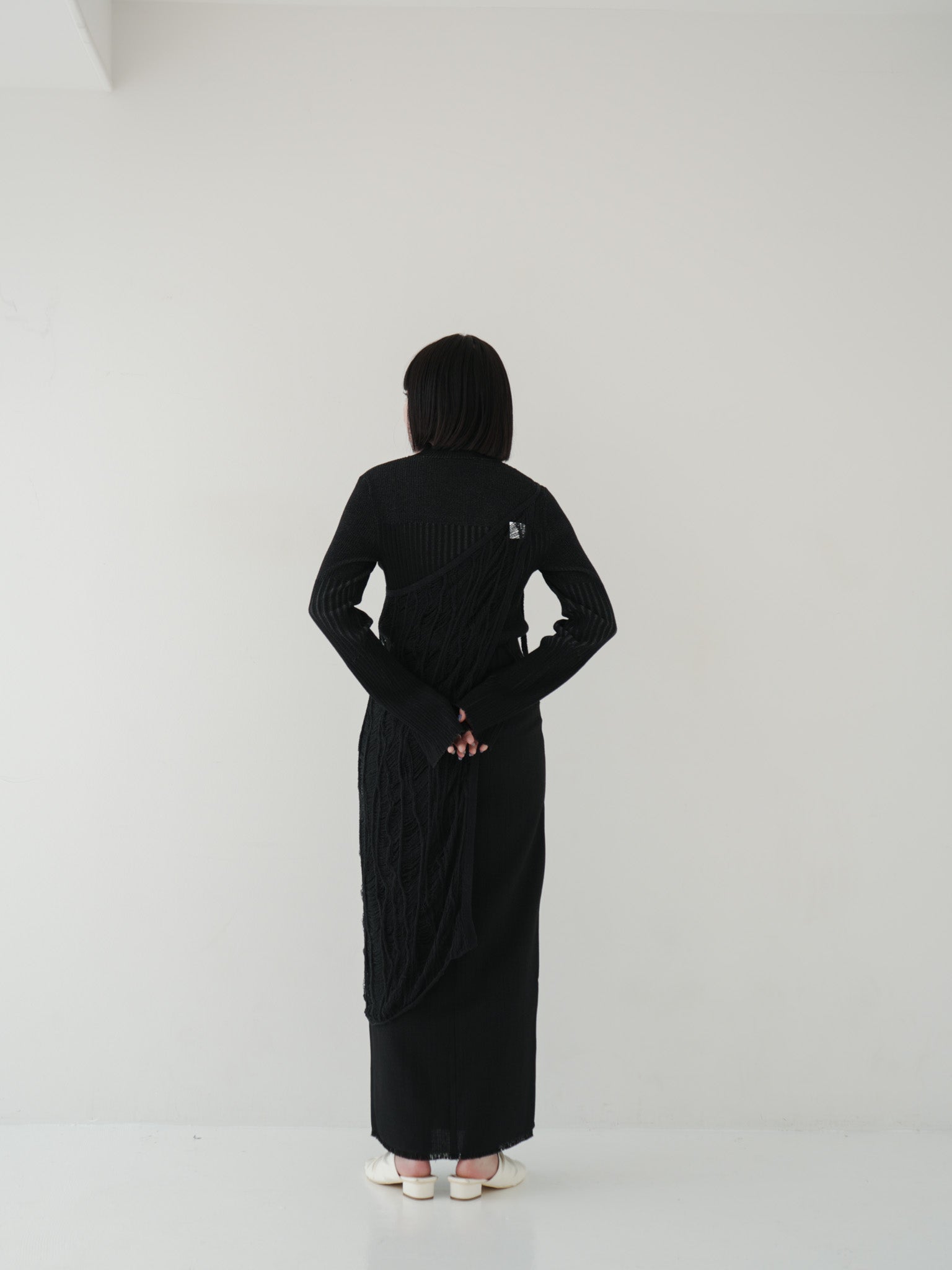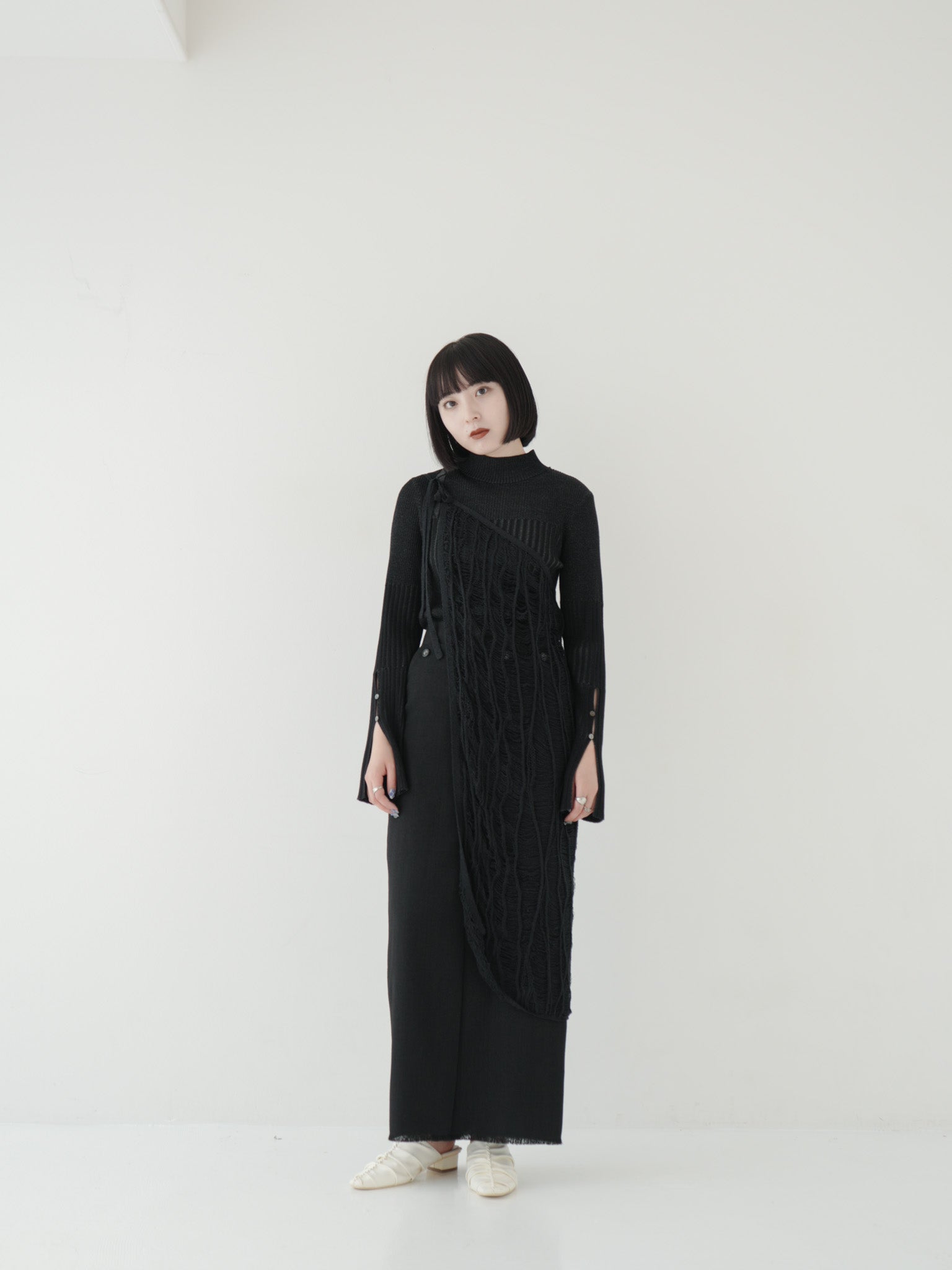ニットのアシンメトリーデザインを効かせたオールブラックコーデ。立体感のある編み地がアクセントとなり、シンプルながらも個性を際立たせるスタイルです。