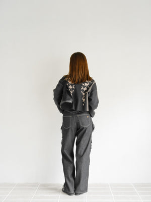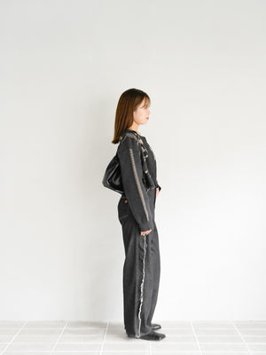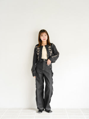 サイドにラッフルがあしらわれたデニムパンツで、王道カジュアルにひねりを効かせて。トップスの淡色とボトムのインディゴが好バランスで、柔らかさと強さが共存するコーデです。