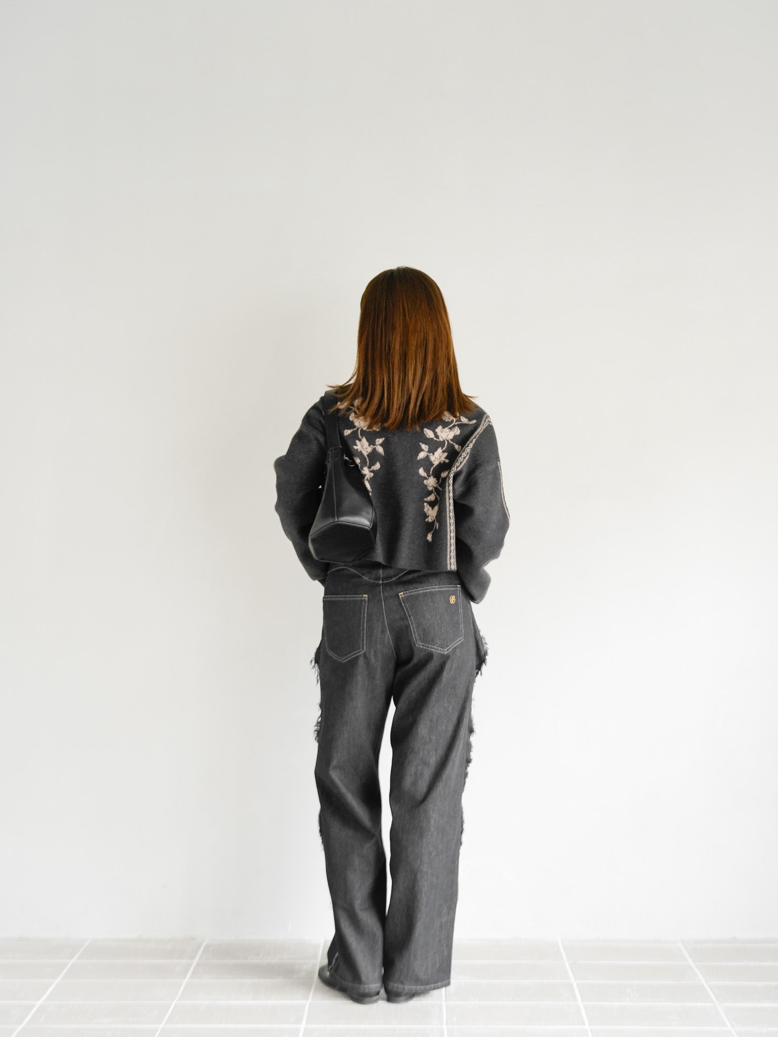 繊細な花柄が施されたショートカーディガンが印象的なヴィンテージムード漂うスタイル。