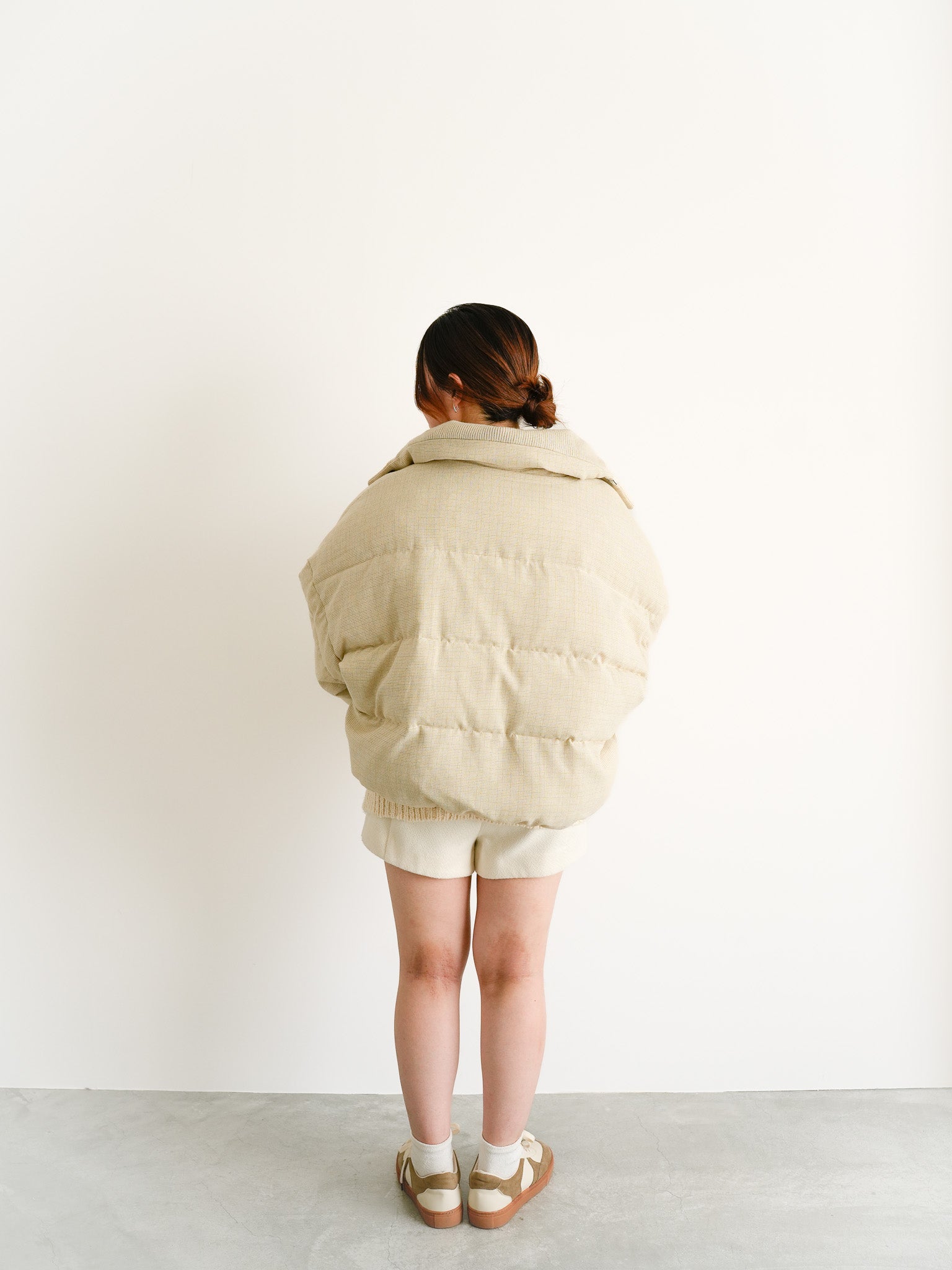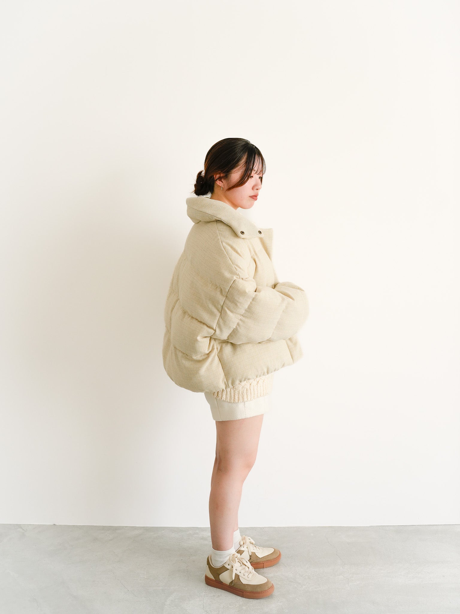ボリュームのあるダウンジャケットにショートパンツを合わせた、冬のバランスコーデ。アイボリーのワントーンでまとめ、軽やかさと温もりが共存するナチュラルな印象に仕上げました。