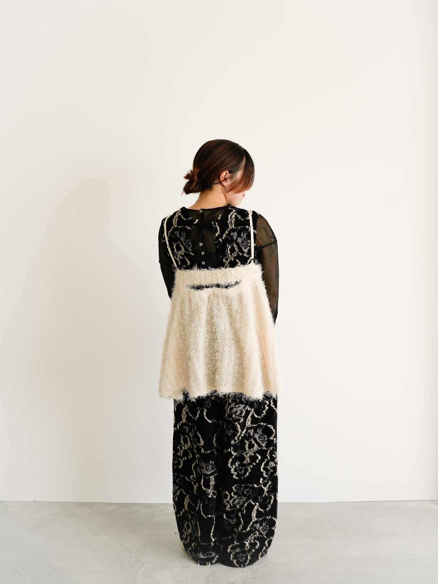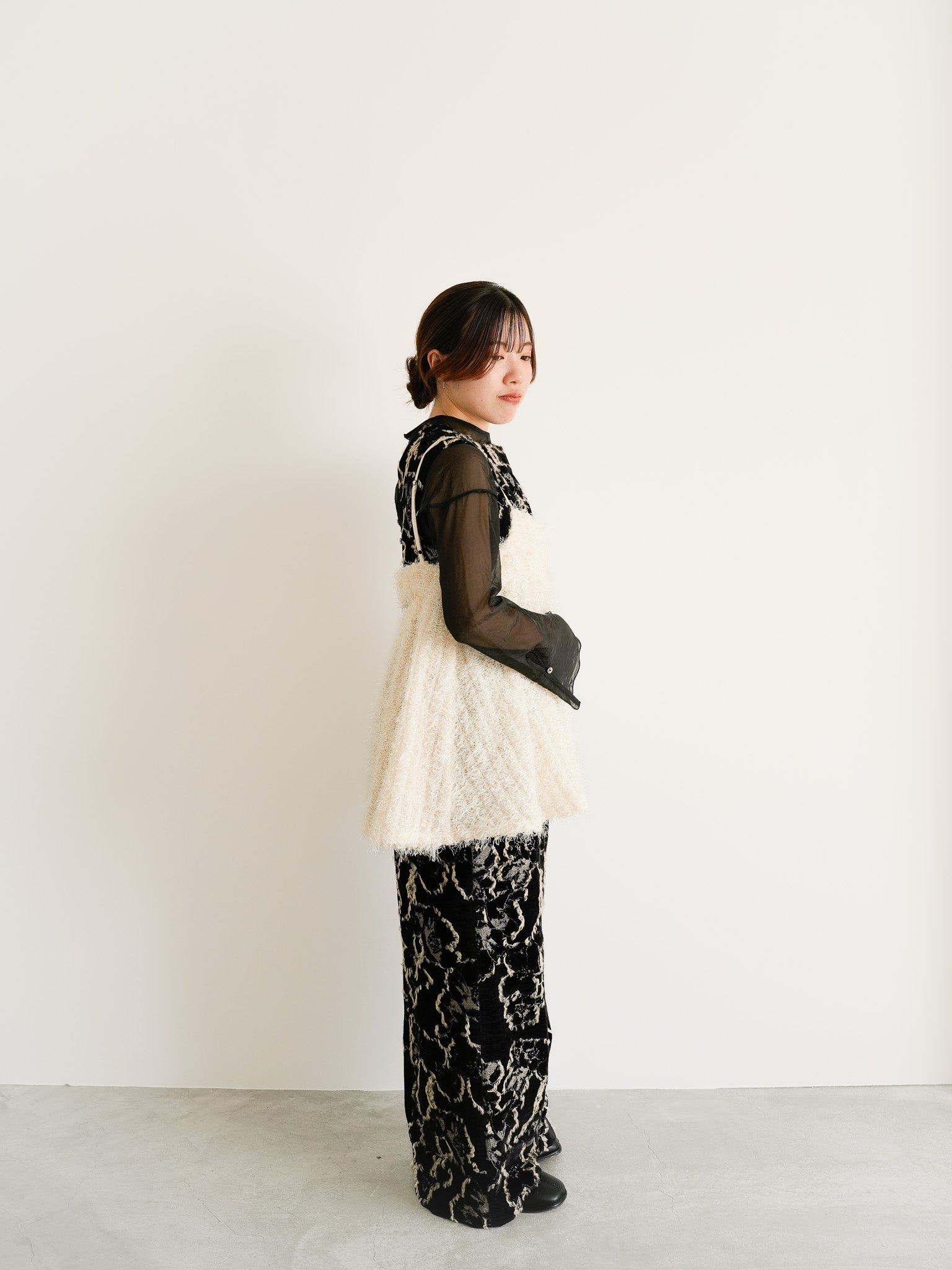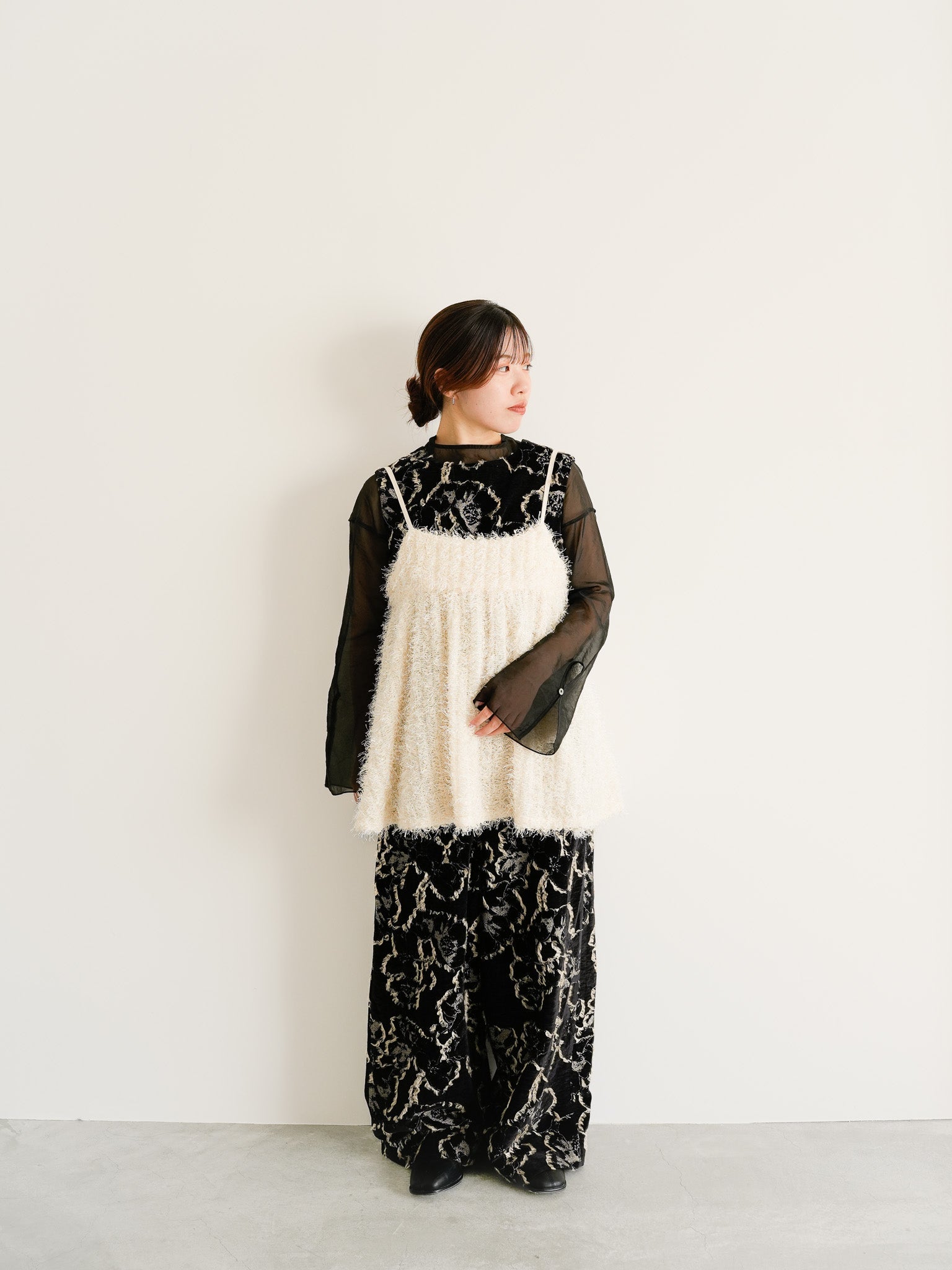 オールインワンにふわりと広がるファーキャミを重ね、繊細な柄が奥行きをプラス。異素材のコントラストが際立つ、エフォートレスで印象的なコーディネートです。