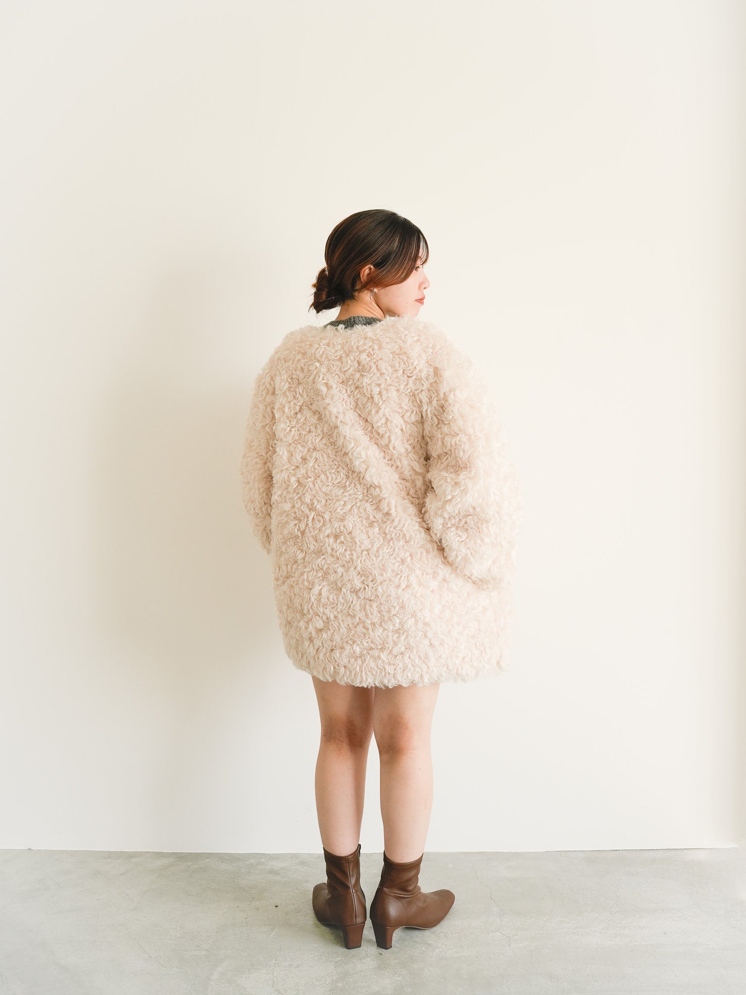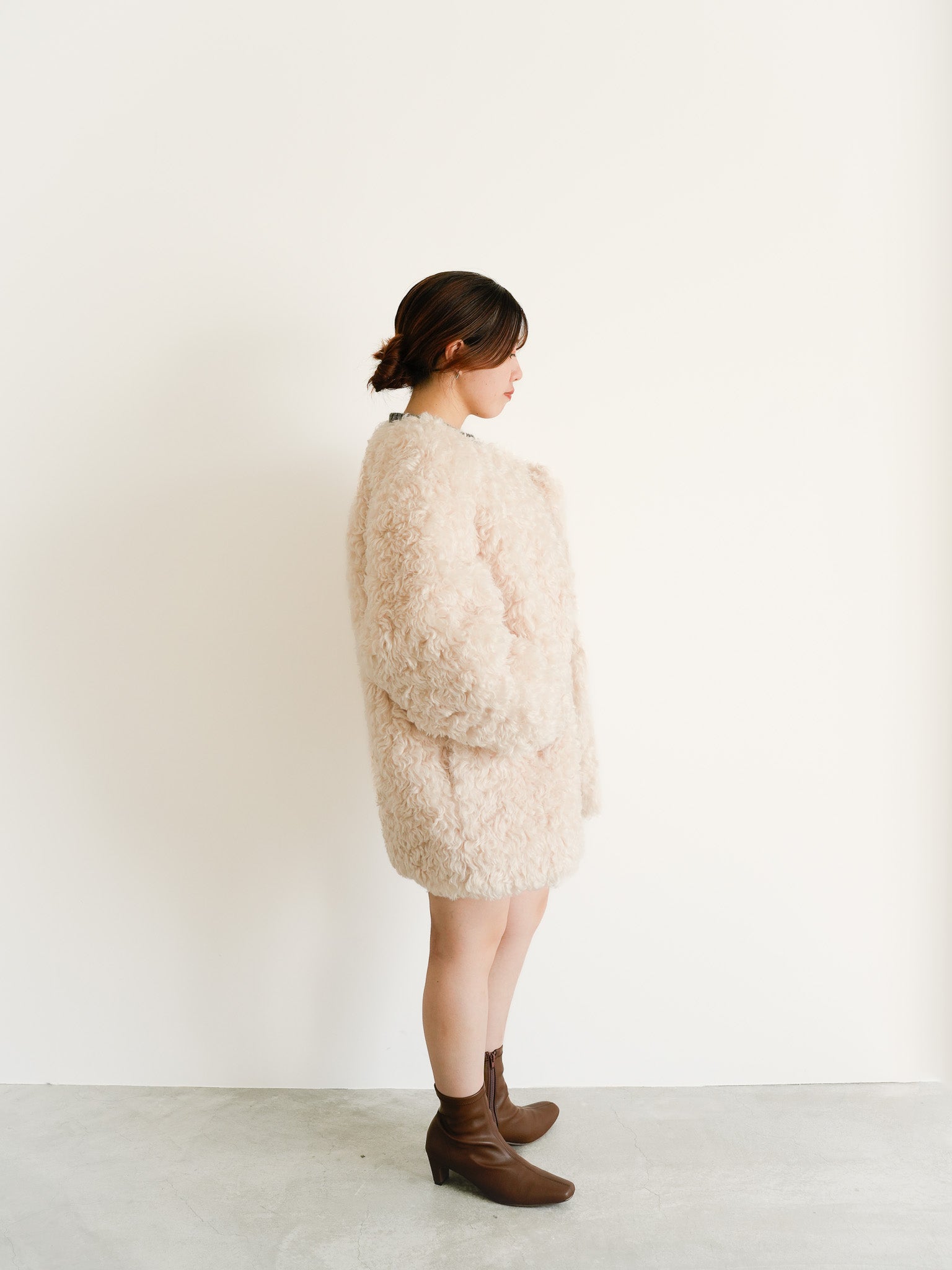 存在感のあるファーコートを主役に、ブラウンのショートパンツでトーンを統一。異素材の重なりが生む奥行きで、シーズンムードを深く引き立てるスタイルです。