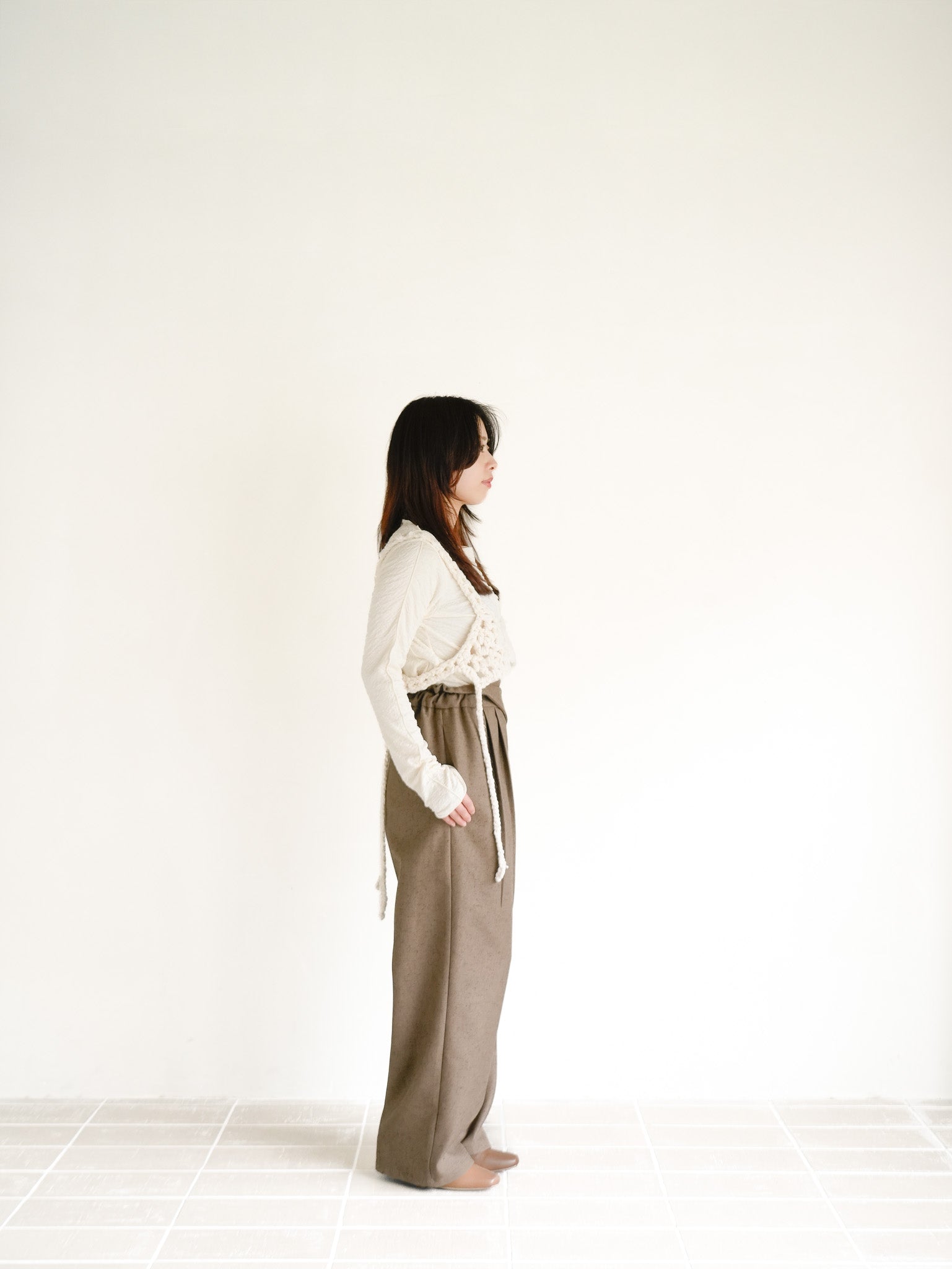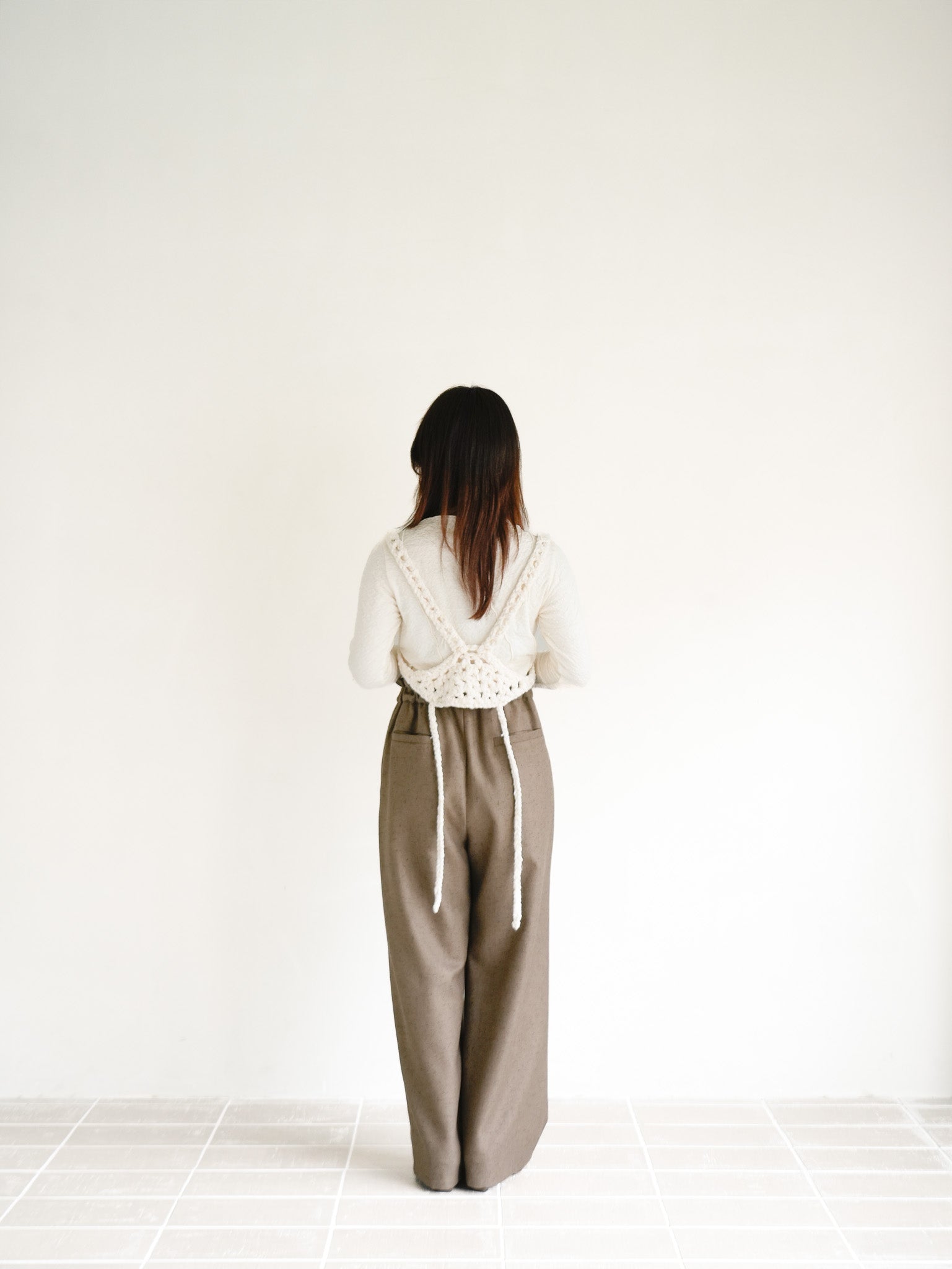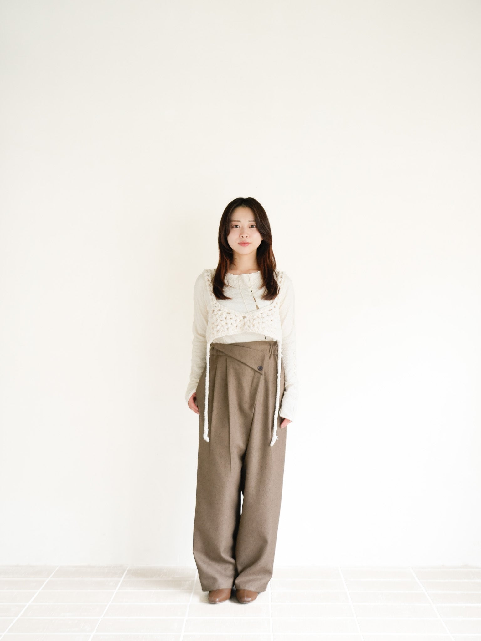 柔らかな手編みビスチェを主役に、深みのあるブラウンのラップパンツを合わせたナチュラルな装い。ニュアンスカラーで全体をまとめつつ、素材の組み合わせで静かな個性を際立たせています。