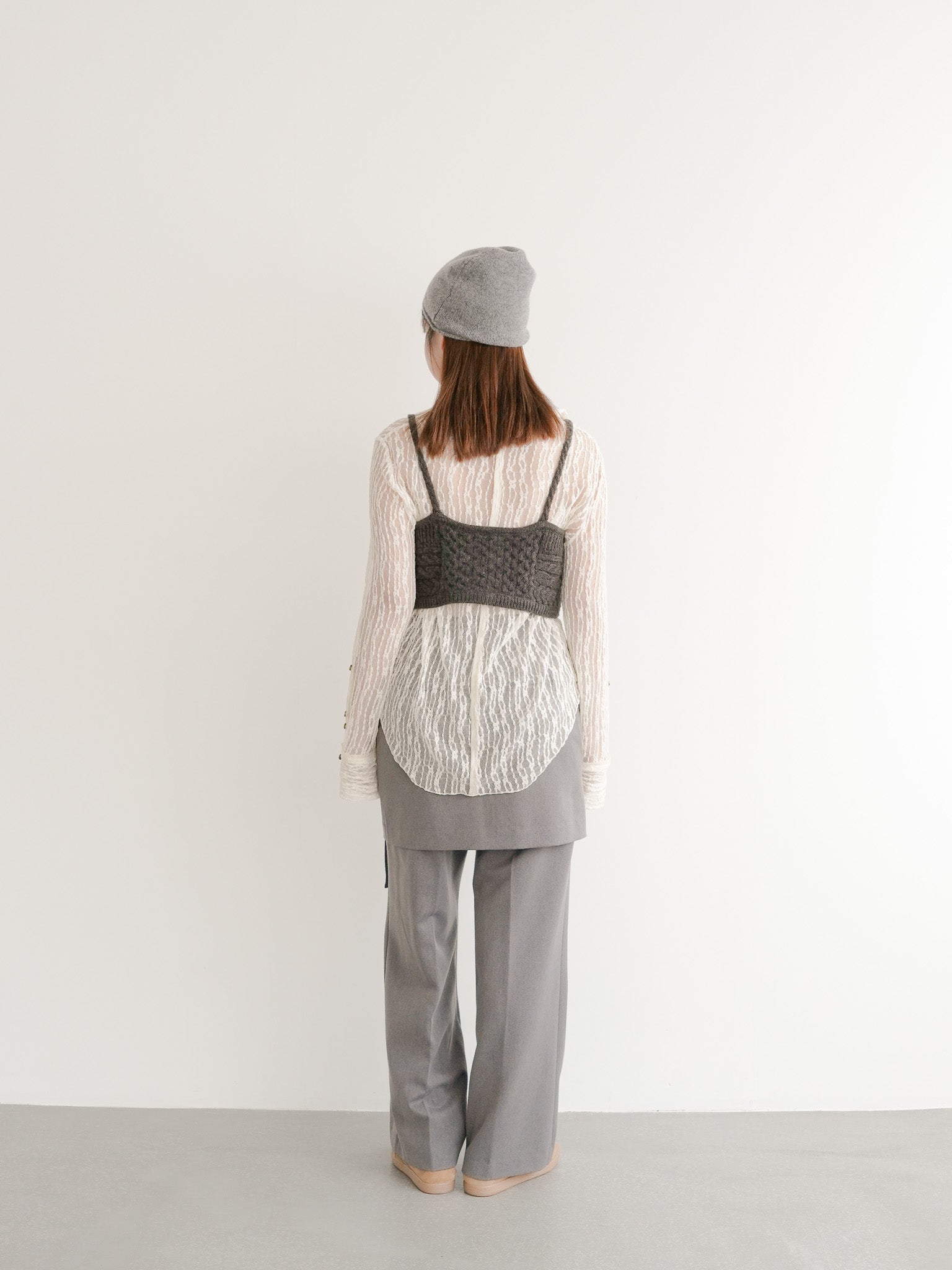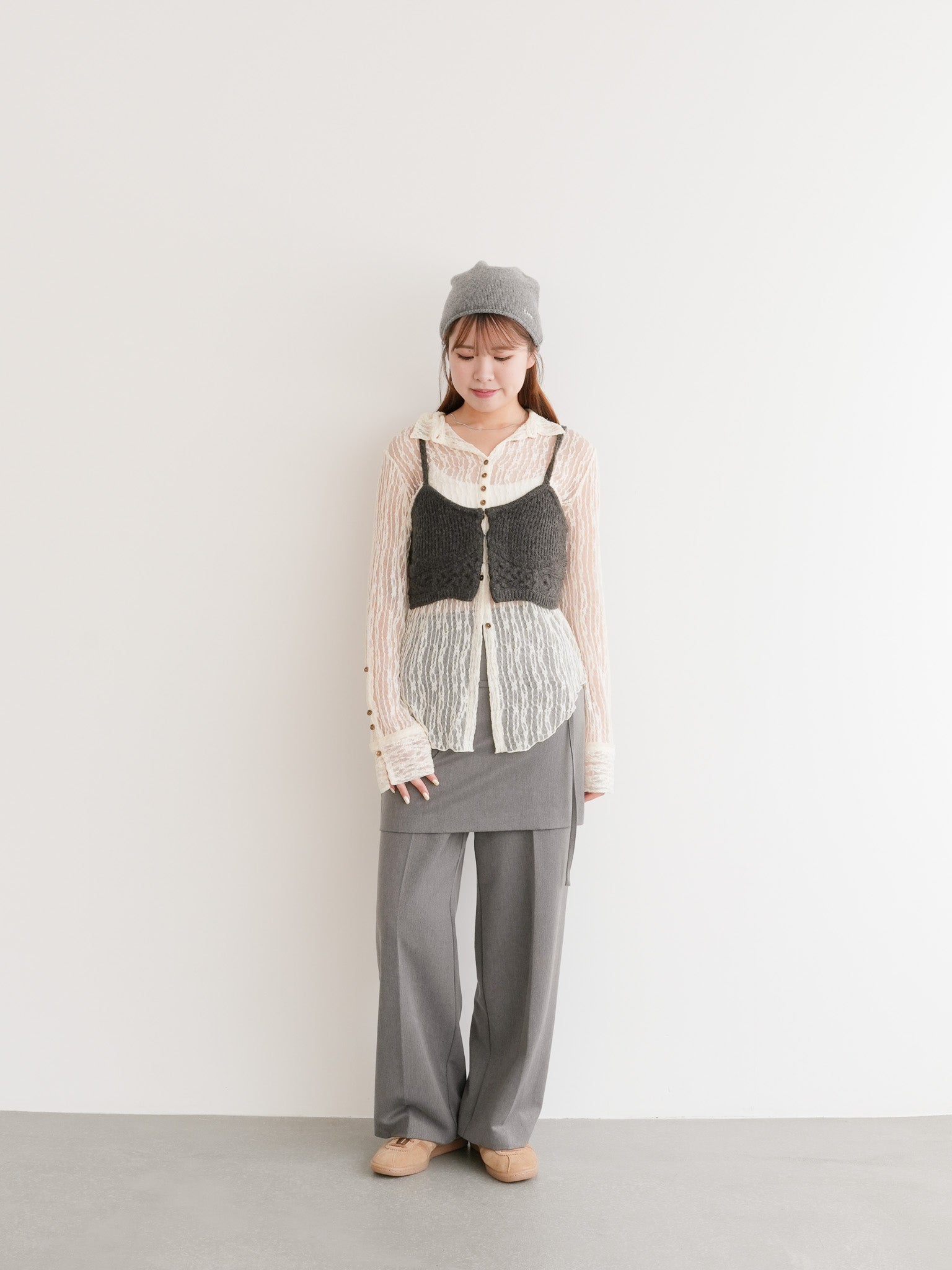 透け感のあるシアーシャツに、クロシェのビスチェを重ねた奥行きのあるスタイリング。