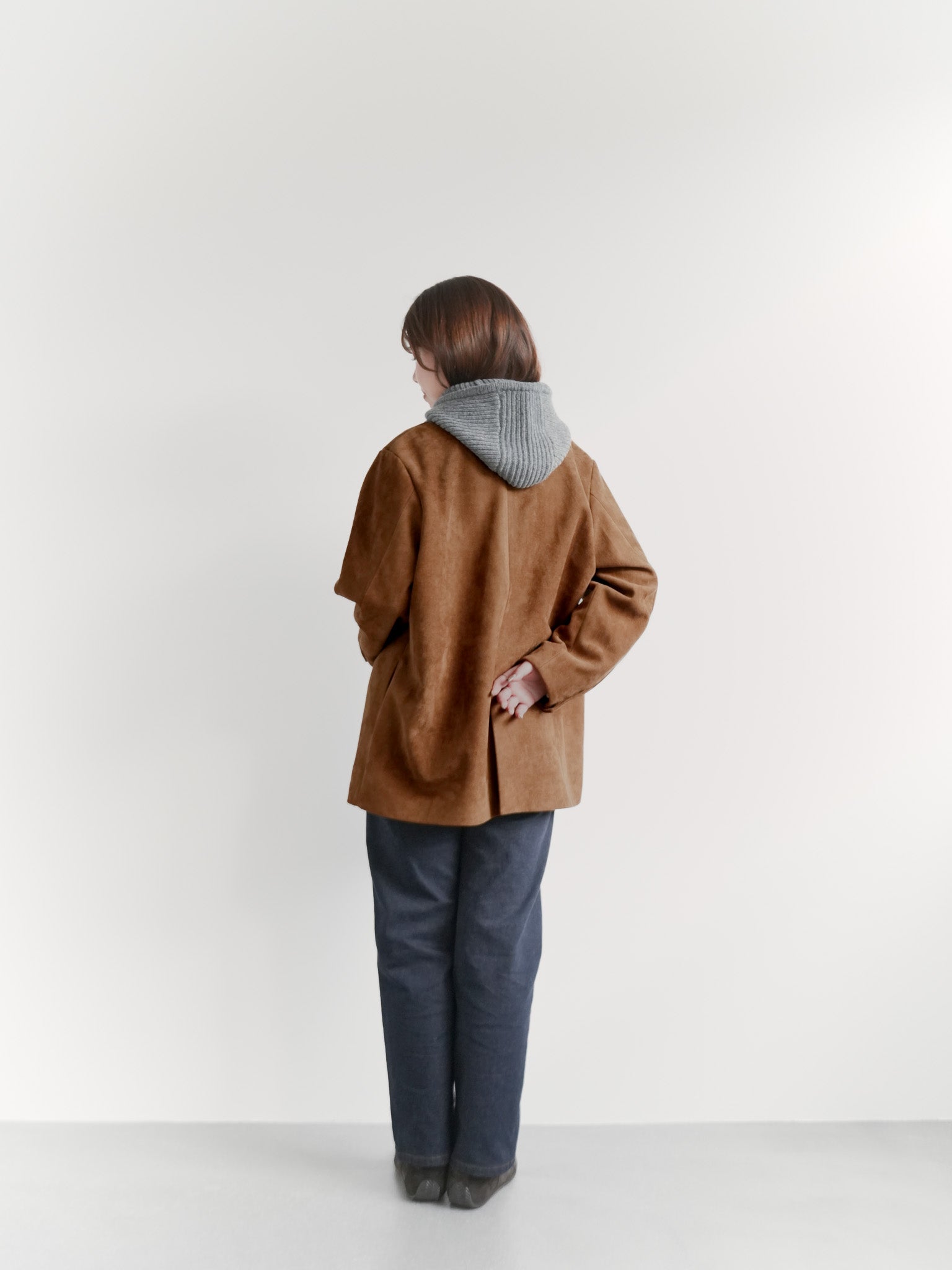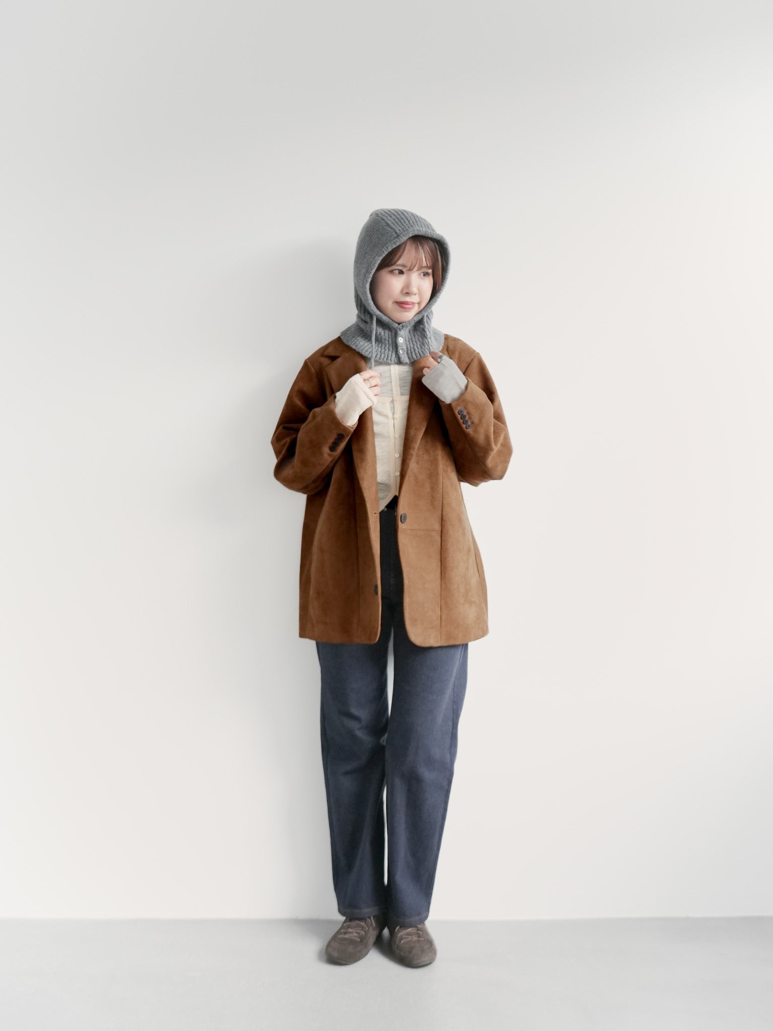 顔まわりにボリュームを出すフードニットをアクセントに、暖かみのあるブラウンジャケットで季節感をプラスしたスタイリング。