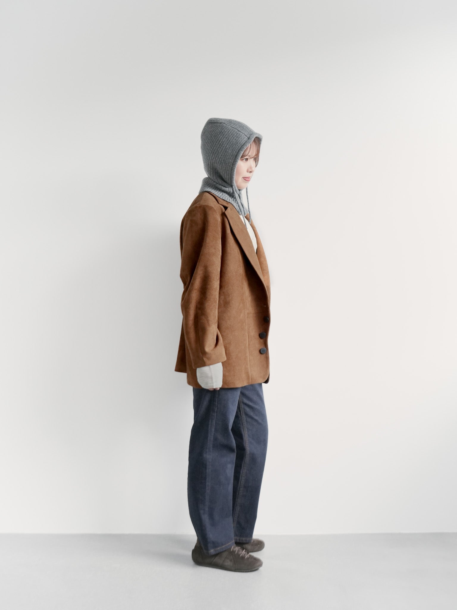 マットな質感のデニムとスウェード風のシューズで全体のトーンを落ち着かせ、柔らかいニュアンスが漂う冬のカジュアルルックに仕上げました。