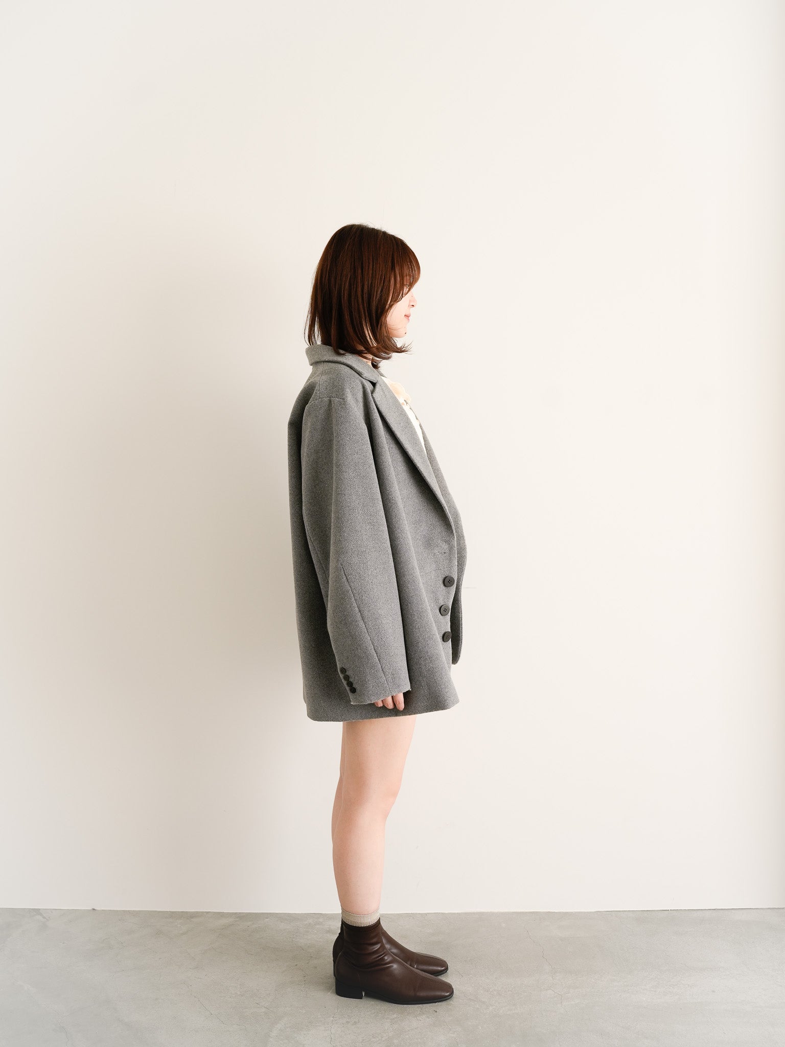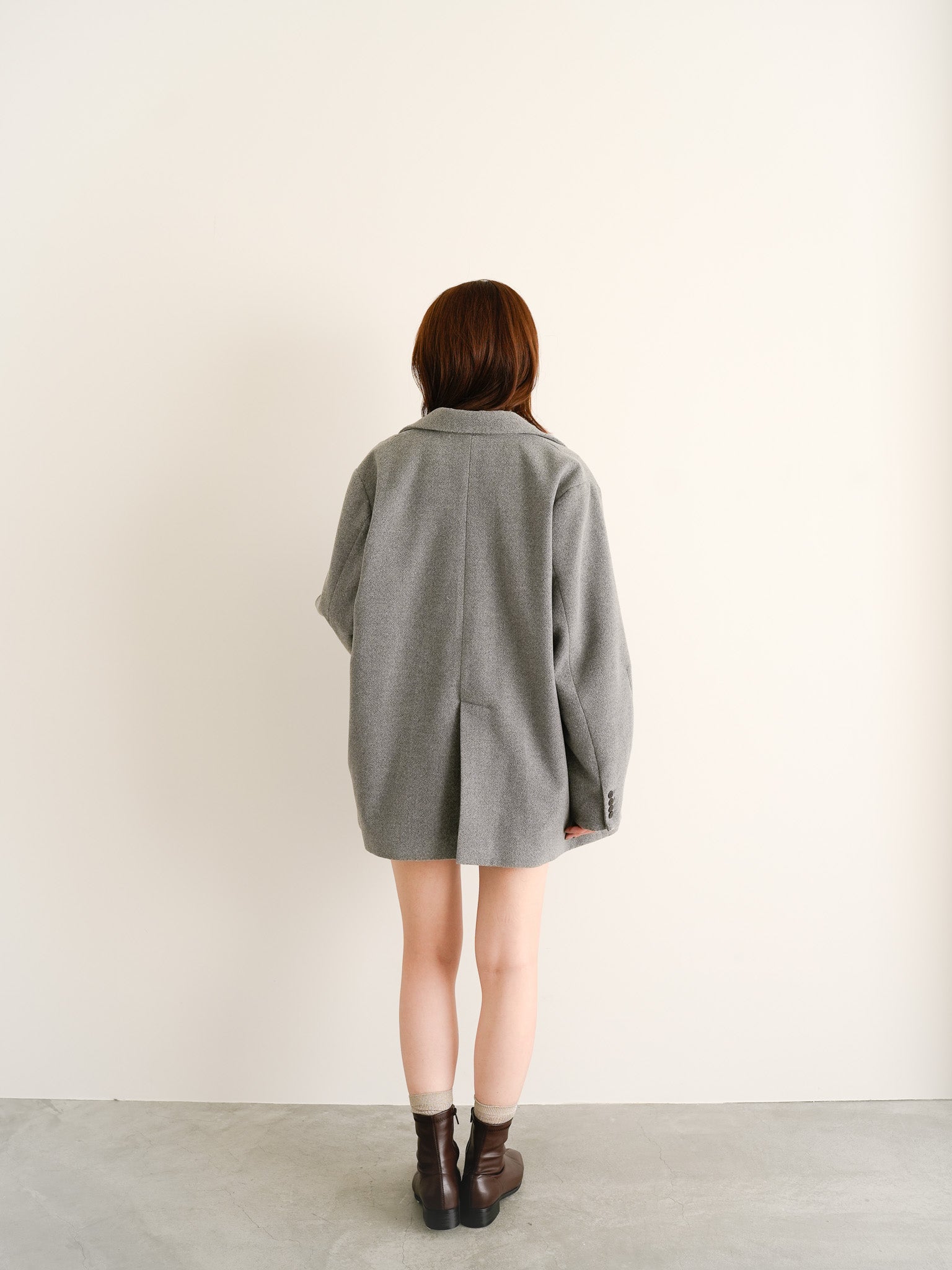 オーバーサイズのジャケットにショートパンツを合わせた、都会的なバランスコーデ。