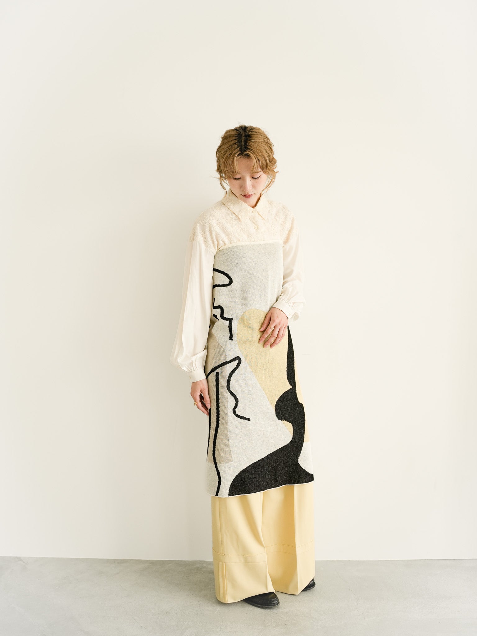 Èaphiオリジナルのアートテキスタイルが目を引くスタイル。クラシカルなブラウスを合わせることで、モダンアートとヴィンテージエレガンスが融合した印象になるよう仕上げました。