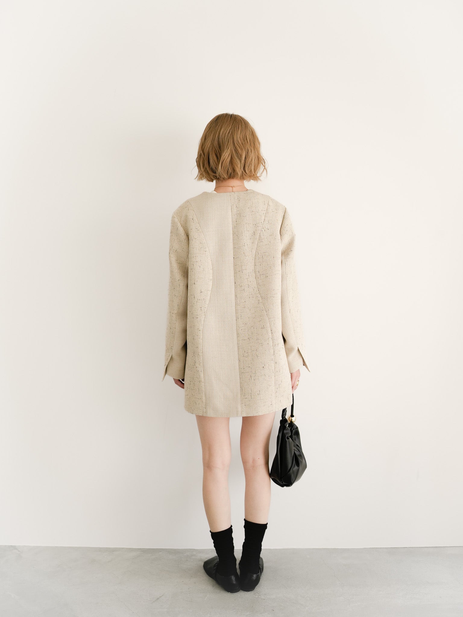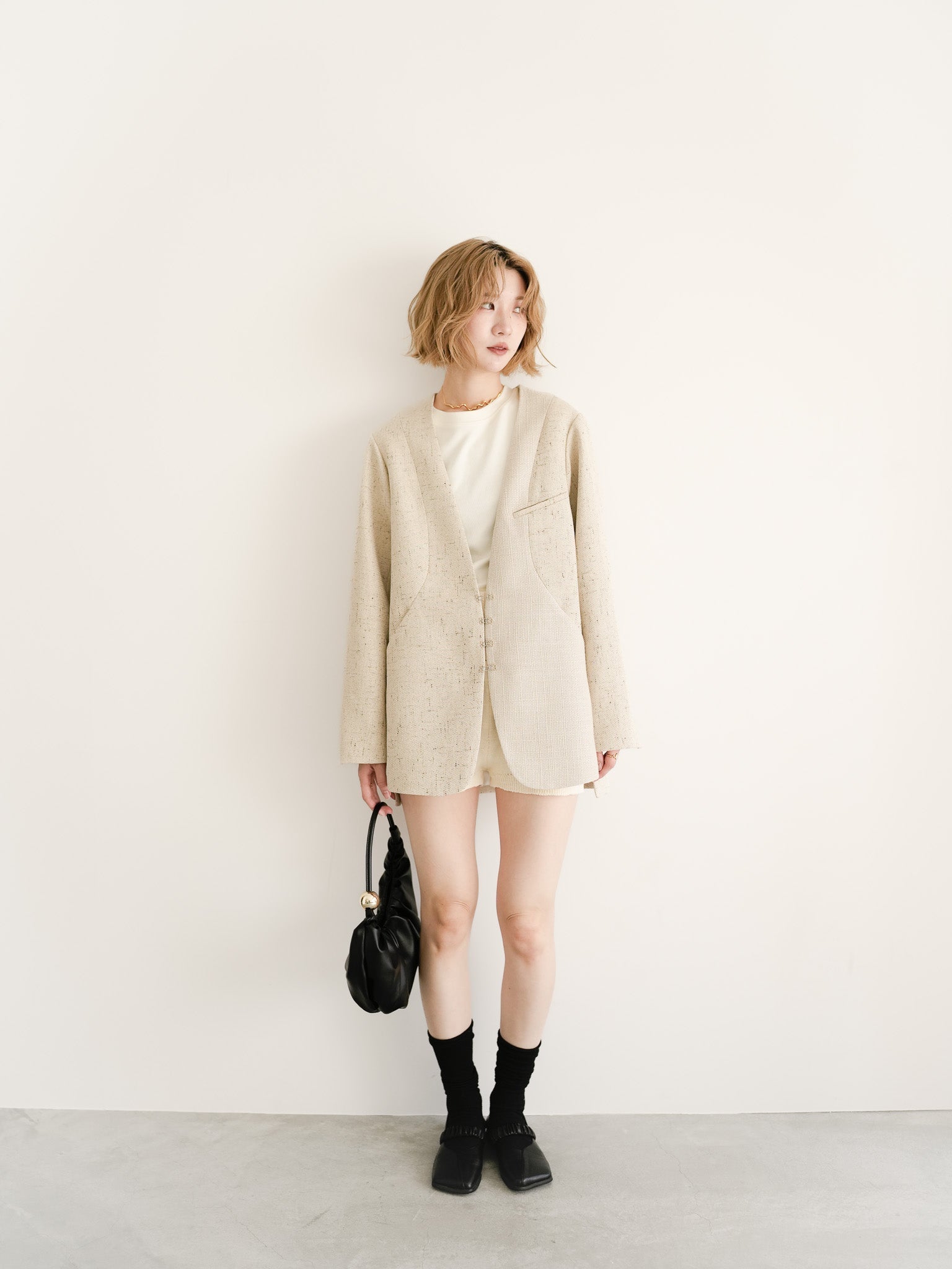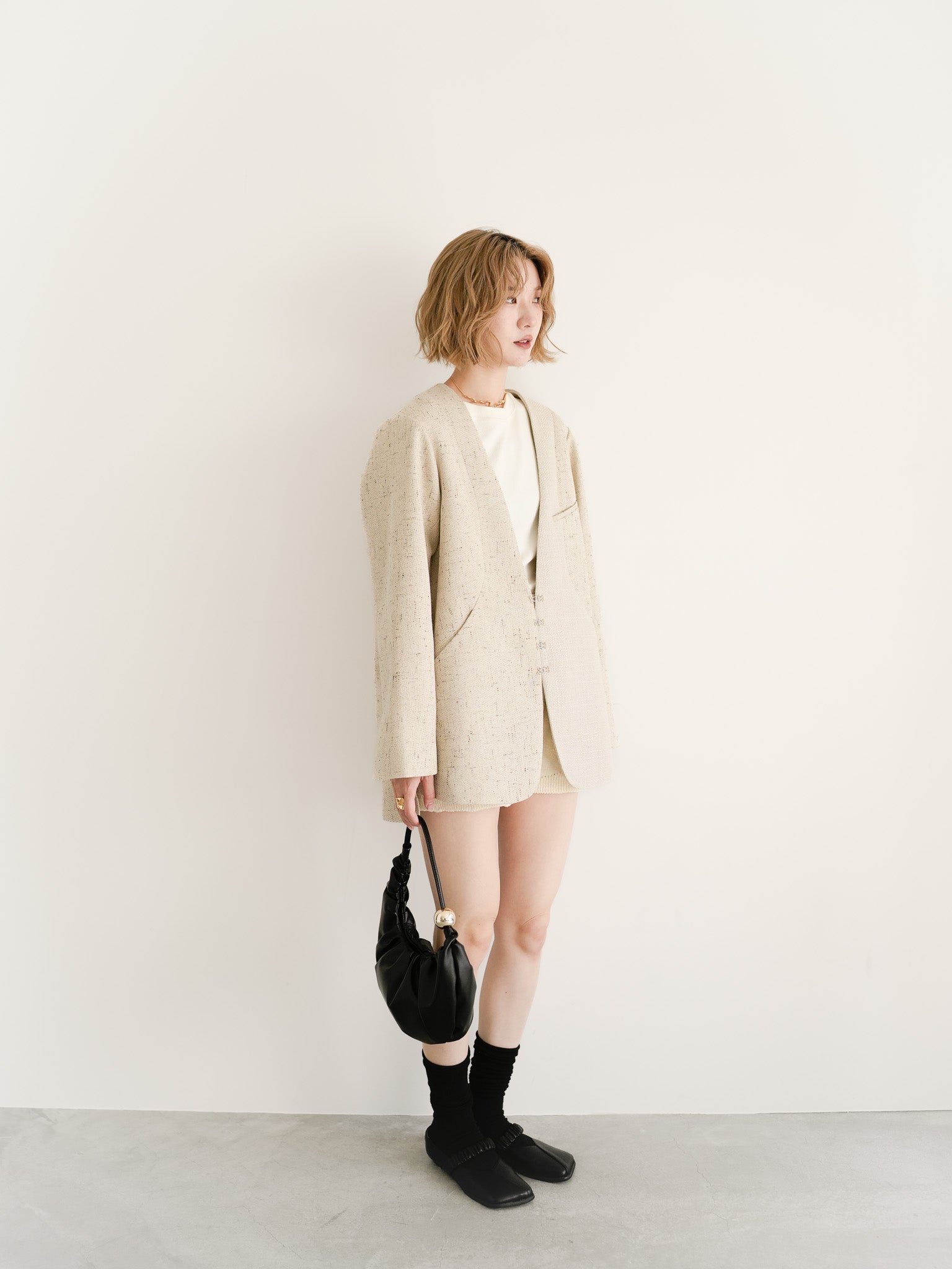 ナチュラルな風合いのジャケットにショートパンツを合わせた、軽やかなバランス。トーンを揃えたワントーンコーデに、ブラック小物で締めることでモダンな印象に仕上げました。