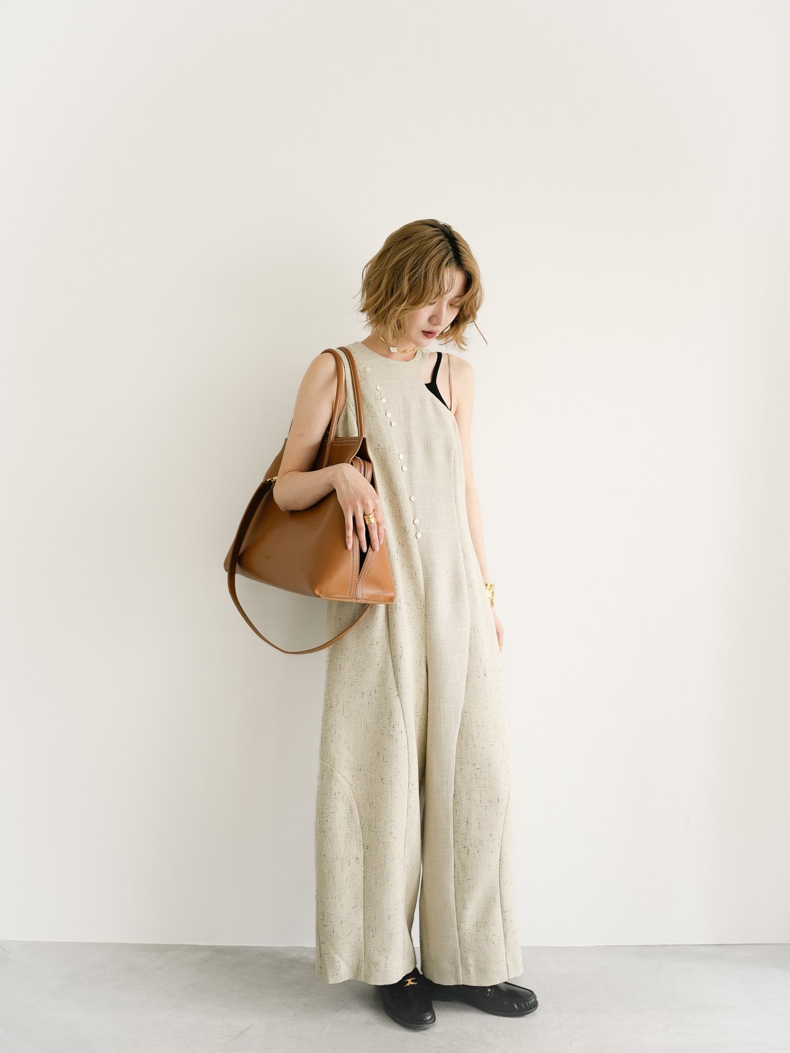 上質なツイード調オールインワンが主役。アシンメトリーなボタンディテールがモードな印象を与え、ゴールドアクセサリーでエフォートレスなラグジュアリーを添えたスタイリングです。