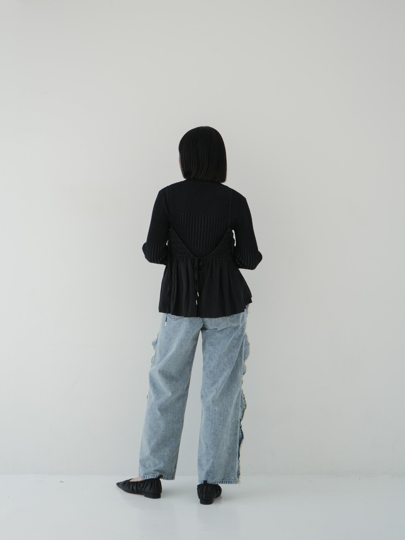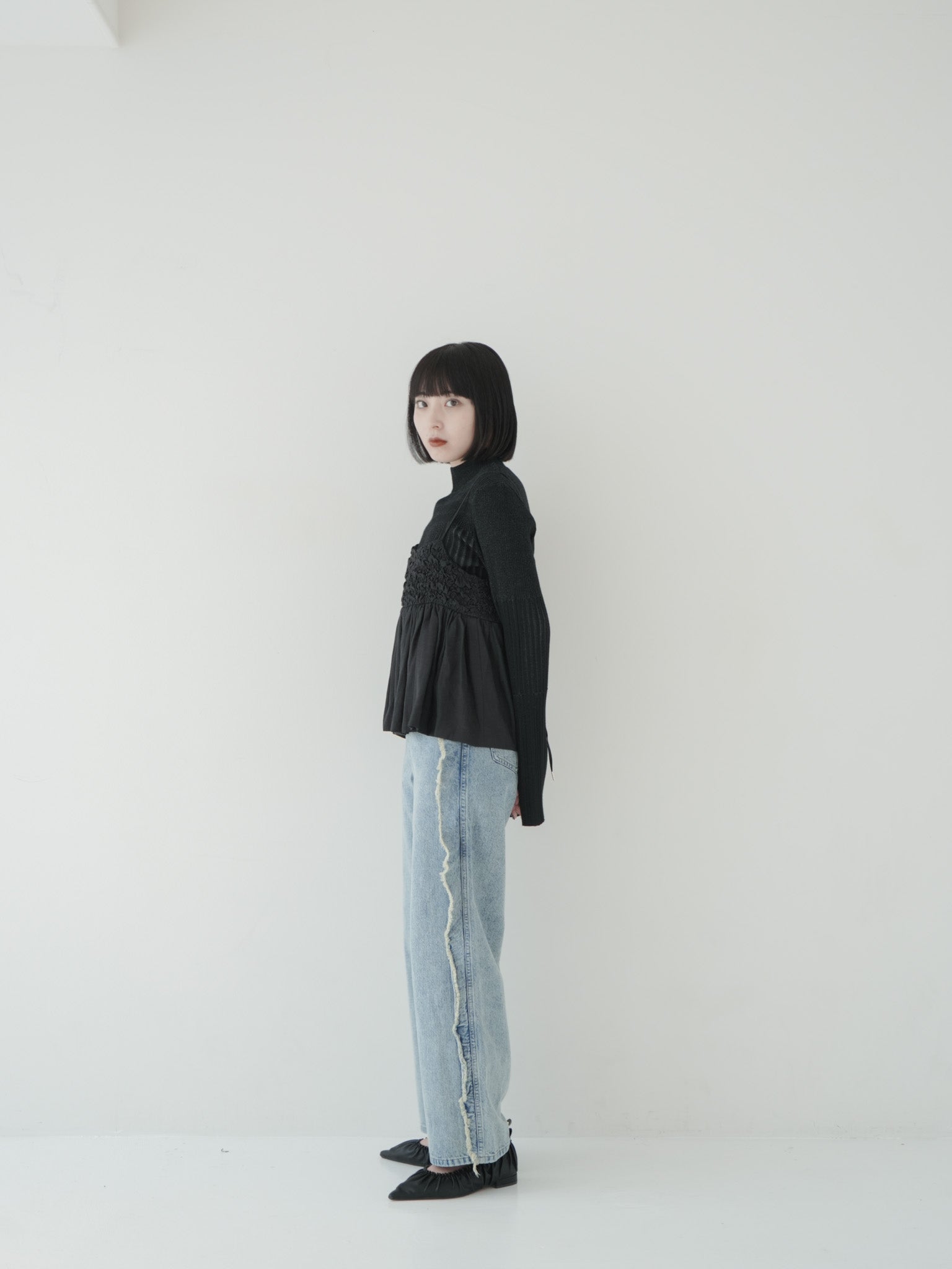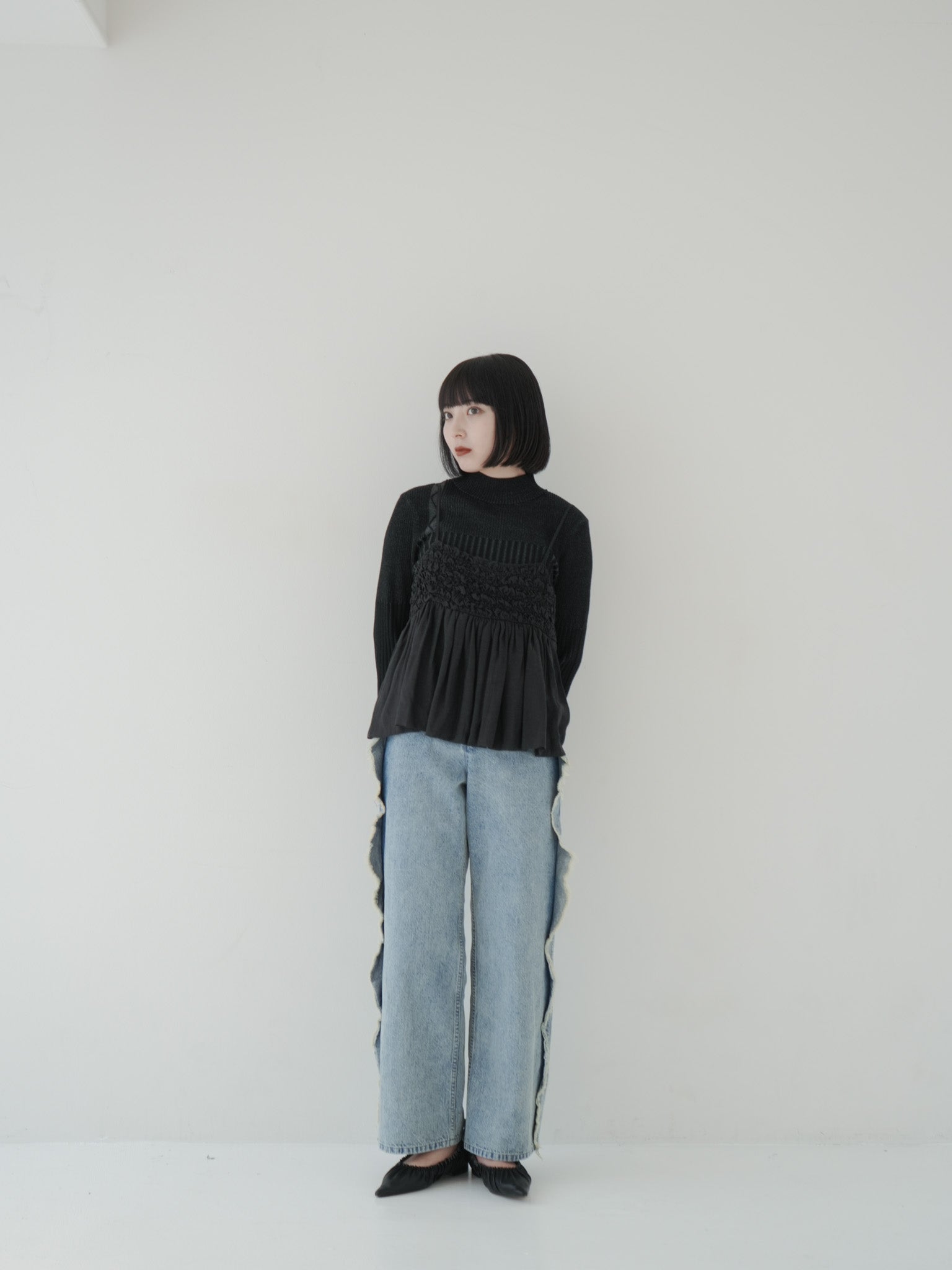 シャーリングを効かせたブラックトップスに、Èaphiらしいラッフルディテールが際立つデニムを合わせたバランス感が新鮮な装い。異素材のレイヤードを効かせることで、モノトーンに奥行きを持たせています。