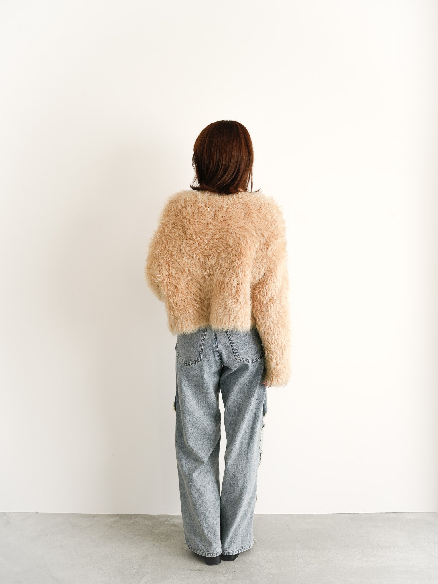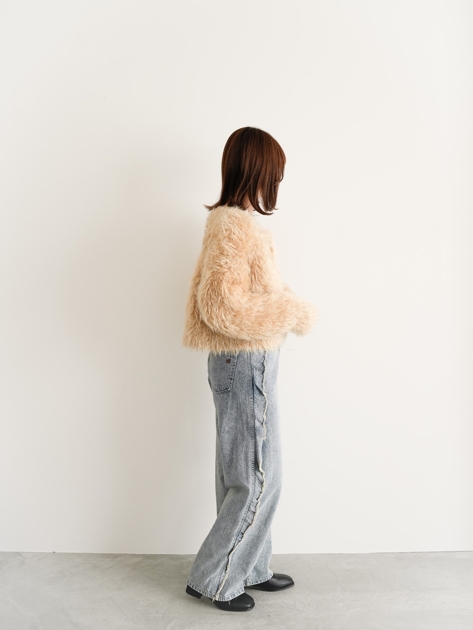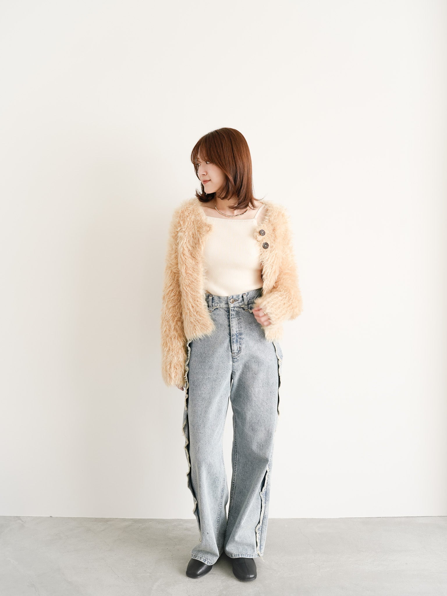 ふんわりとした毛足のカーディガンに、カットデザインが特徴のデニムを合わせたカジュアルスタイル。