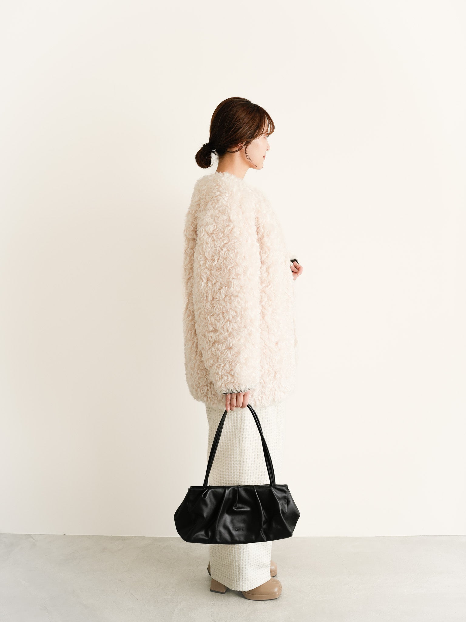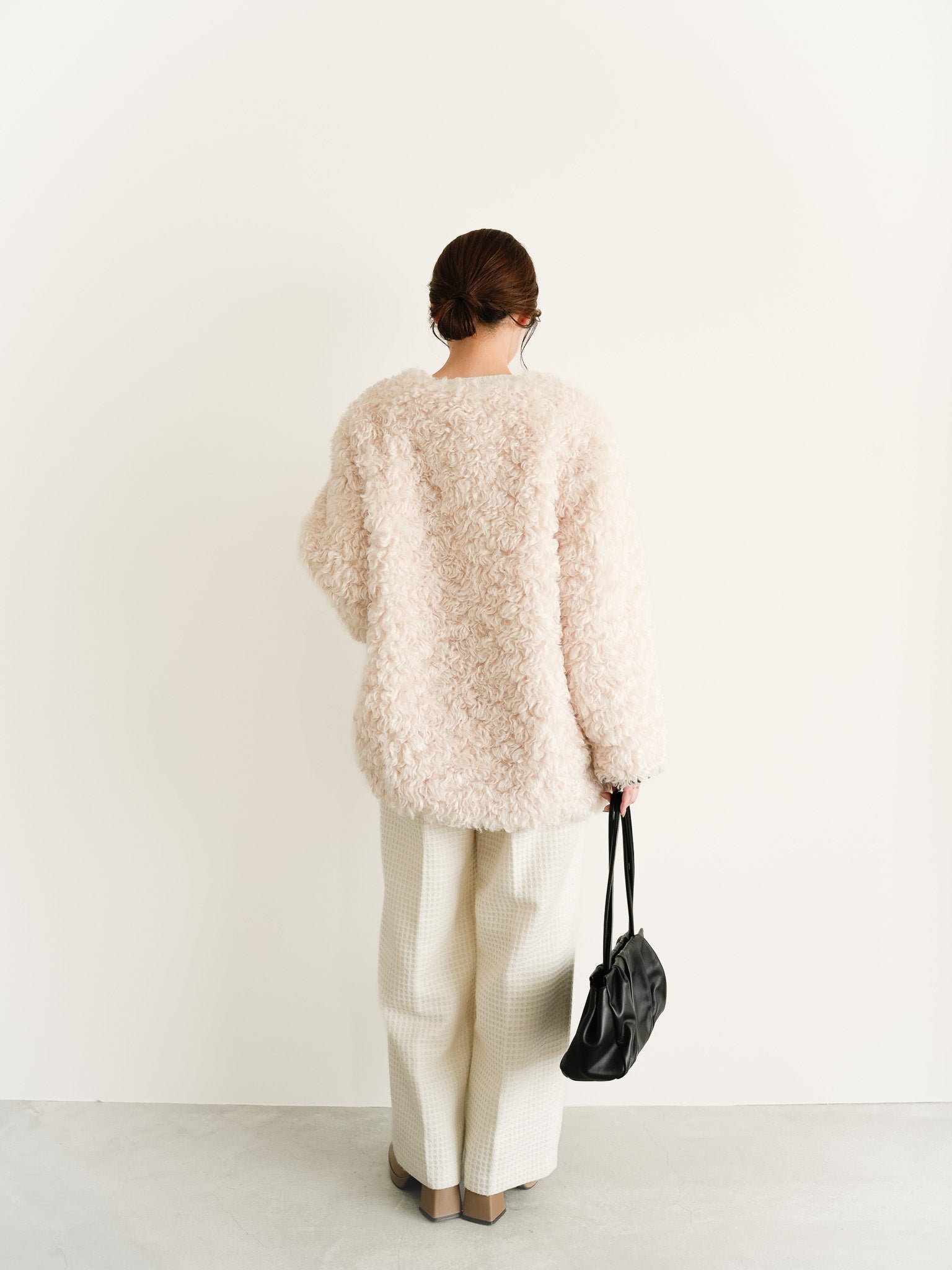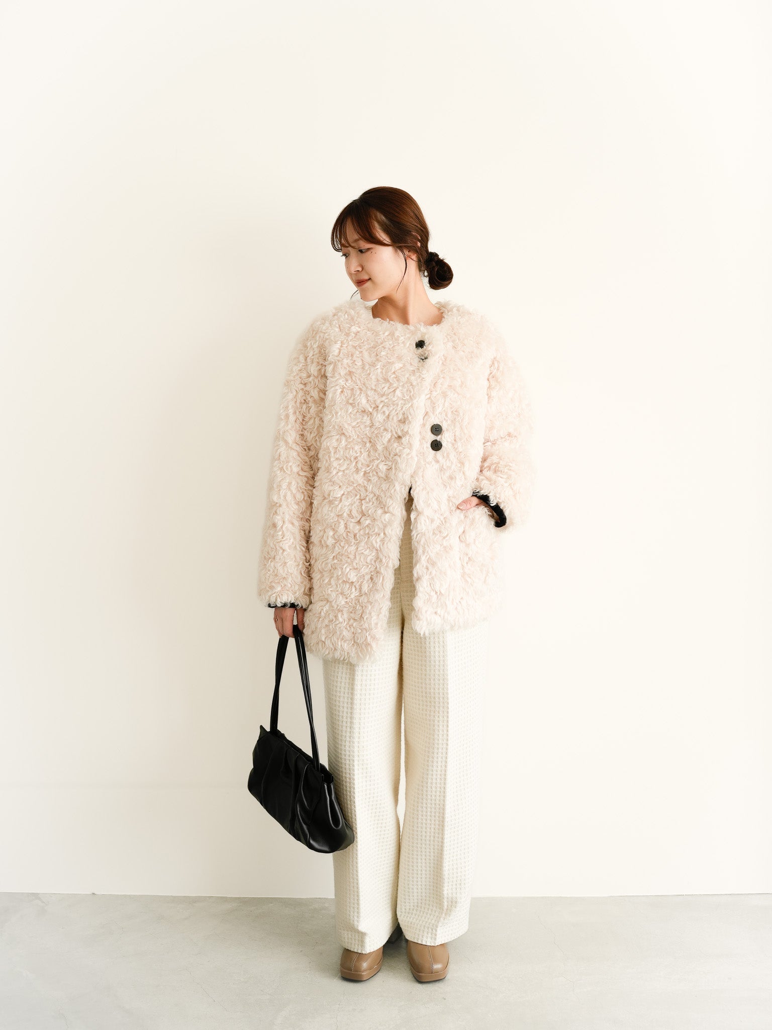 存在感のあるファージャケットを主役に、ワッフル生地のパンツを合わせた素材の掛け合わせ。
