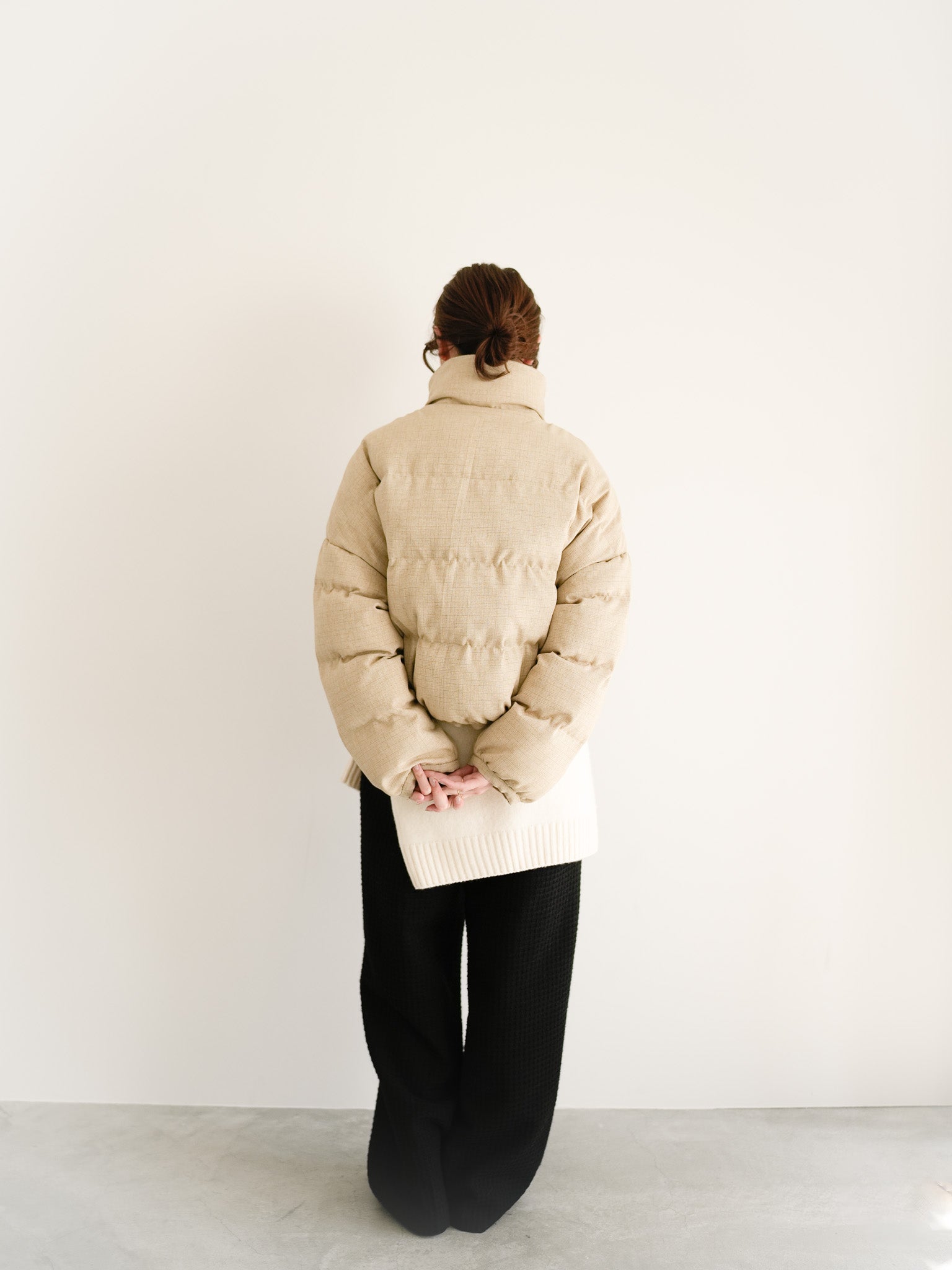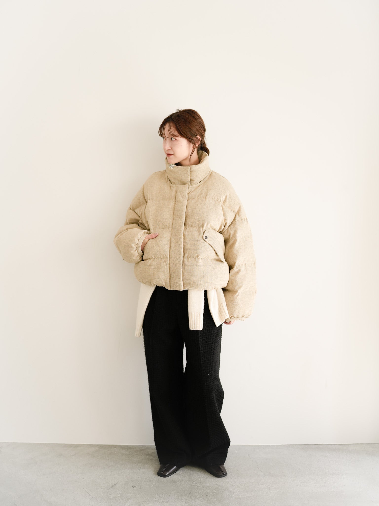 ボトムはワイドシルエットで重心を落とし、リラックス感とモードな存在感を両立。ミニマルな配色の中に、素材の奥行きが映えるバランスの取れたコーディネートです。