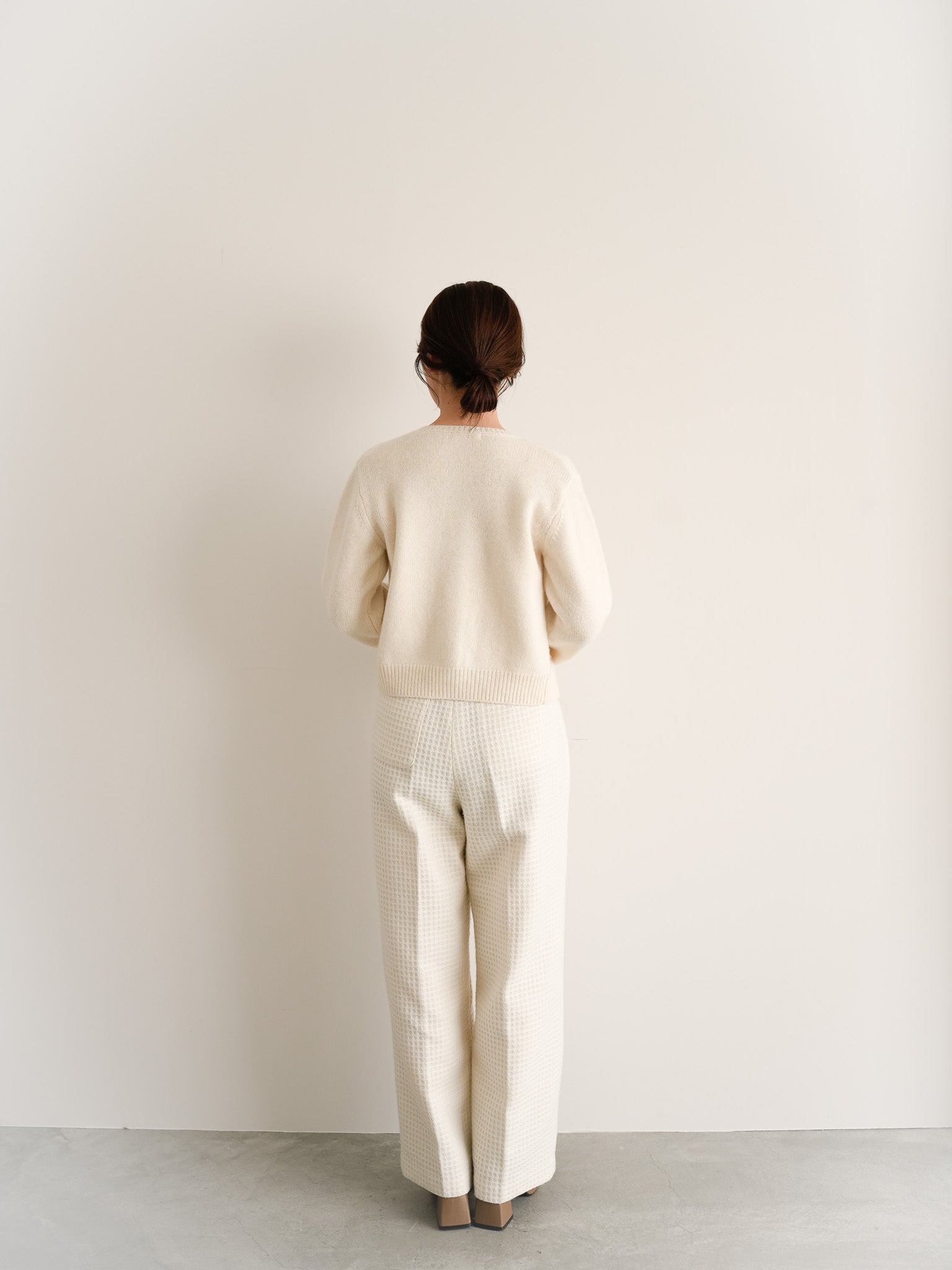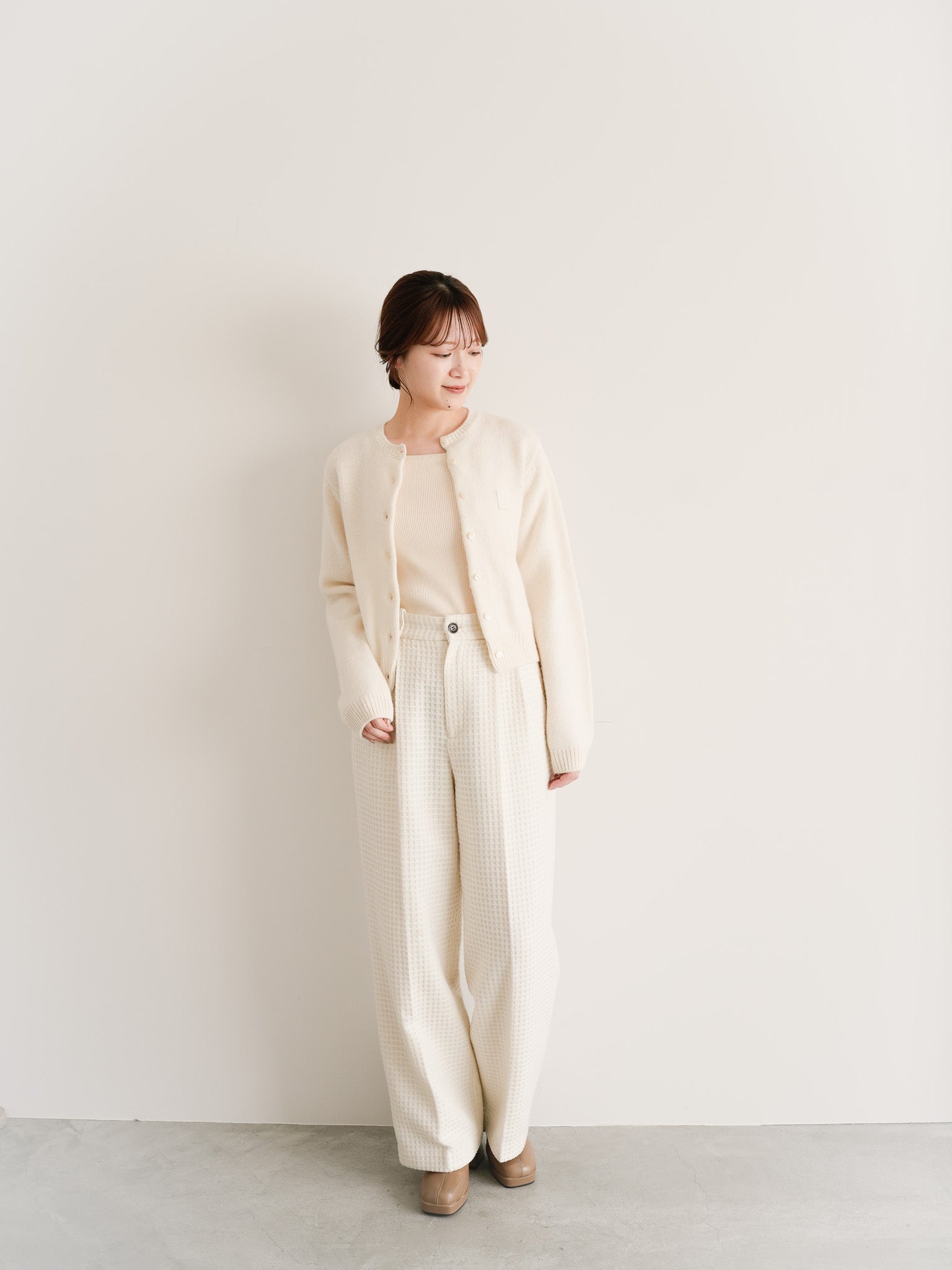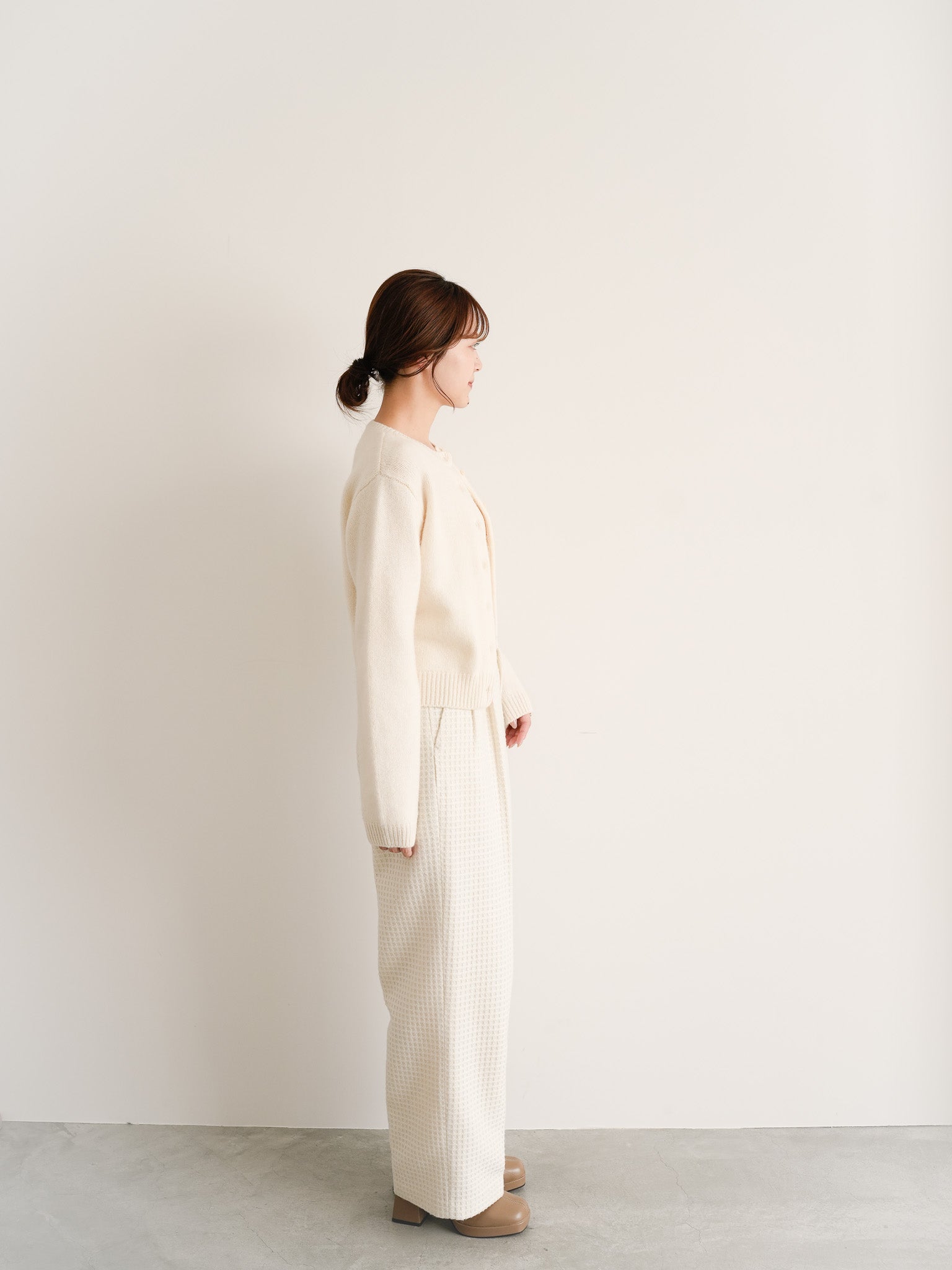 ワッフルパンツの立体的な表情が、同系色の中に奥行きを生み出します。クリーンで女性らしい印象ながら、シルエットの美しさで程よくモードに仕上げました。