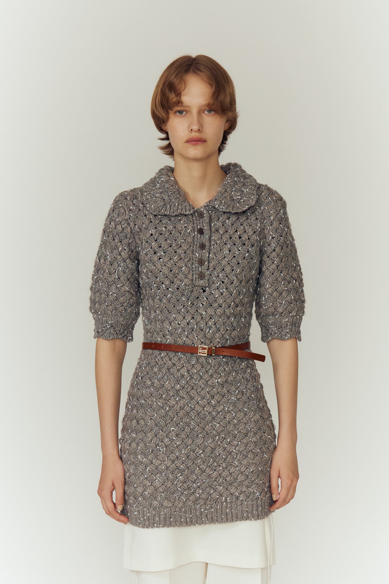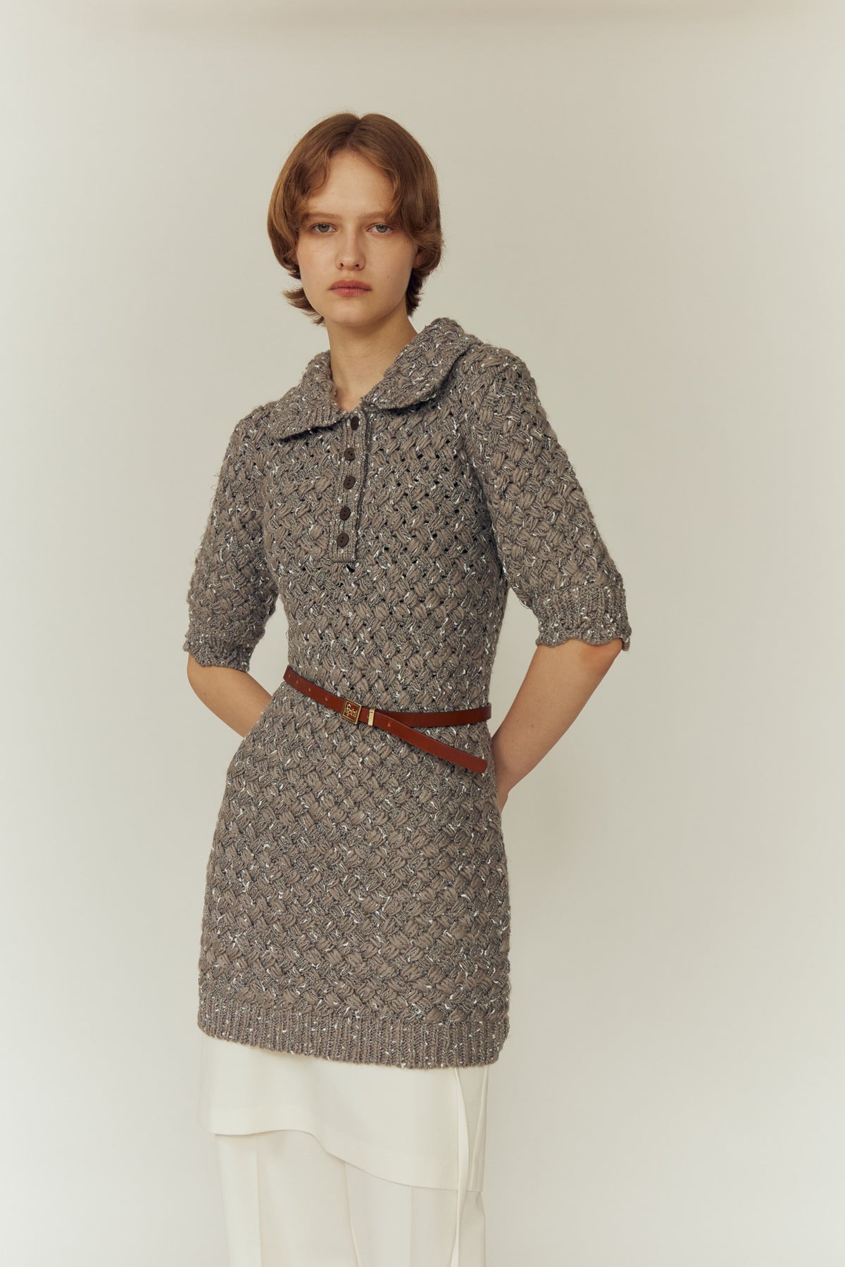 過去のアイテムと一線を画すように設計された、ポロシャツライクな襟元とミニ丈のバランス。