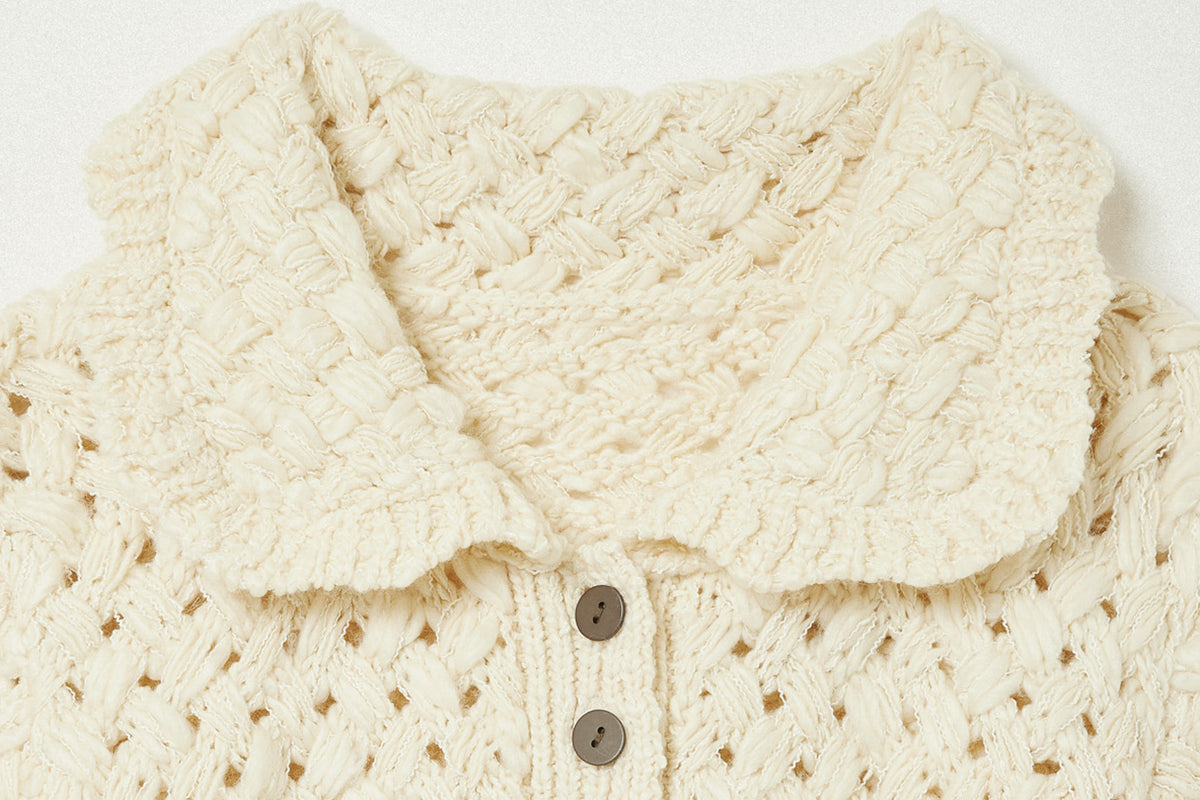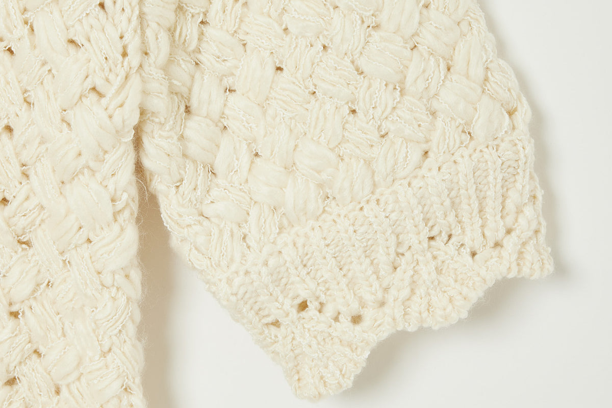 バスケット編みの立体感、一種類では終わらせない糸の重なり。