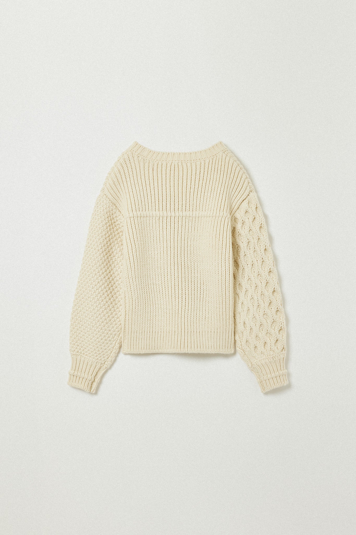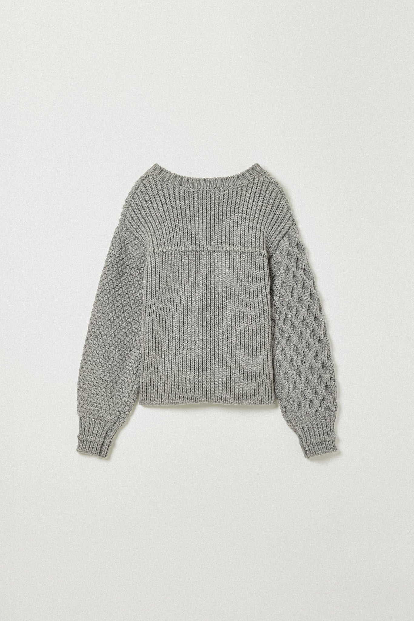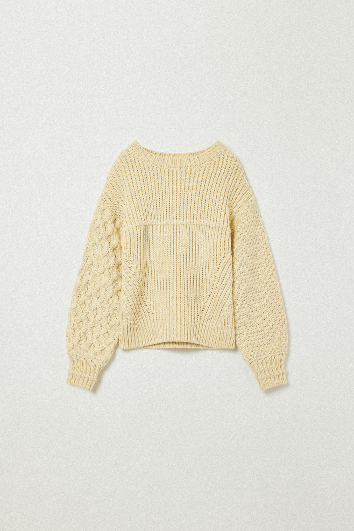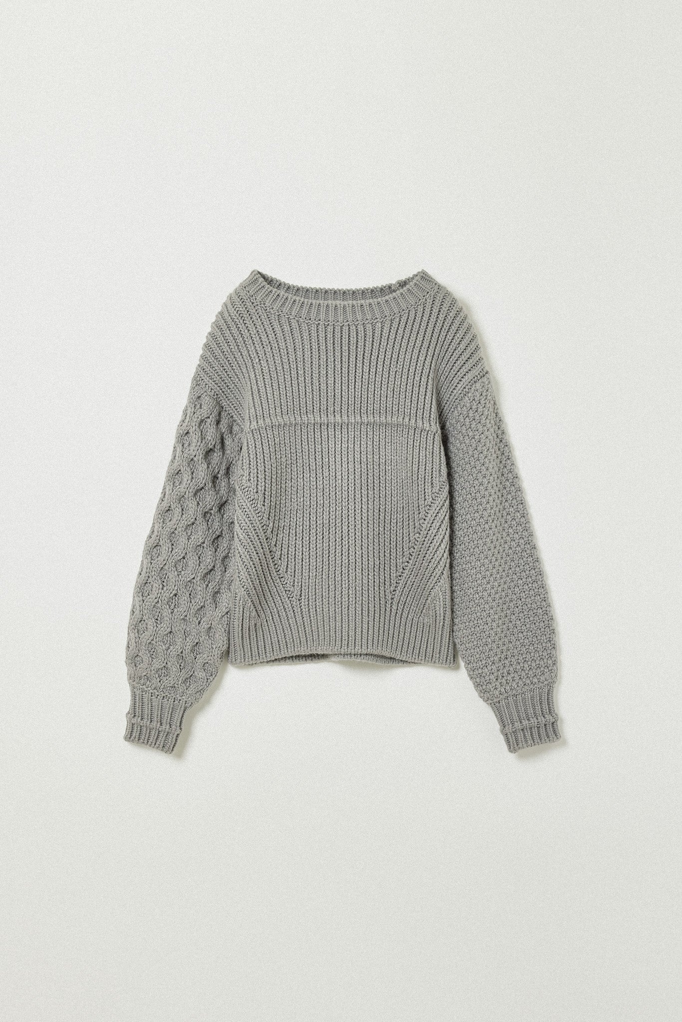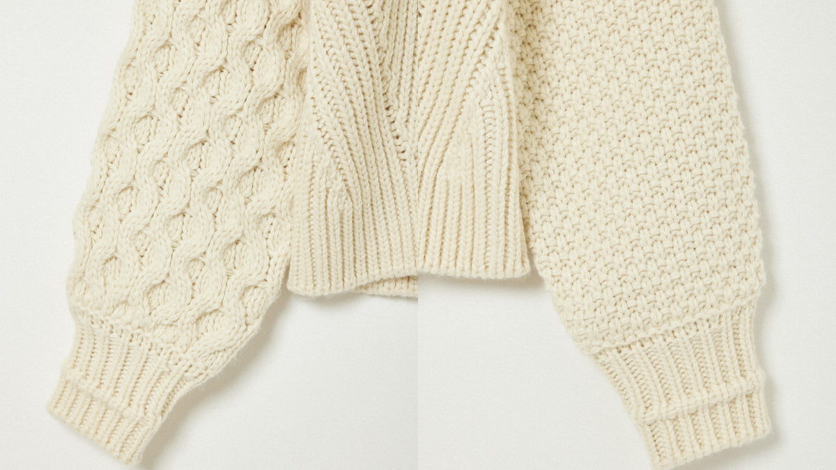 左右で異なる袖の編み地や、胸元の切り替えが動きを生む一枚に。