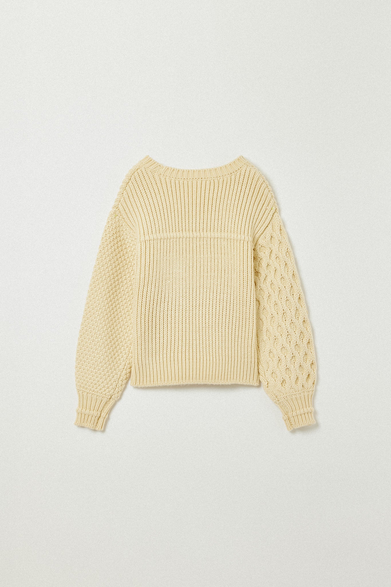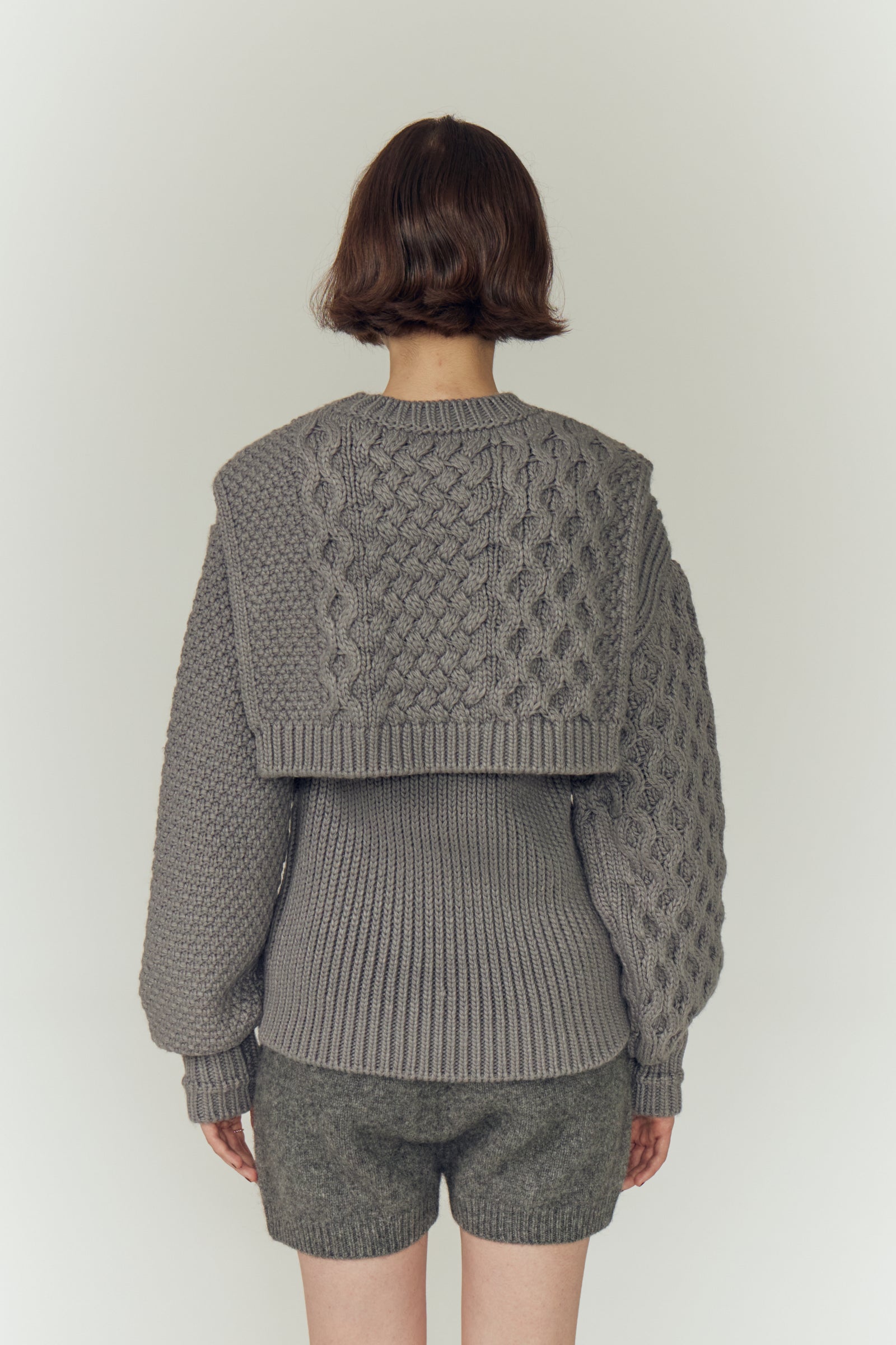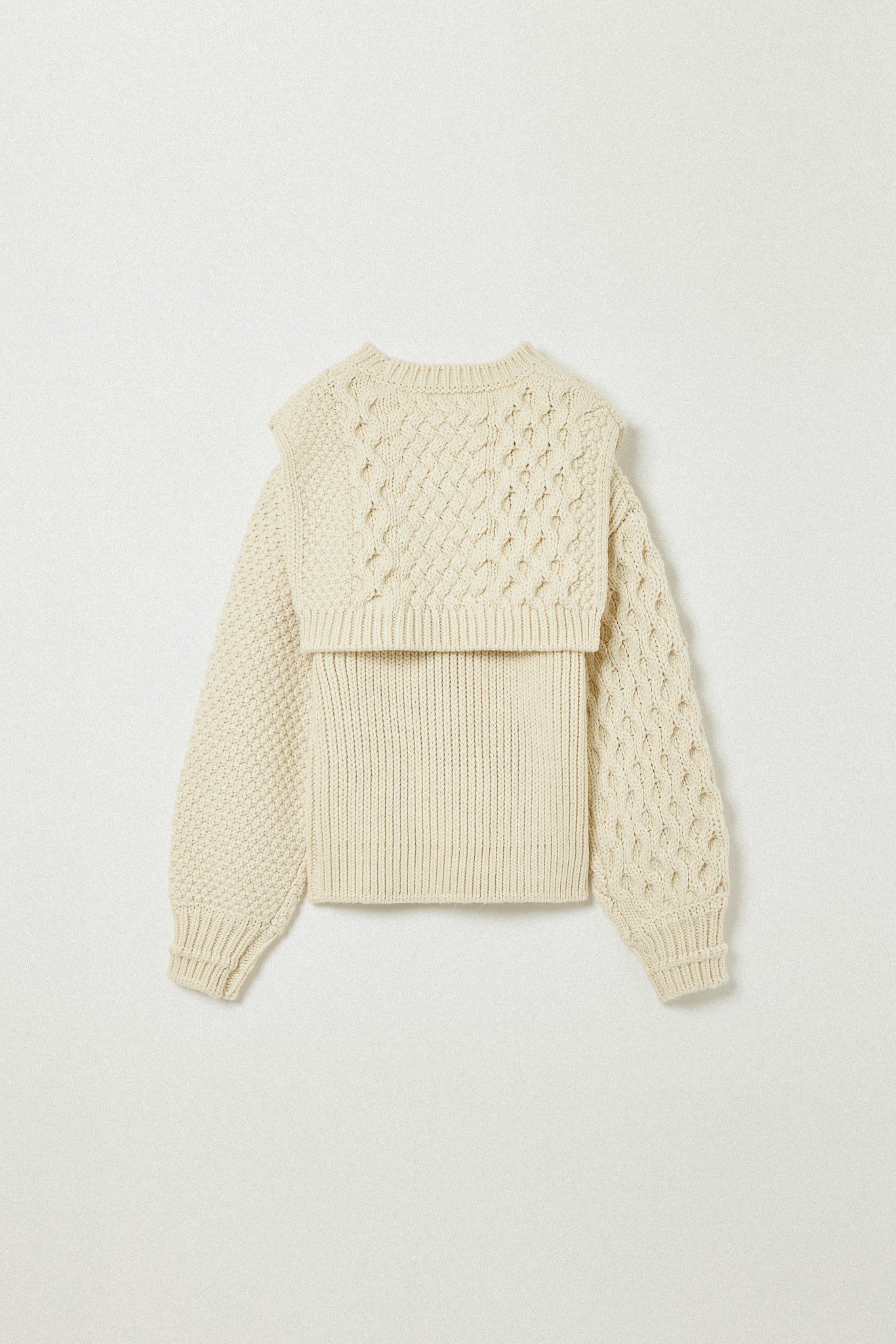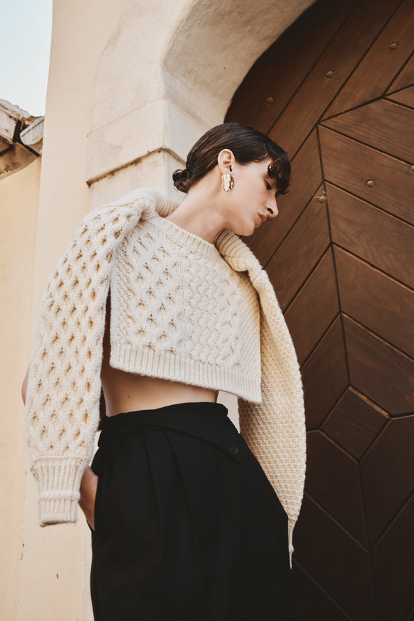 左右で異なる袖の編み地や、胸元の切り替えが動きを生む一枚に。