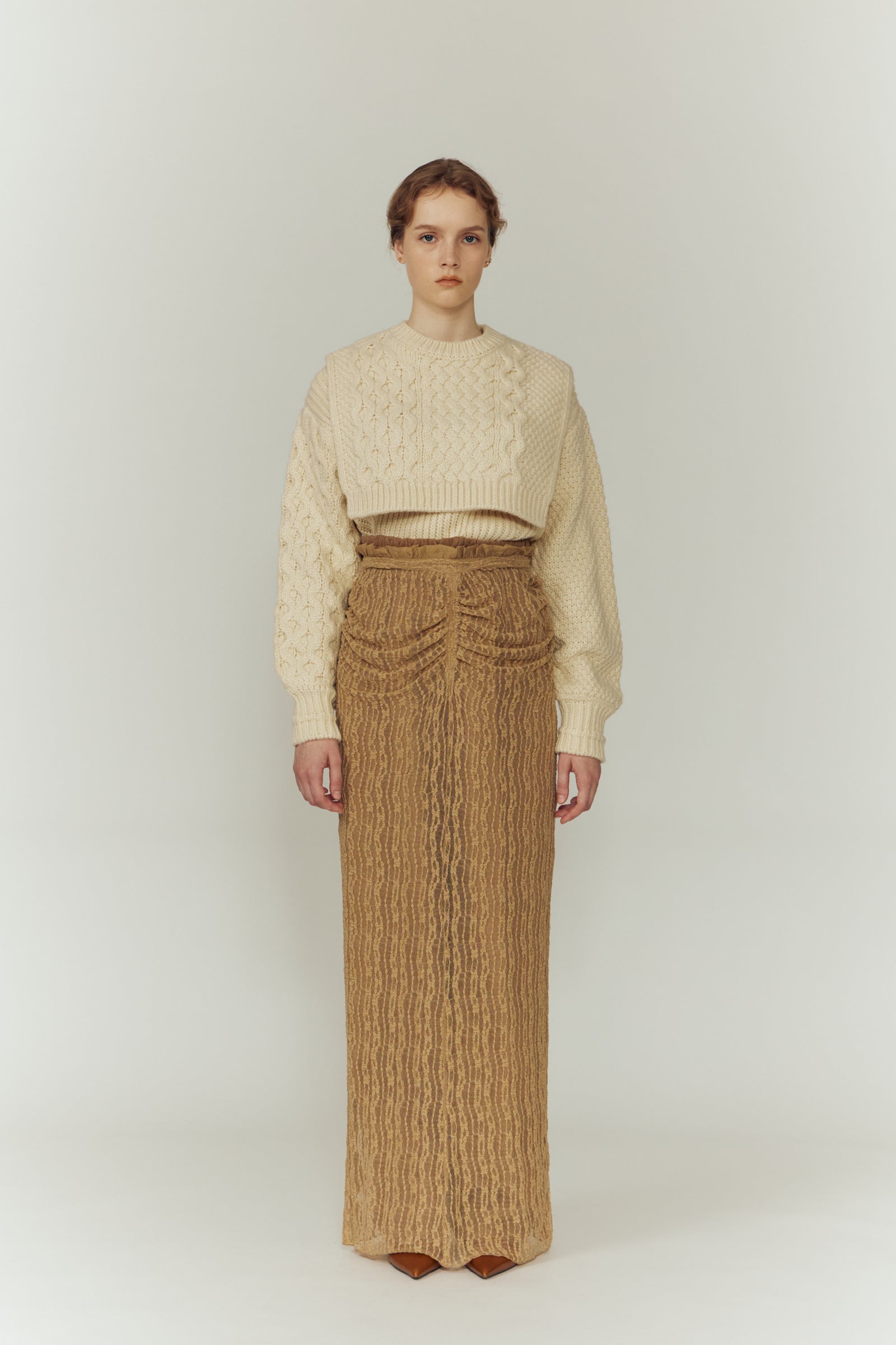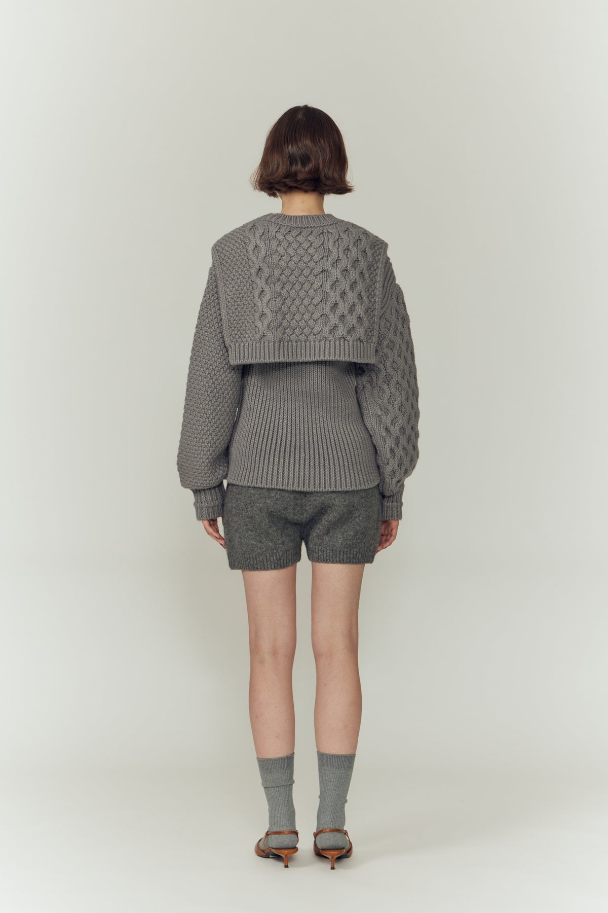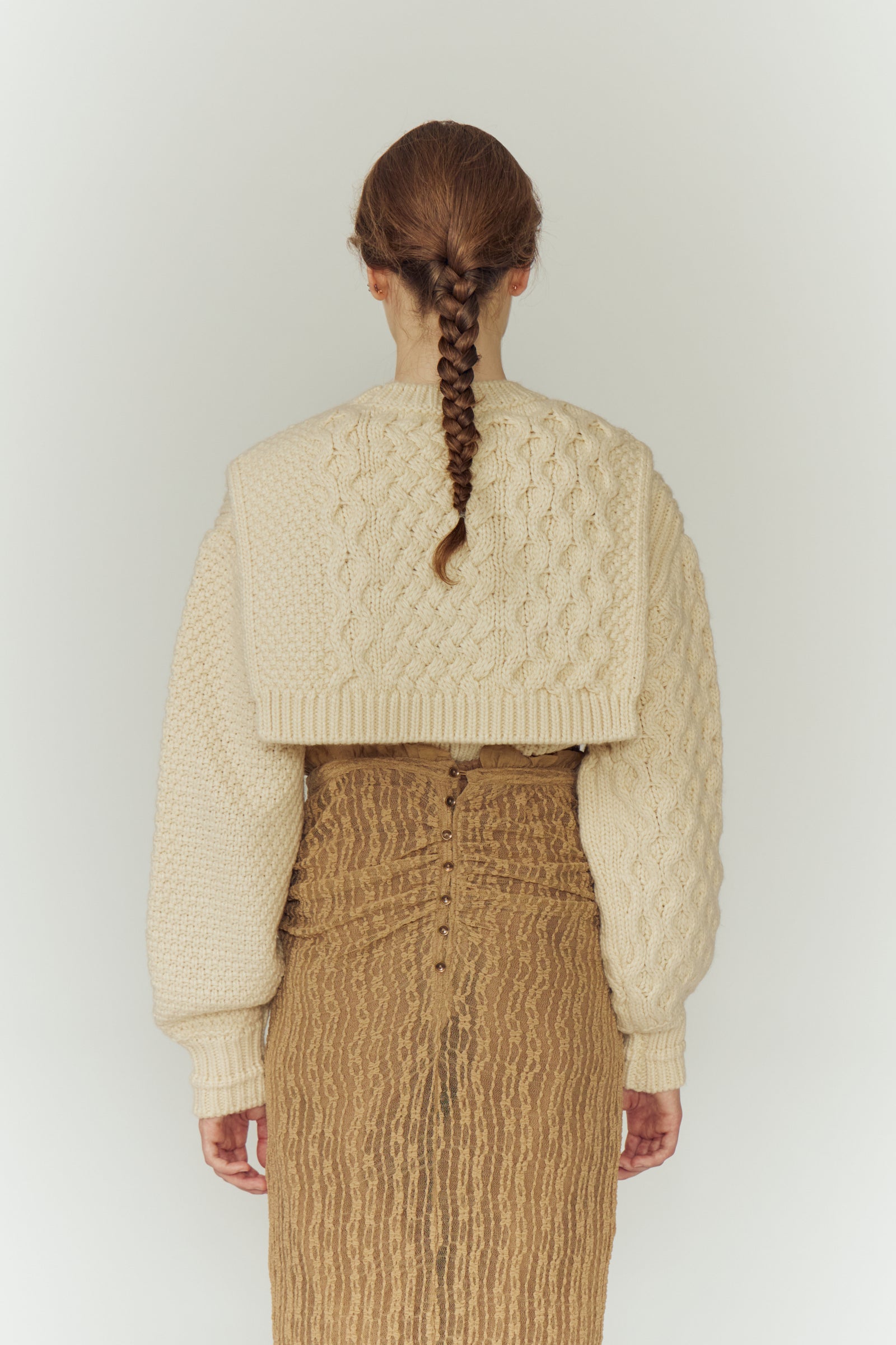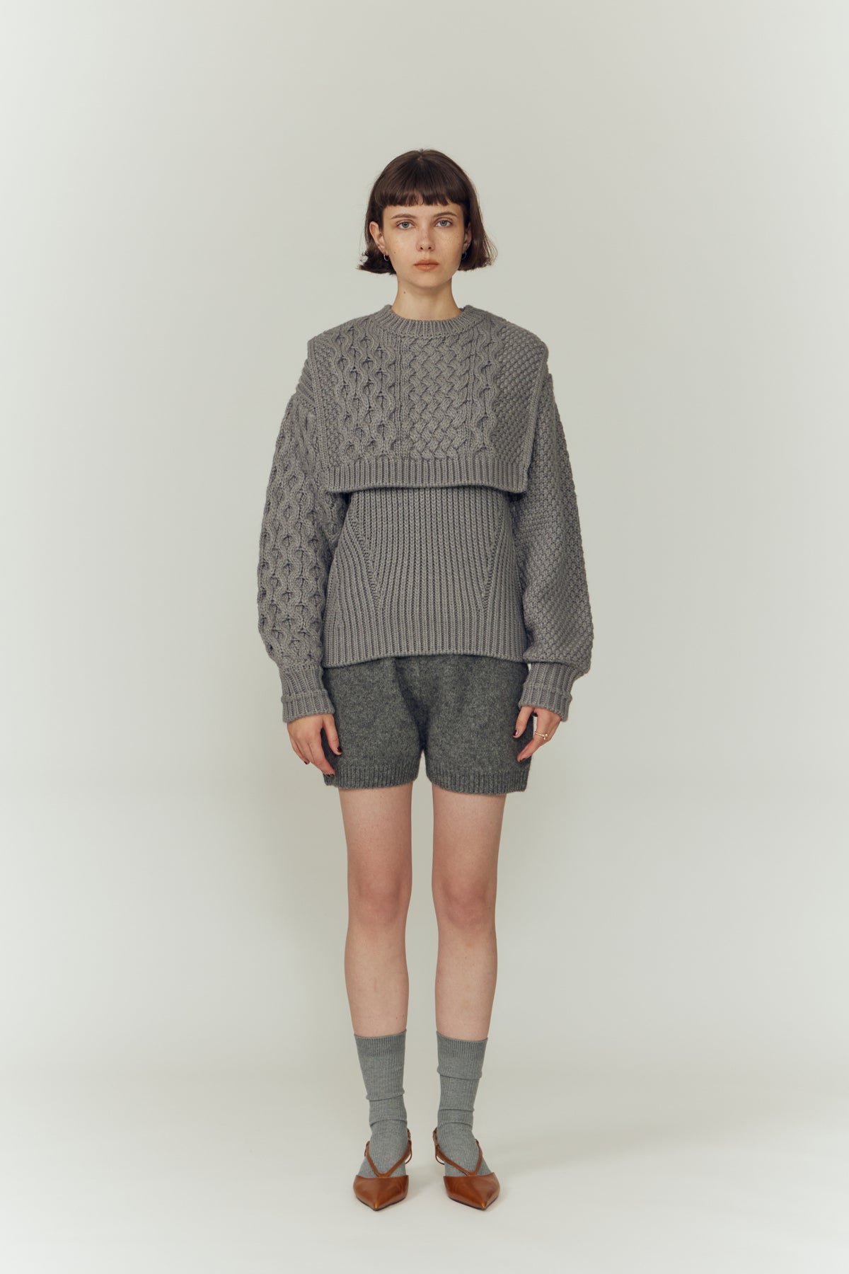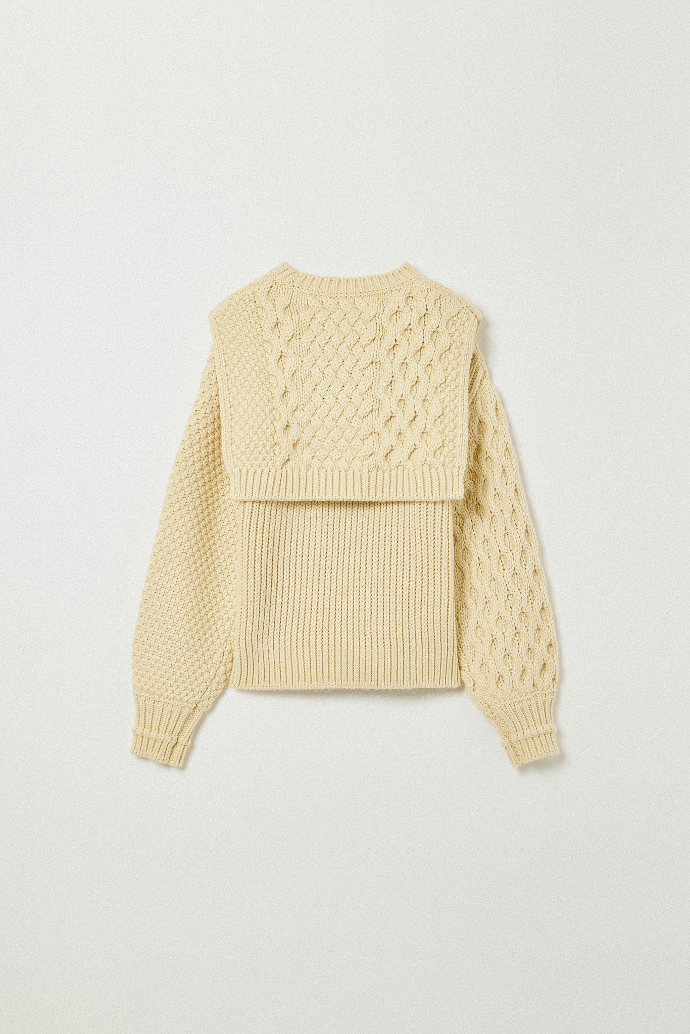 左右で異なる袖の編み地や、胸元の切り替えが動きを生む一枚に。