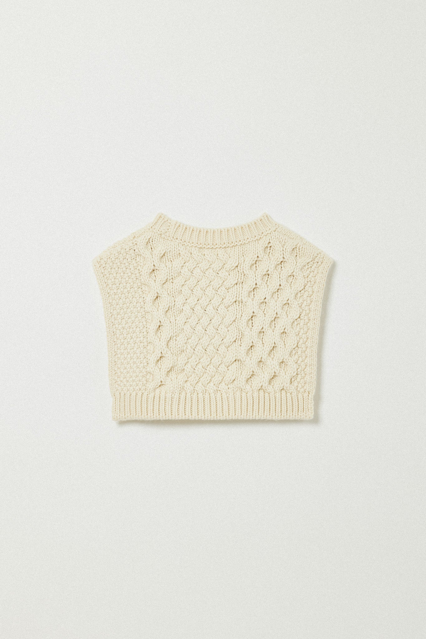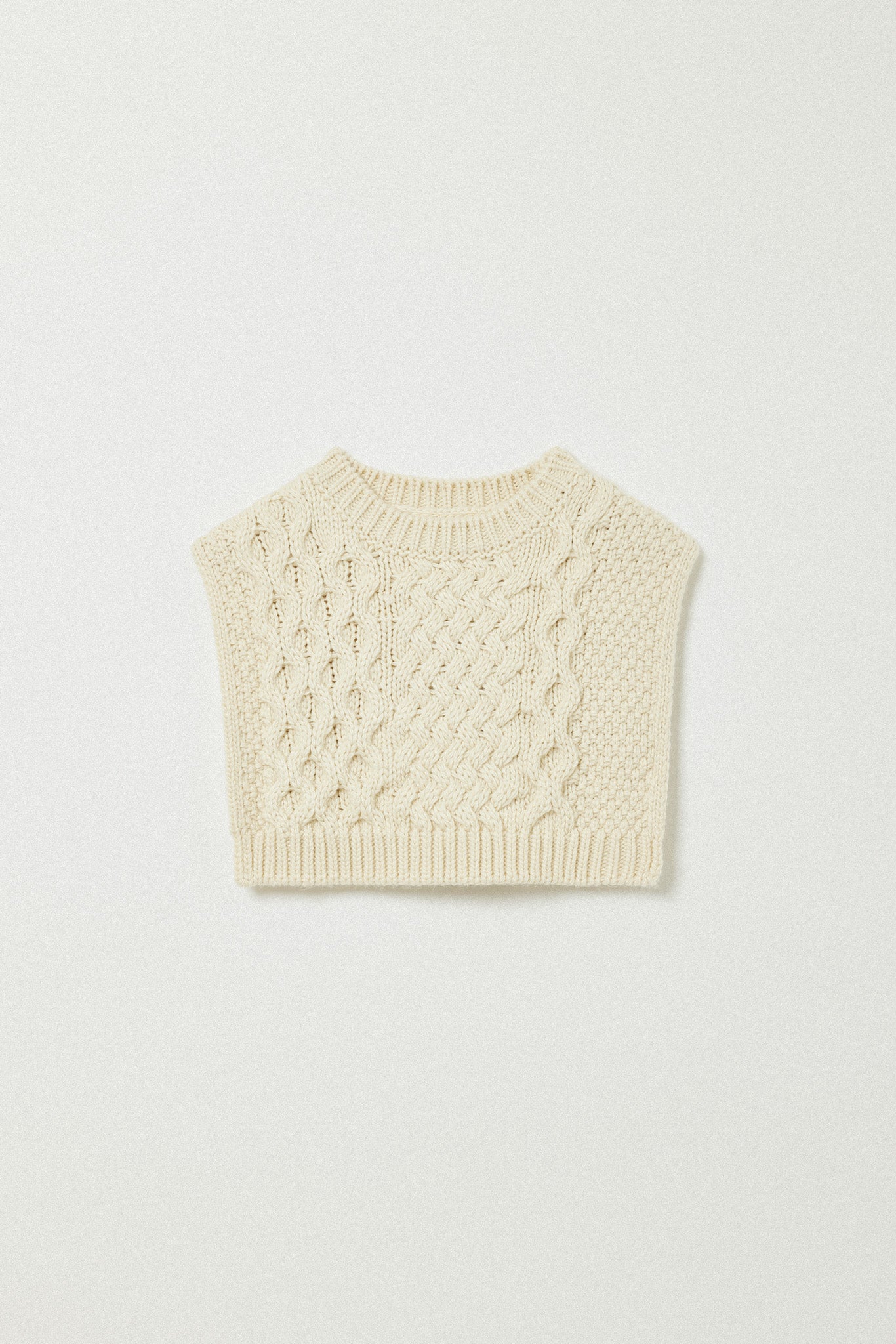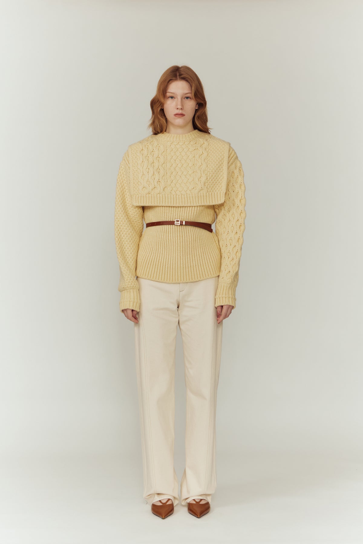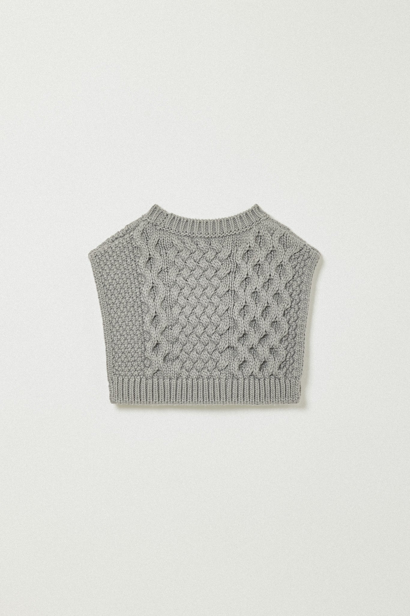 左右で異なる袖の編み地や、胸元の切り替えが動きを生む一枚に。