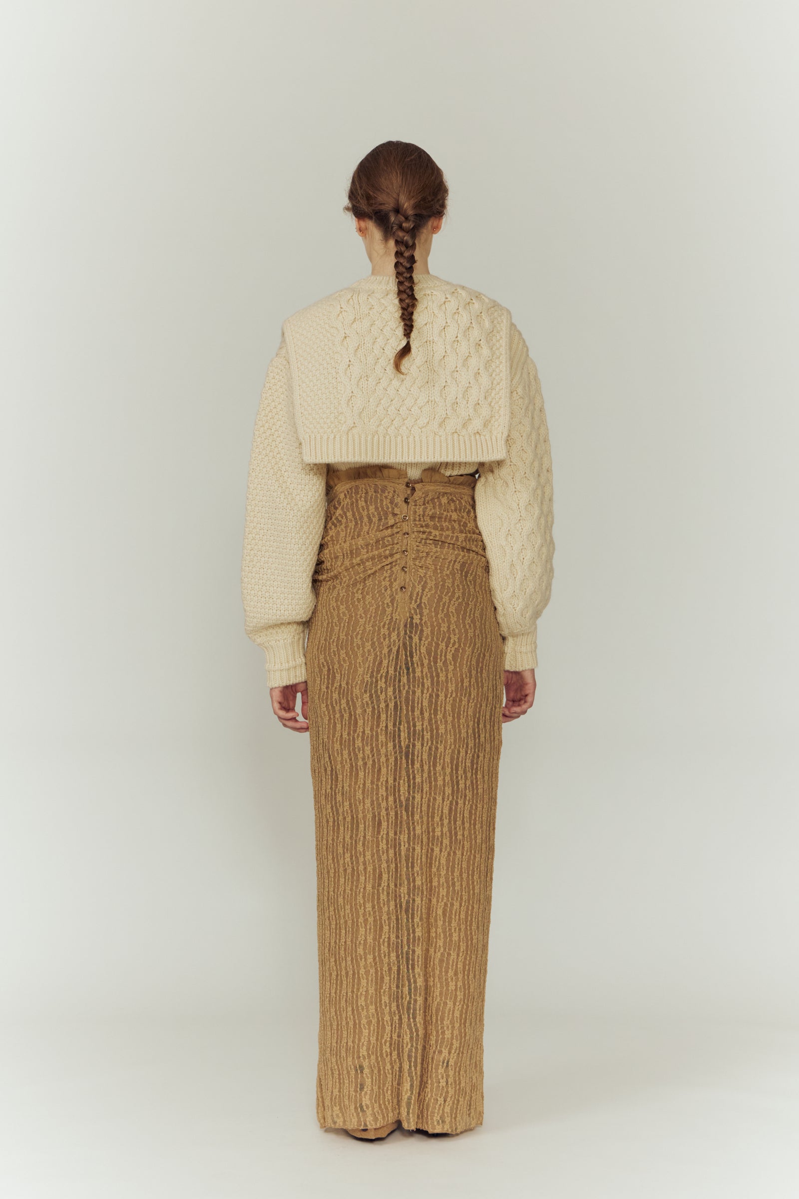 タイトな身頃と、可変するケープの関係性が、ひとつのスタイルに複数の表情をもたらす。