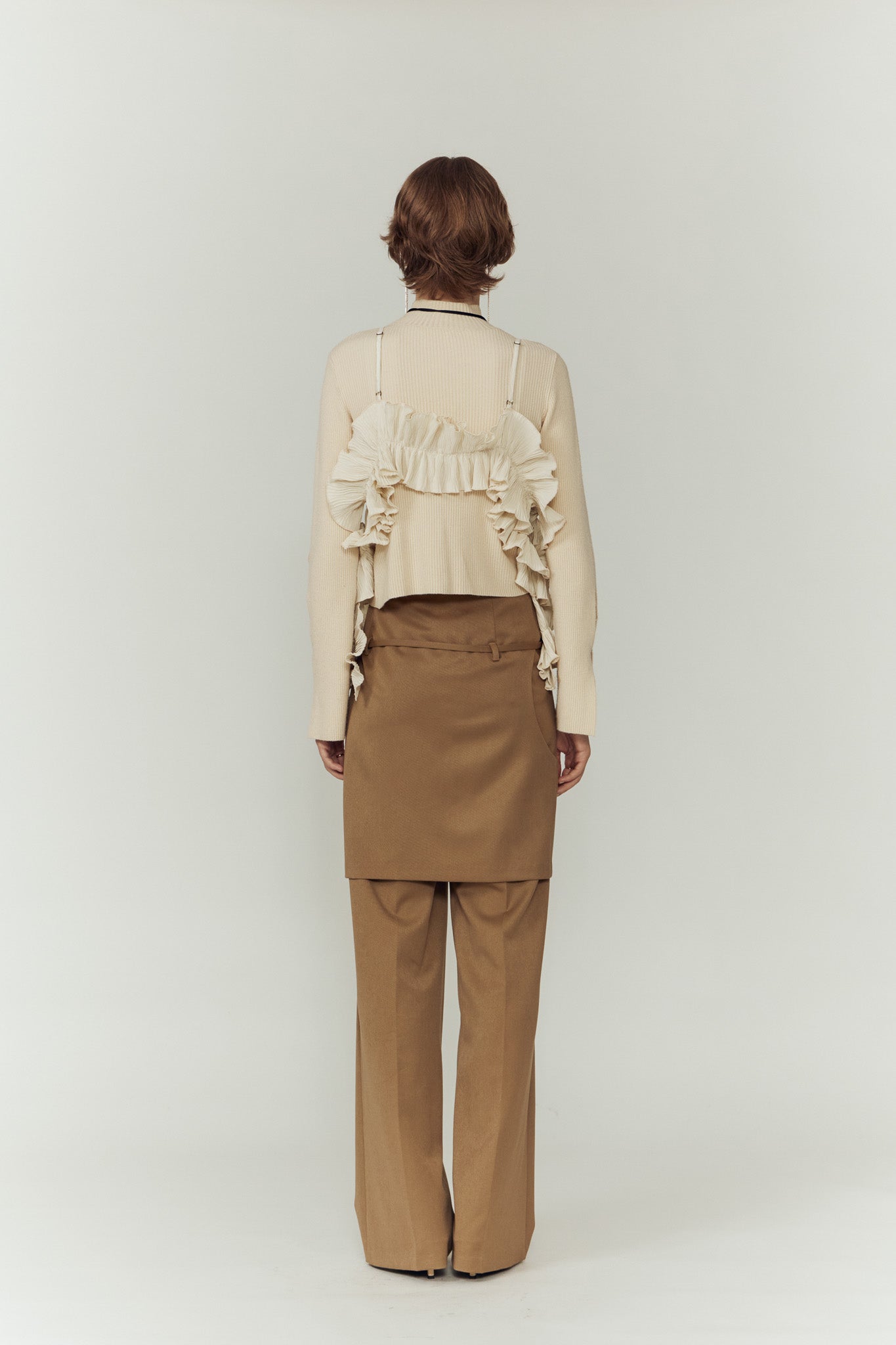 ゴムギャザーを仕込むことで波打つような立体的フォルムを実現したデザインと実用性を兼ね備えた一着です。