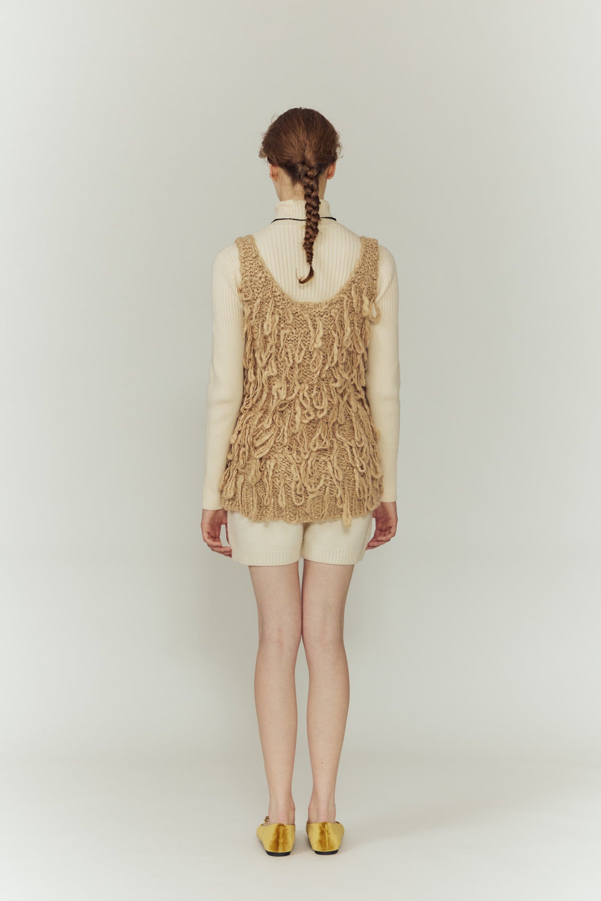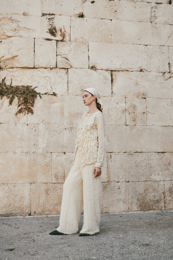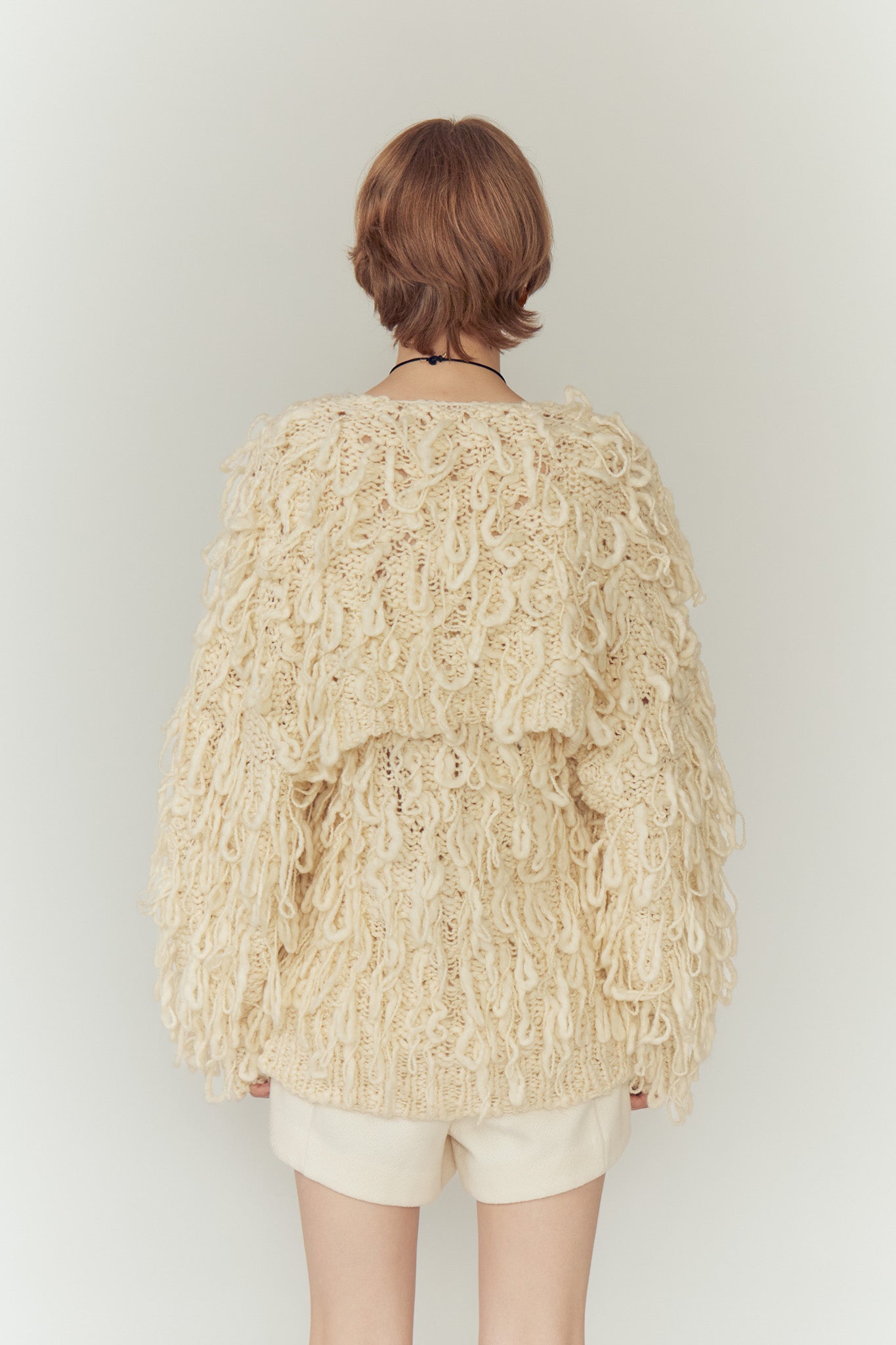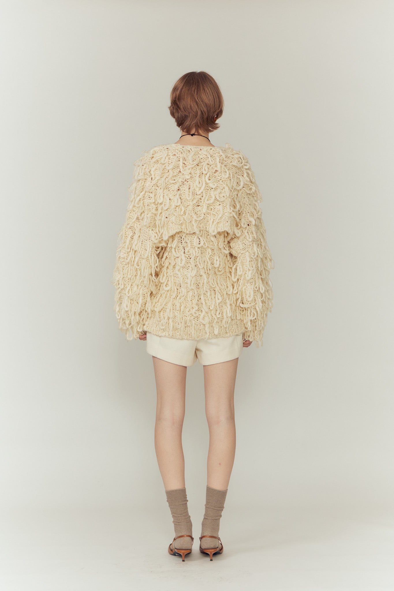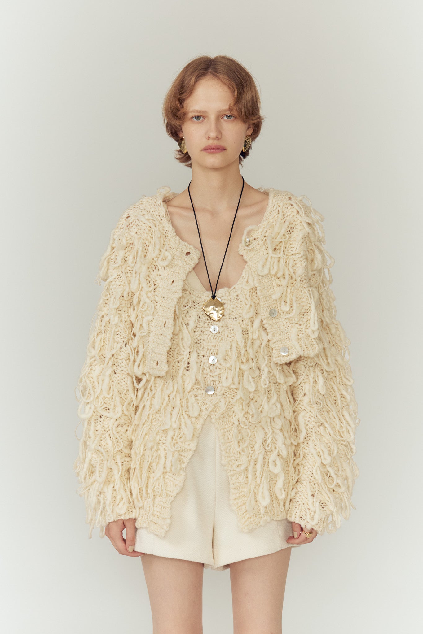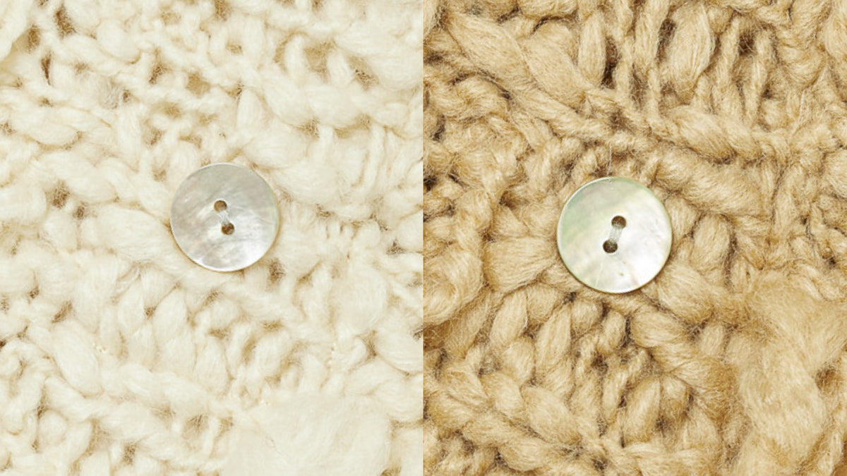 不規則な節のあるスラブ糸を使用し、凹凸感のある編み地に仕上げることで、立体感とほどよい動きを。
