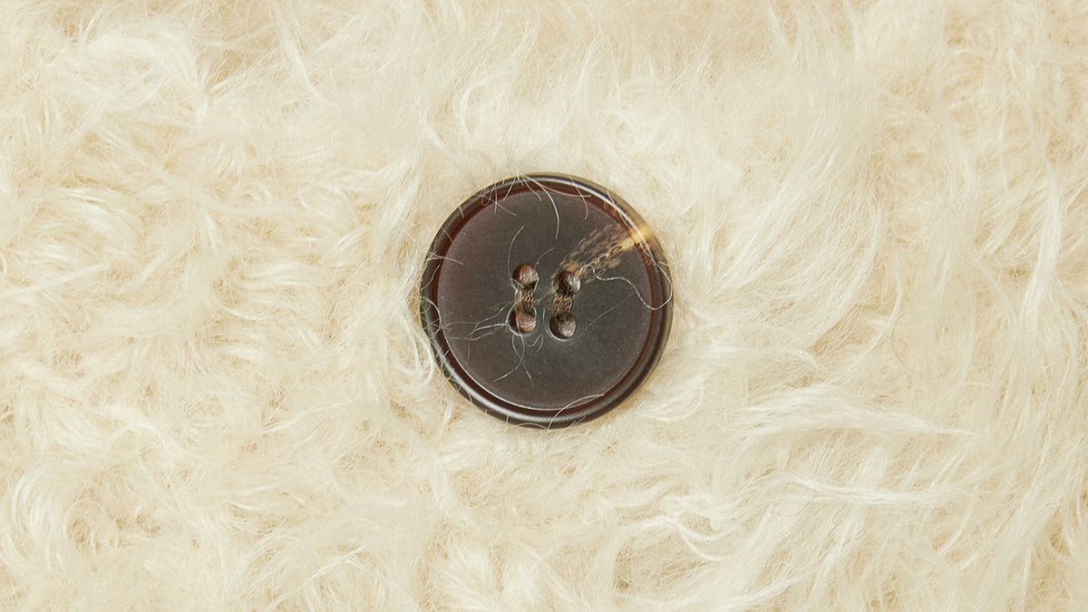 フロントのボタンは、光沢あるシャギー素材との調和を意識。