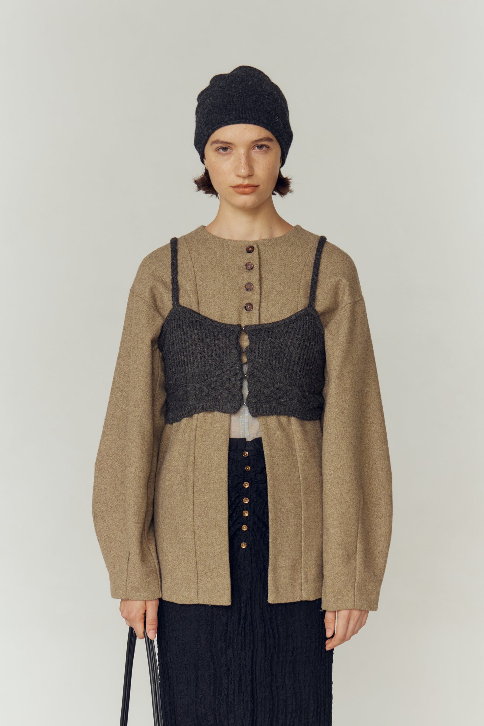 フランスの服飾史において象徴的な存在であるコルセットから連想したニットビスチェ。