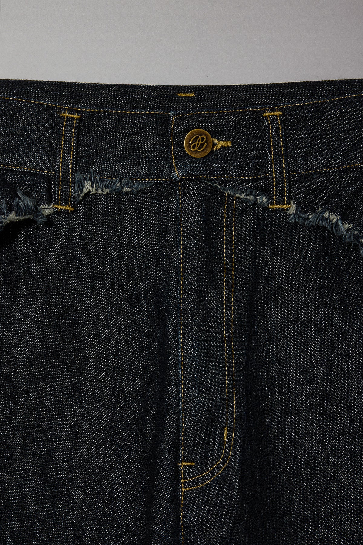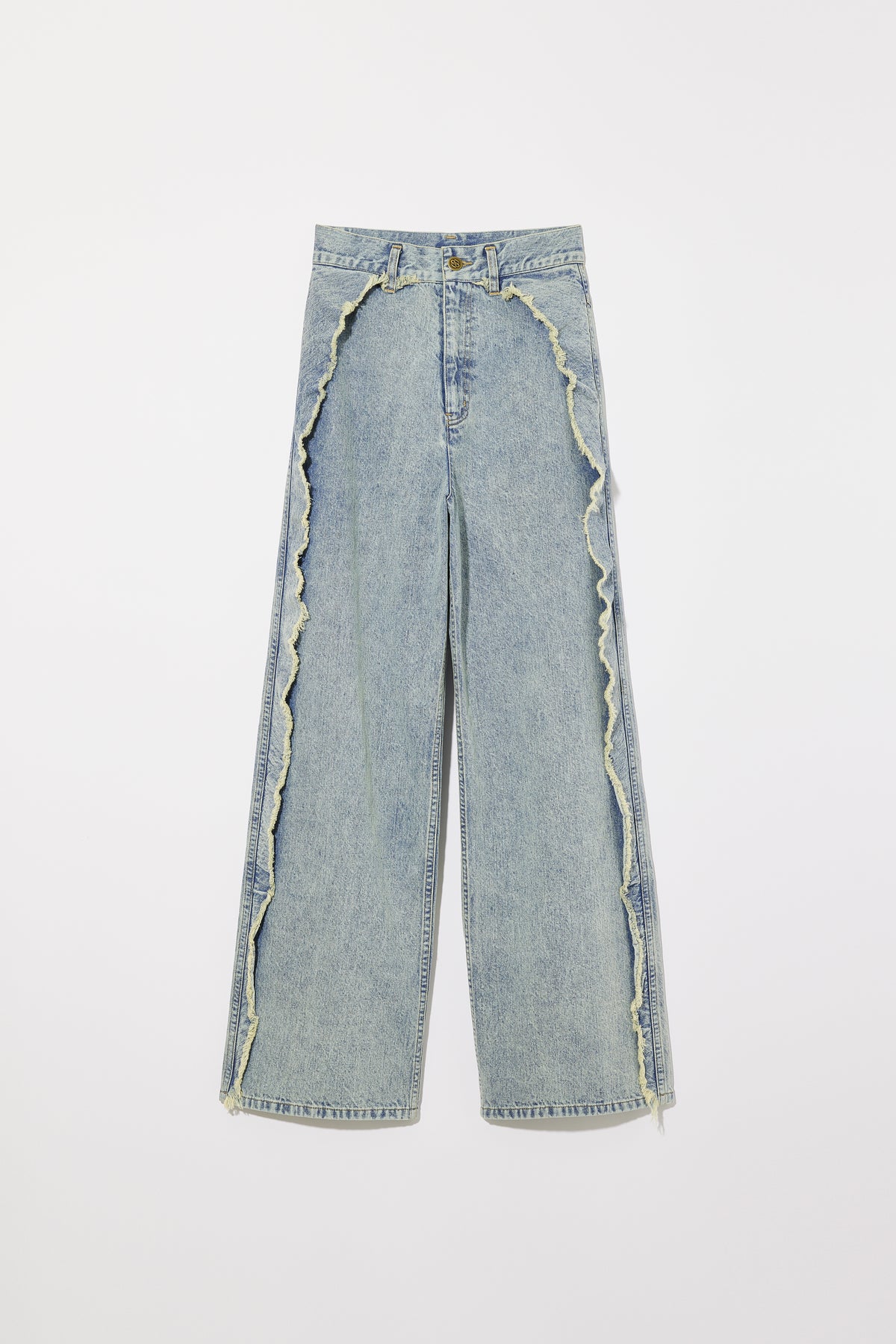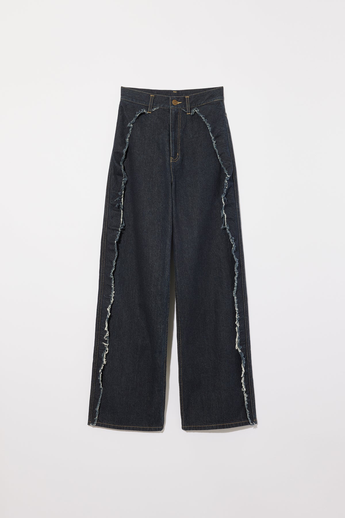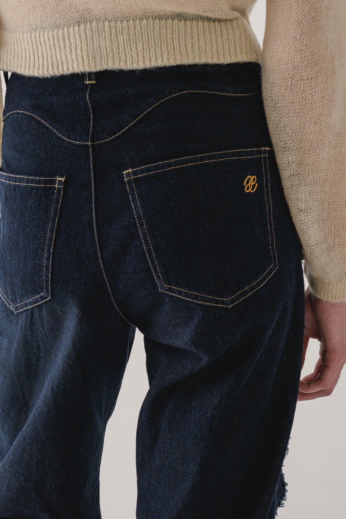インディゴ染めの最も古い中心地はインドであったとされている。そこから着想を得て、 ラッフルフリルのディテールをカジュアルに落とし込んだデニムパンツ。 フリルディティールの繊細なシルエットを再現するために、何度も修正を重ね、試行錯誤しました。Èaphiらしい柔らかい雰囲気を感じさせつつ、新しいムードも纏った1枚に仕上げました。