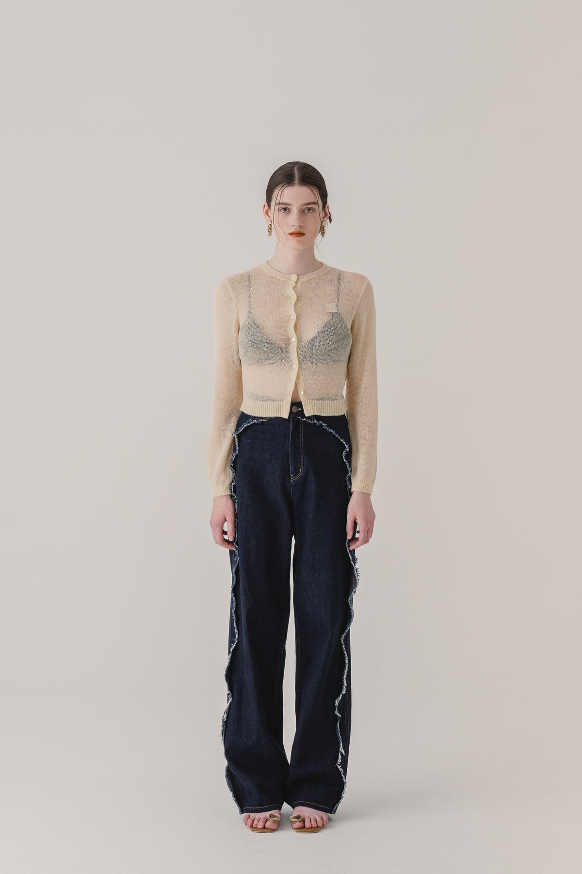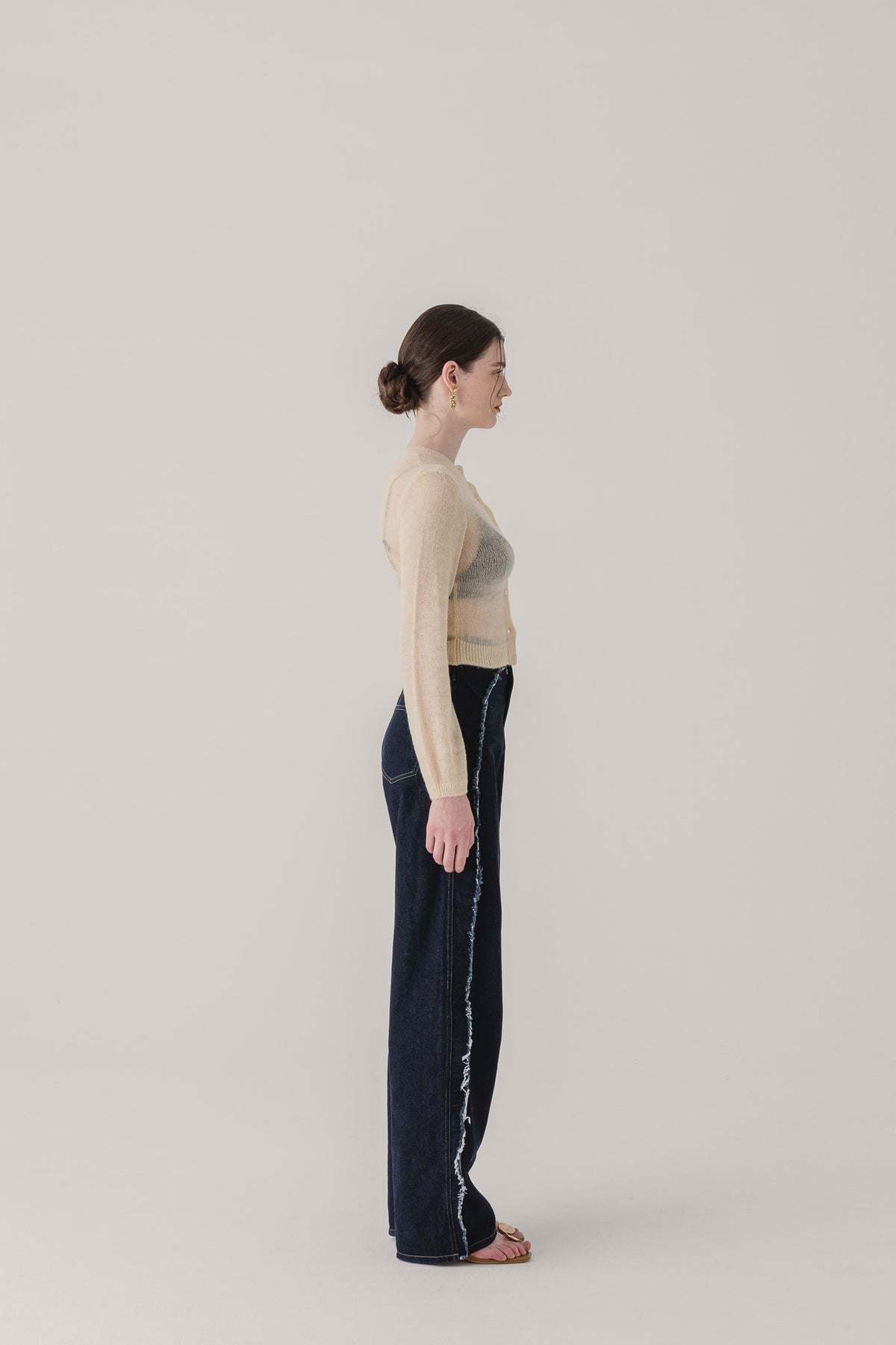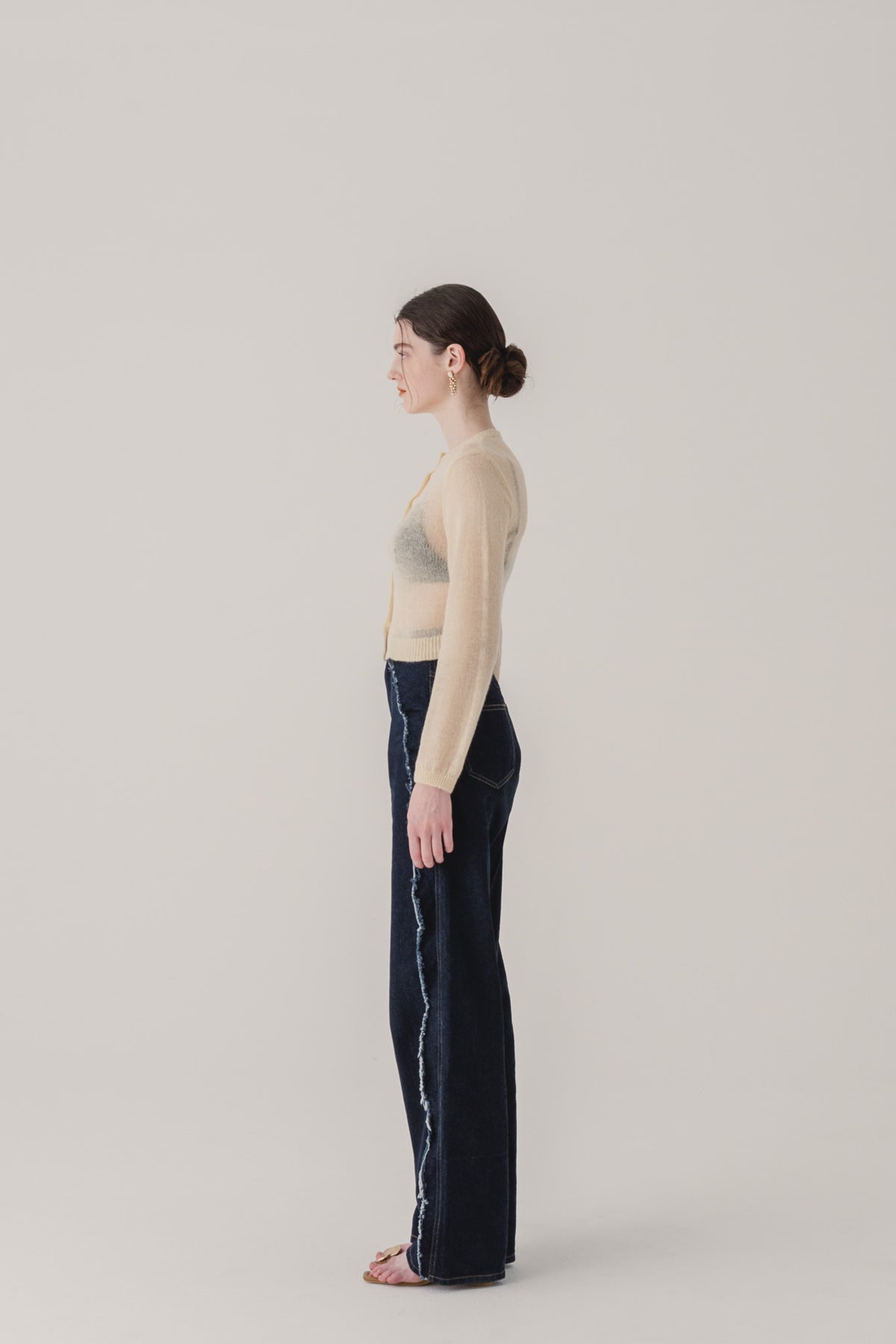 インディゴ染めの最も古い中心地はインドであったとされている。そこから着想を得て、 ラッフルフリルのディテールをカジュアルに落とし込んだデニムパンツ。 フリルディティールの繊細なシルエットを再現するために、何度も修正を重ね、試行錯誤しました。Èaphiらしい柔らかい雰囲気を感じさせつつ、新しいムードも纏った1枚に仕上げました。