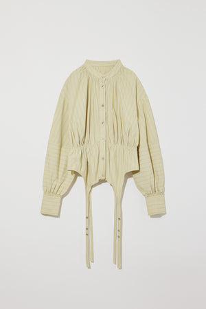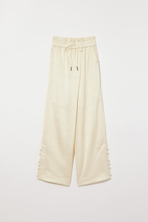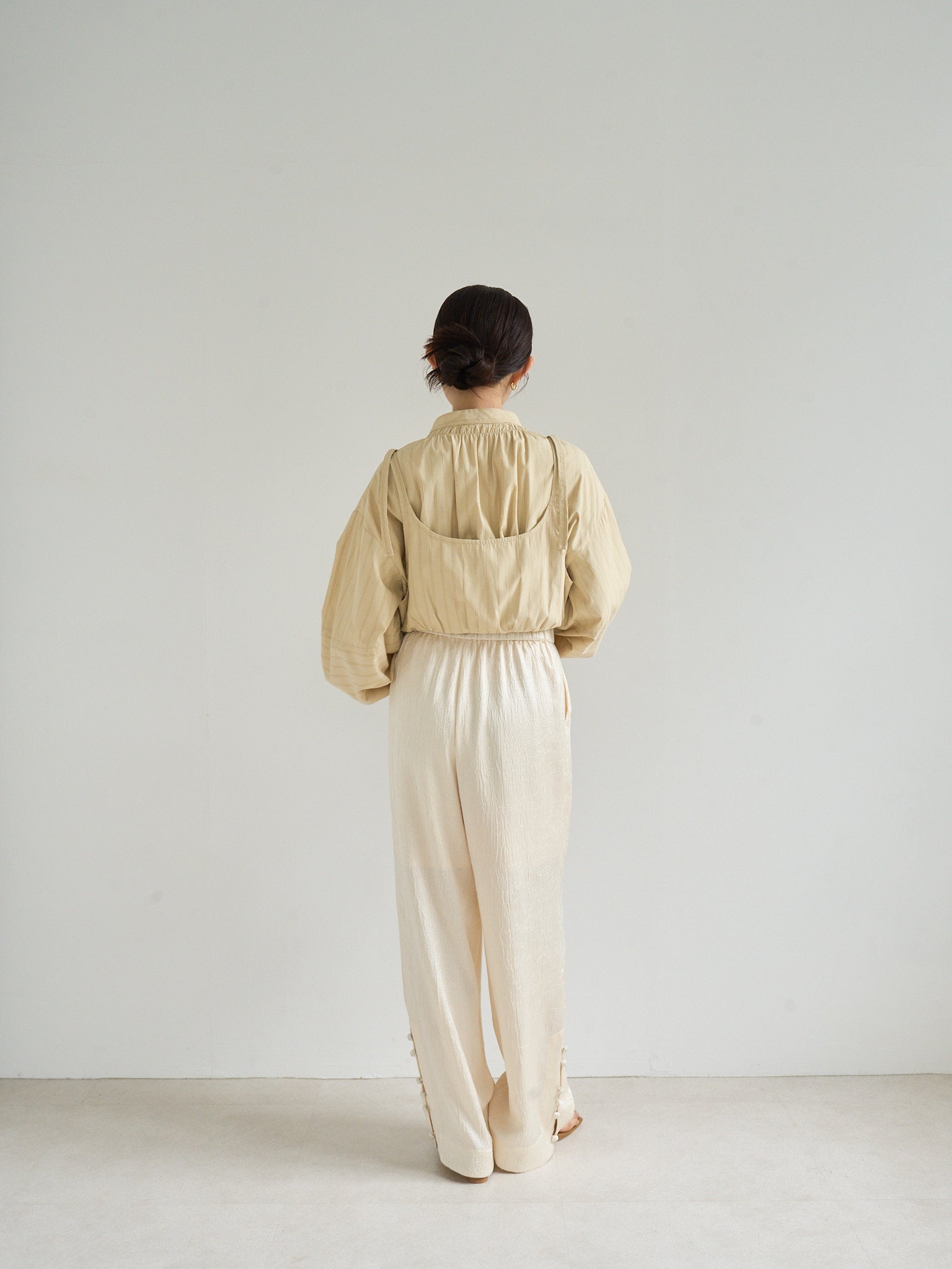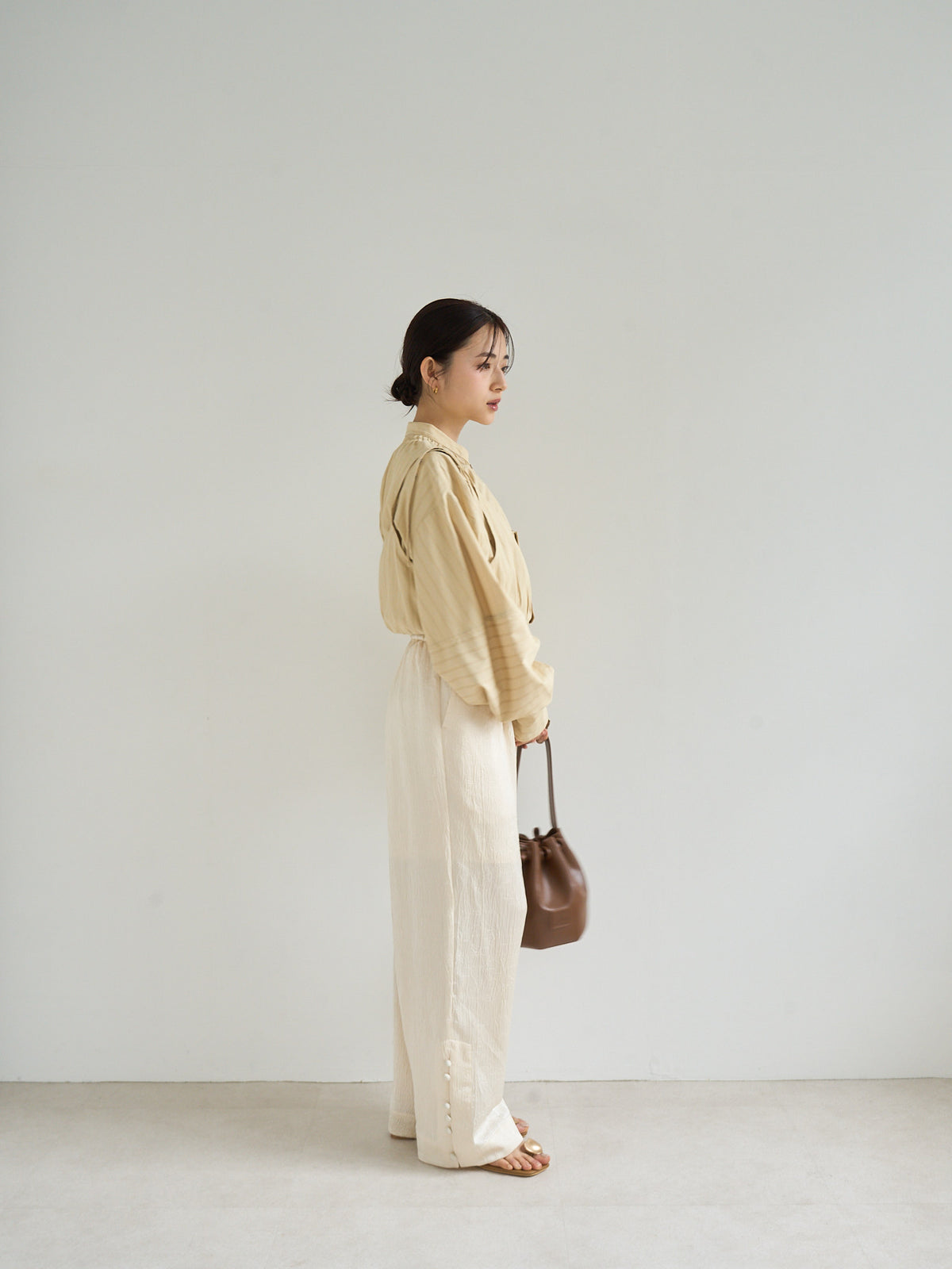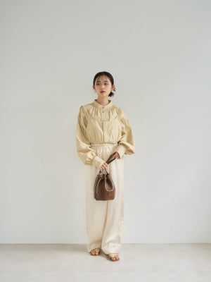 クラシカルなブラウスを、モダンなベージュトーンで昇華。ギャザーと丸みのあるディティールが印象的なトップスと、落ち感のあるパンツの組み合わせ。ブラウンバッグで全体を引き締め、品のあるリラックススタイルに仕上げました。