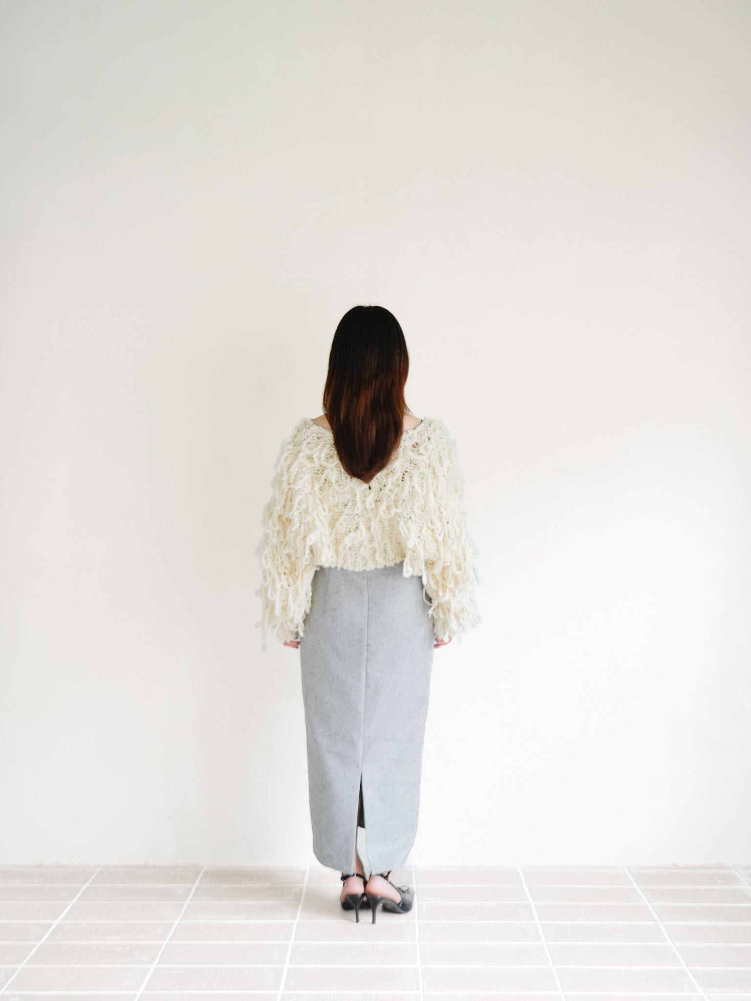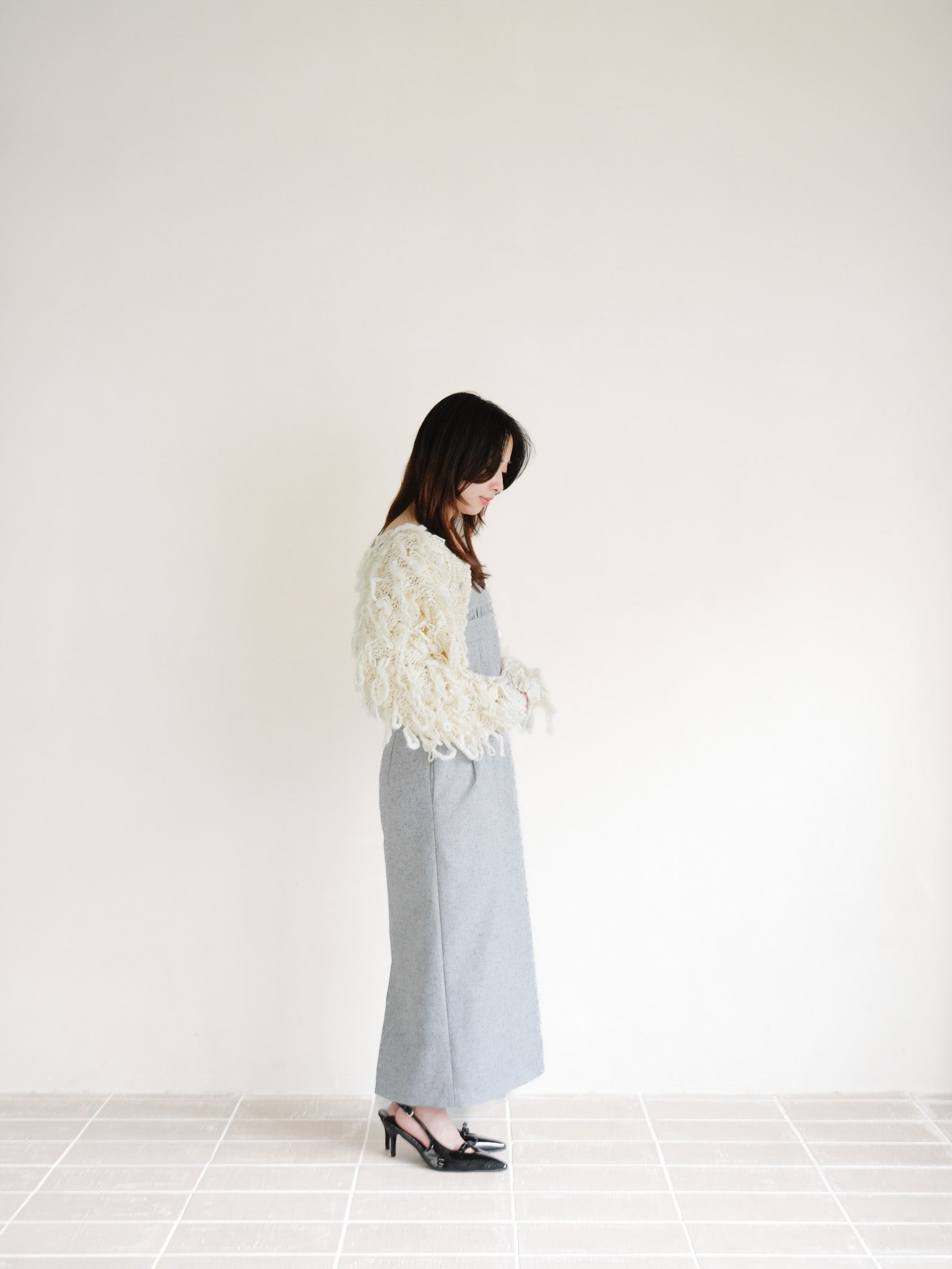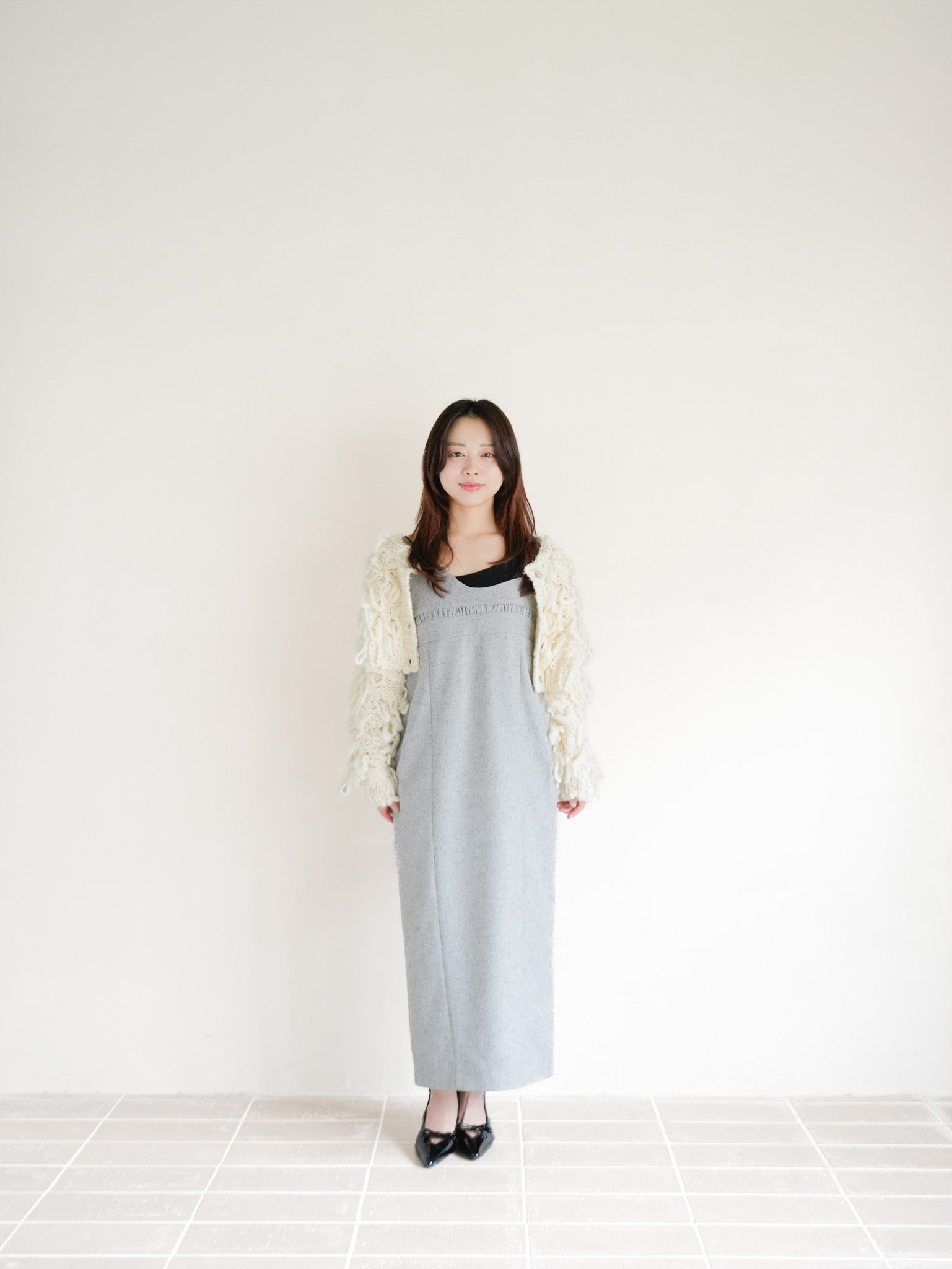 立体感のあるニットカーディガンを羽織り、直線的なIラインワンピースをインしたレイヤードスタイル。シンプルな中にも質感で奥行きを出し、抜け感と温かみが共存するコーディネートです。