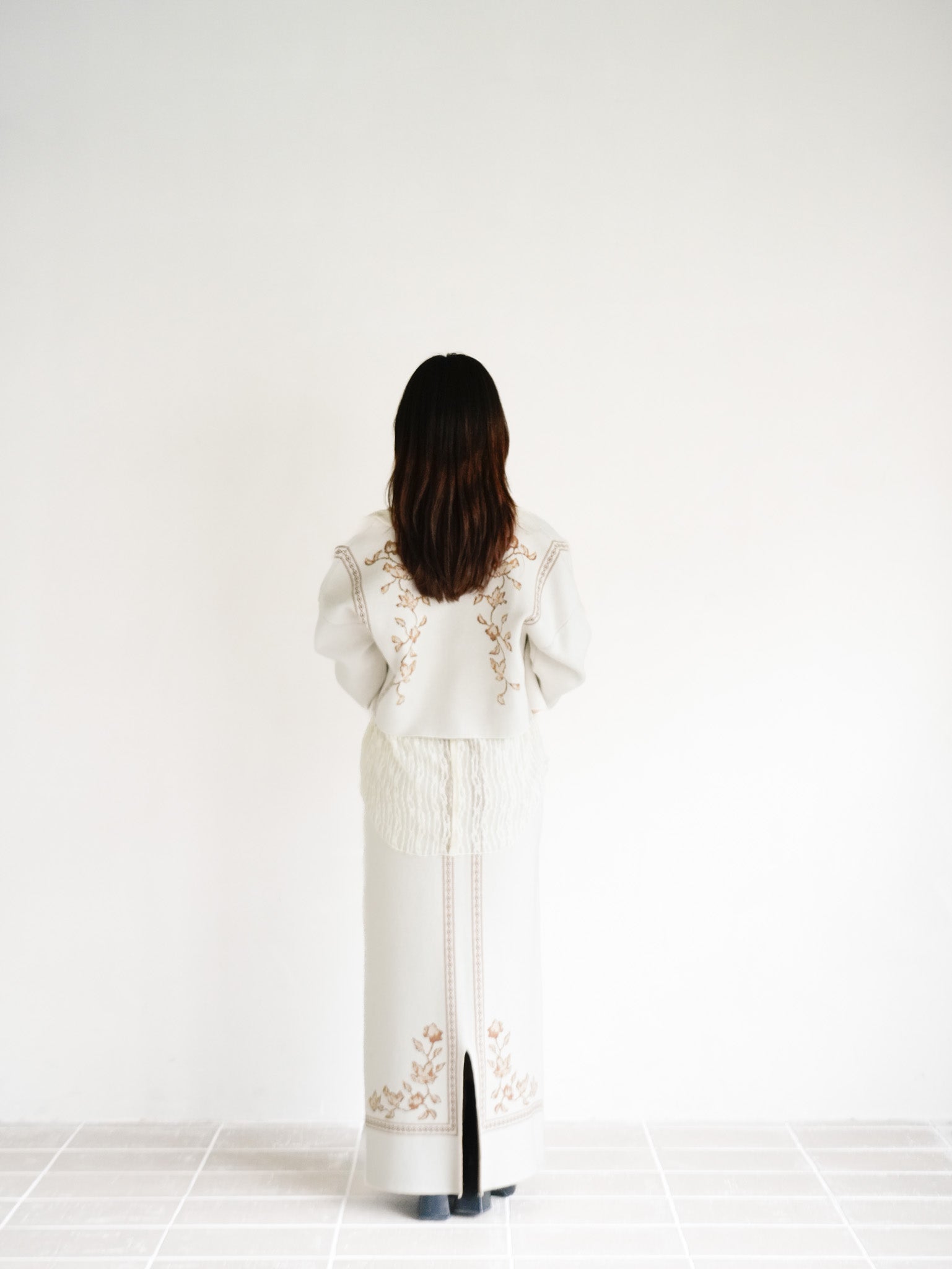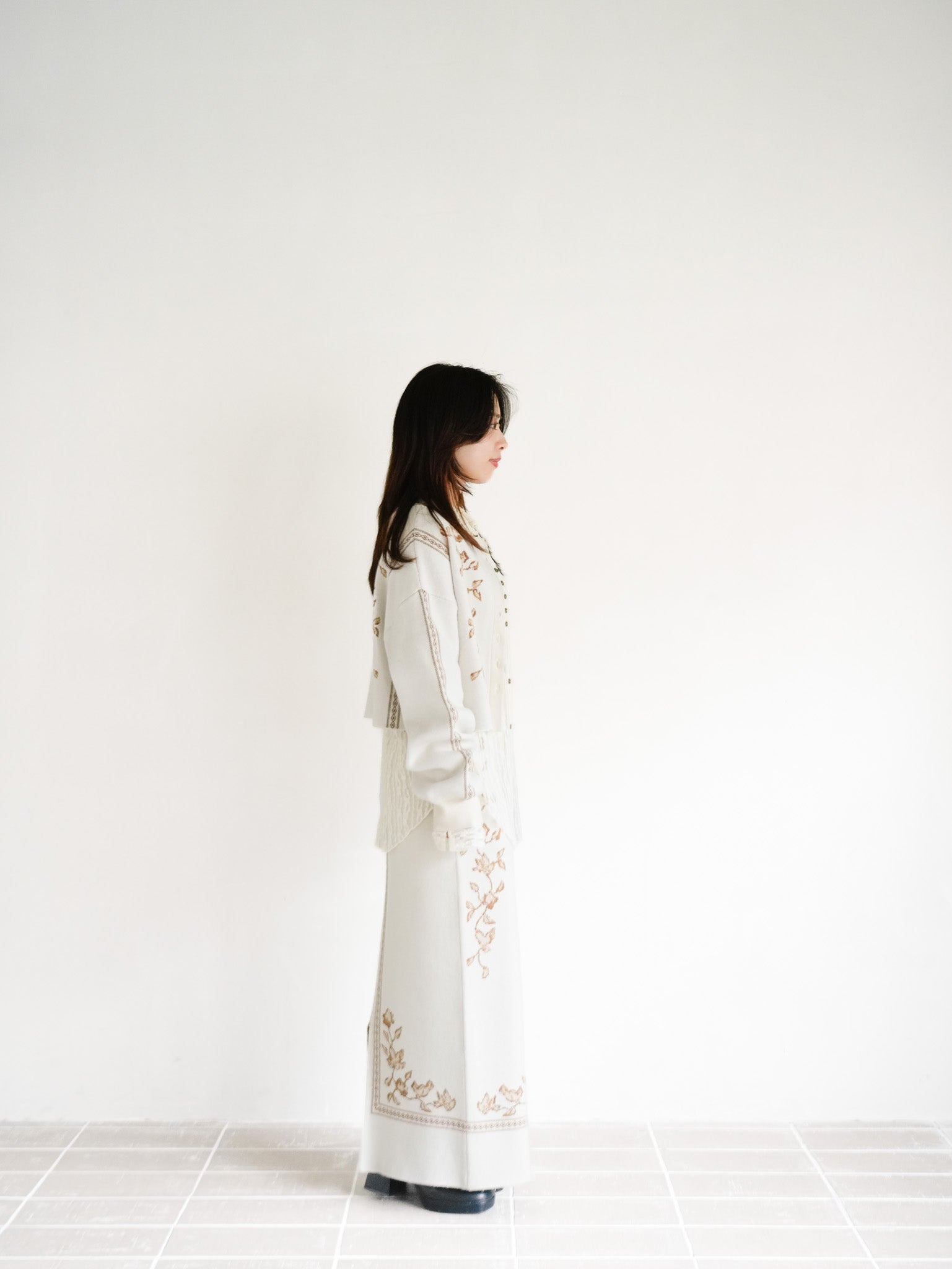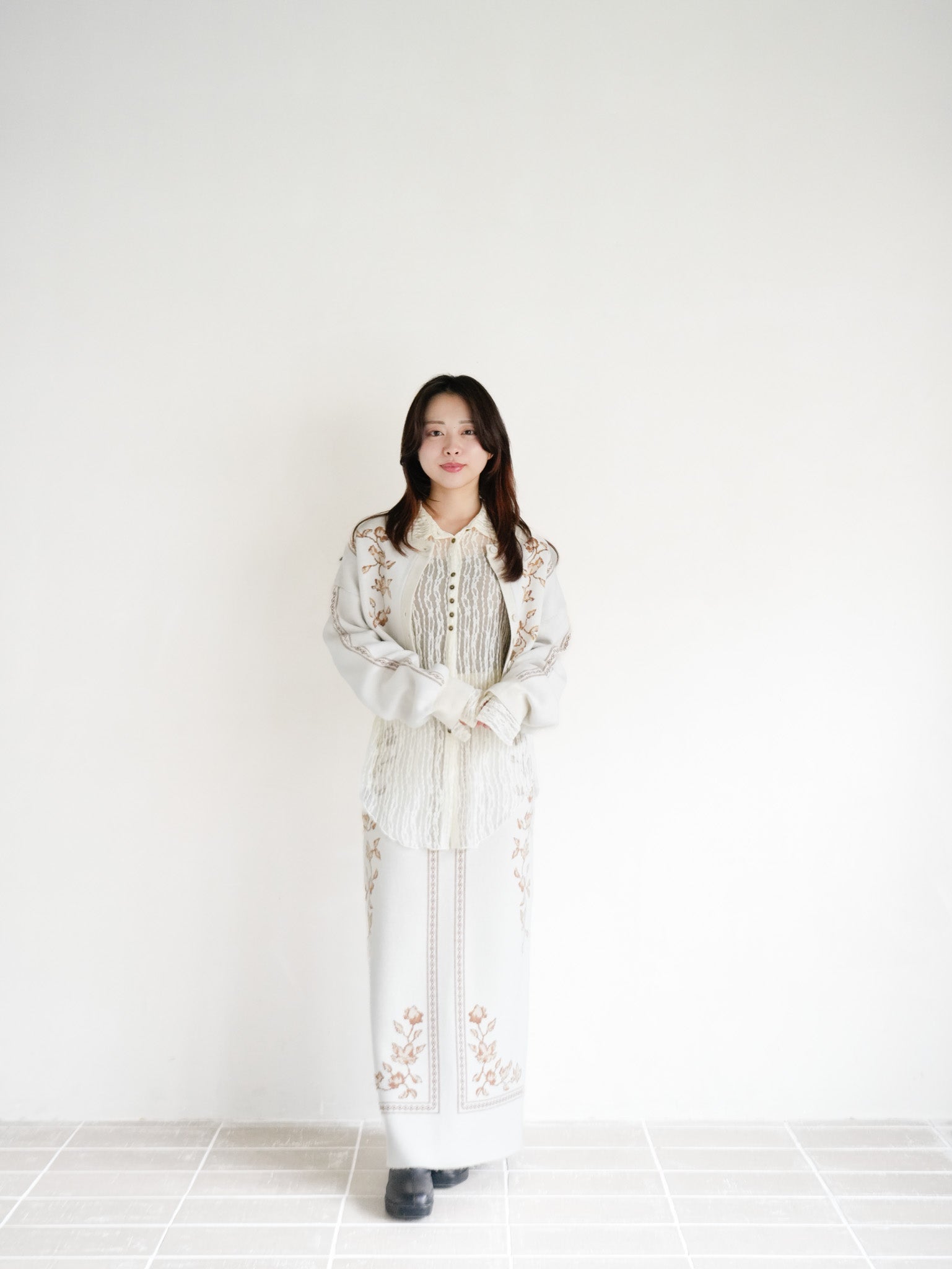 繊細な花柄が施されたセットアップに、レースのインナーを合わせたクラフト感漂うスタイル。クラシカルなムードに軽やかさを添え、丁寧な手仕事のような温もりを感じさせる装いに仕上げました。