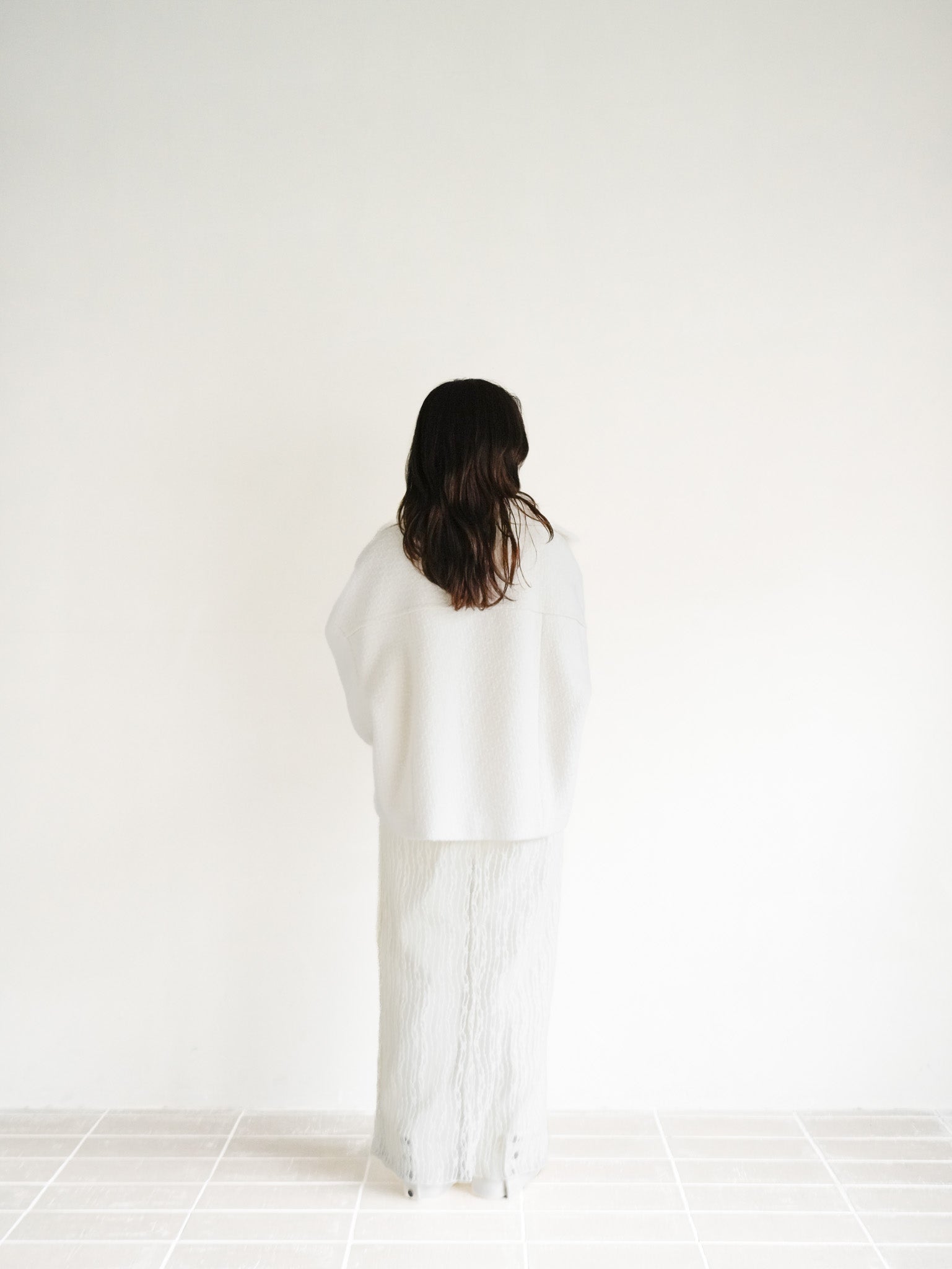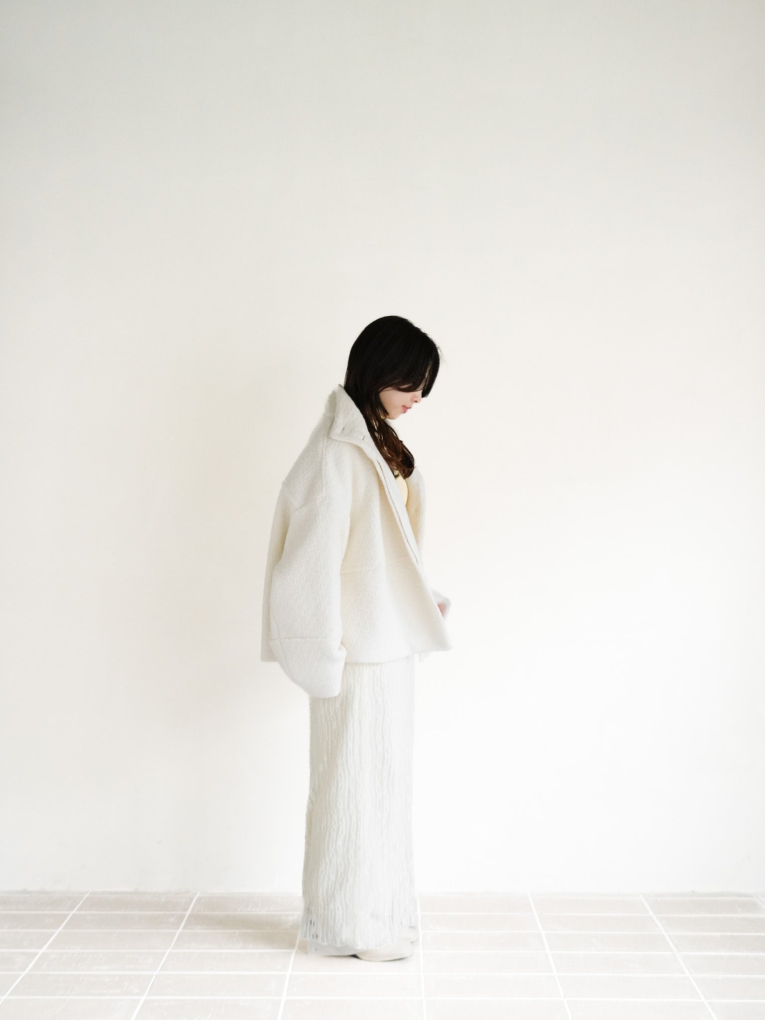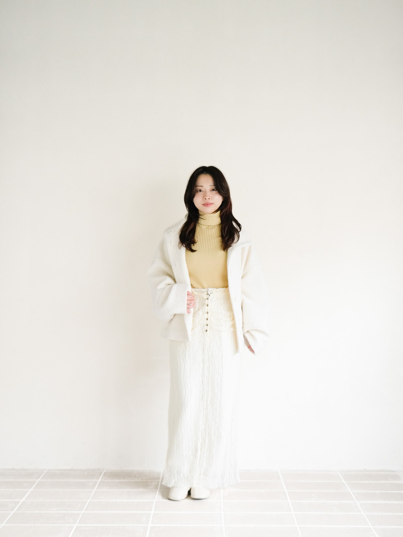 やわらかなアイボリーのワントーンでまとめた、冬のニュアンススタイル。表情豊かなスカートと、タートルネックニットのコントラストが心地よく、白のショートコートが上品さを引き立てます。優しさの中に芯を感じさせる着こなしです。