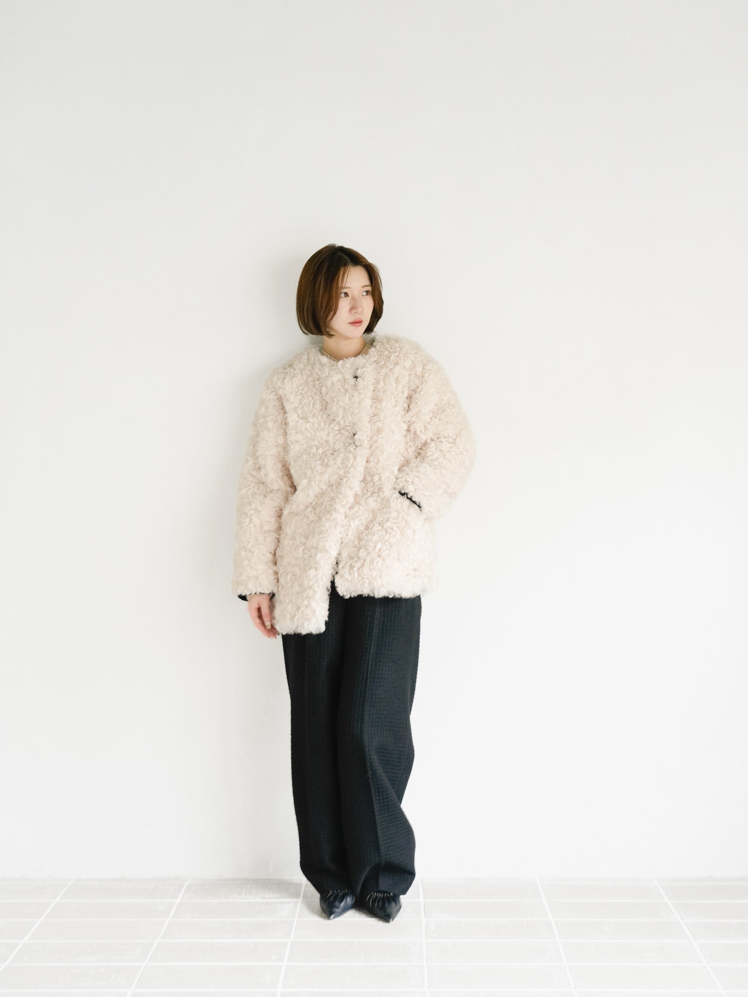 もこもことしたボアコートに、ブラックのパンツを合わせた定番の冬コーデ。色数を抑えてモノトーンにまとめることで、素材の違いがより印象的に。ラフすぎず、どこか大人の余裕を感じさせるスタイリングです。