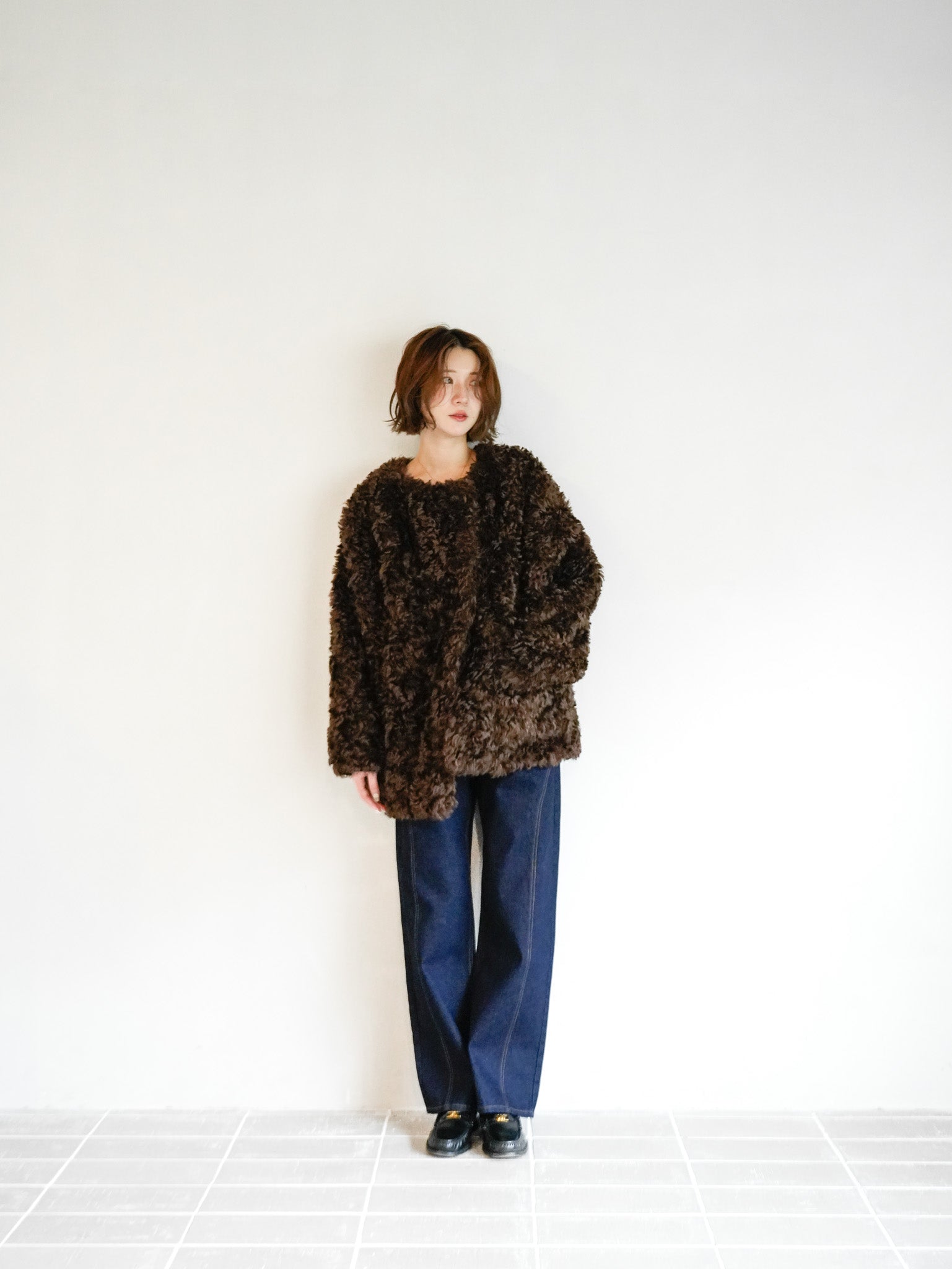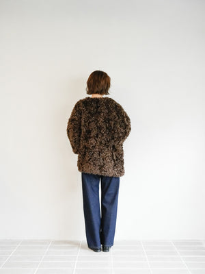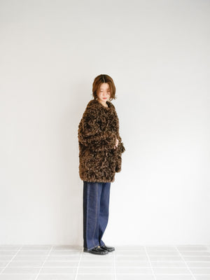 ボリューム感のあるダークブラウンのボアコートが主役の、冬らしい重厚感あるスタイリング。シンプルなインディゴデニムを合わせることで、甘さを抑えた都会的な印象に仕上げました。