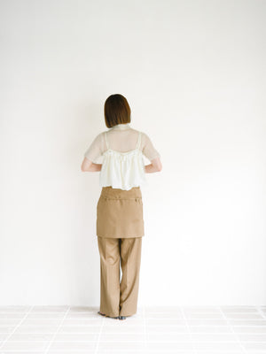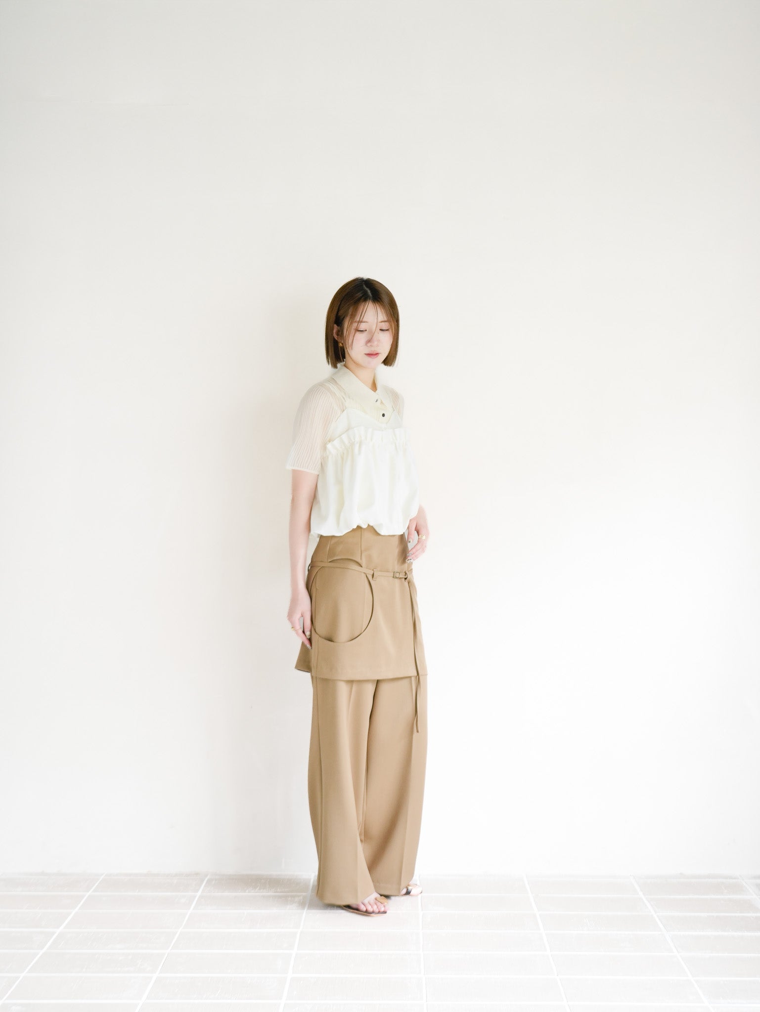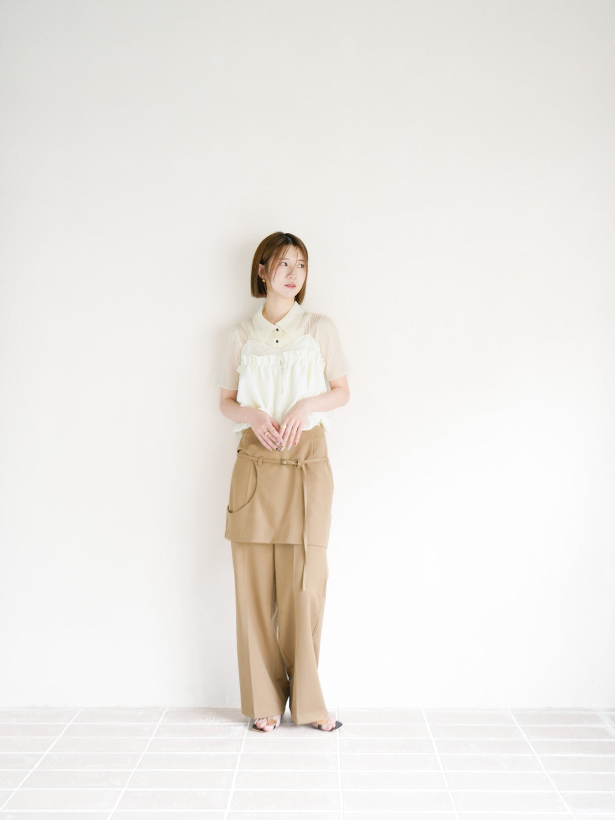 やわらかさとモダンさを両立させたニュアンススタイル。ドライな透け感のあるシャツに、表情豊かなキャミをレイヤード。Èaphiらしいパンツで重心を整え、抜け感を大切に仕上げました。