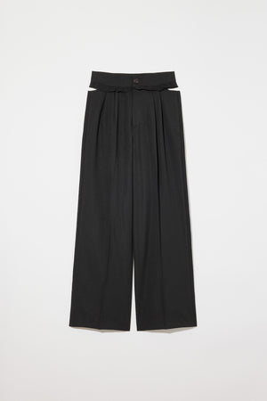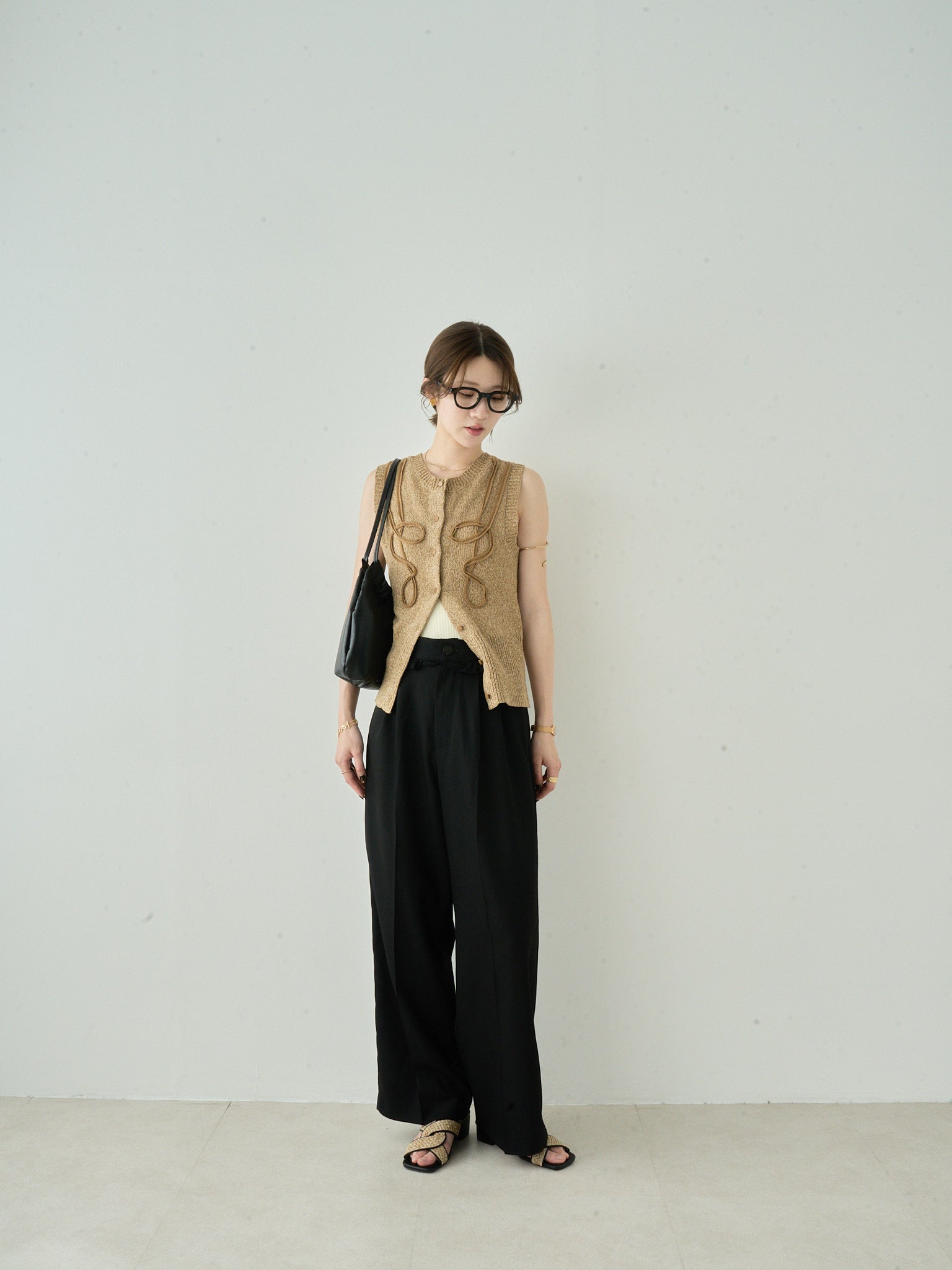 ゆるやかなスラックスに、デザイン性のあるフロントのコード刺繍ニットを合わせて。ブラック×ベージュのコントラストが映える、ほどよく力の抜けた都会的スタイルです。