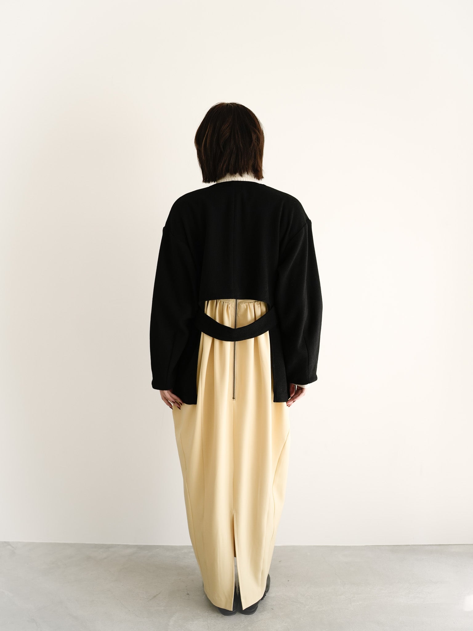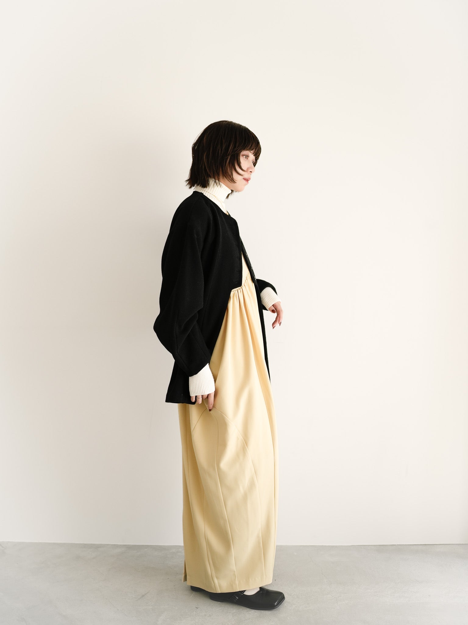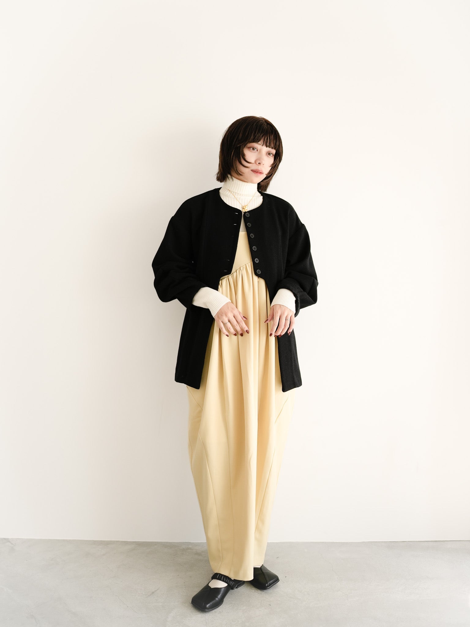 柔らかなイエローのワンピースにブラックのジャケットを重ね、コントラストで奥行きを。タートルの白を挟むことで、季節のぬくもりと軽やかさを両立したスタイルに仕上げました。