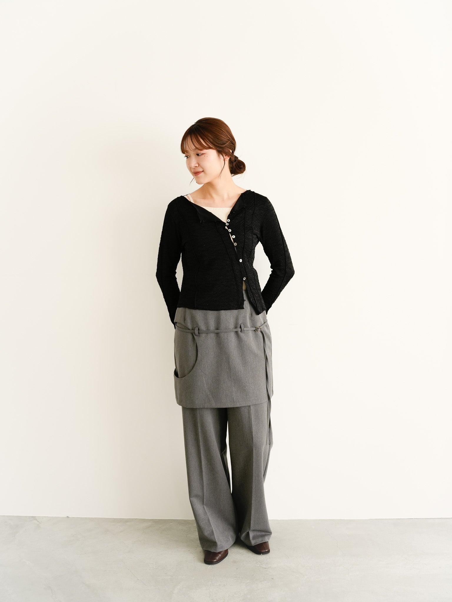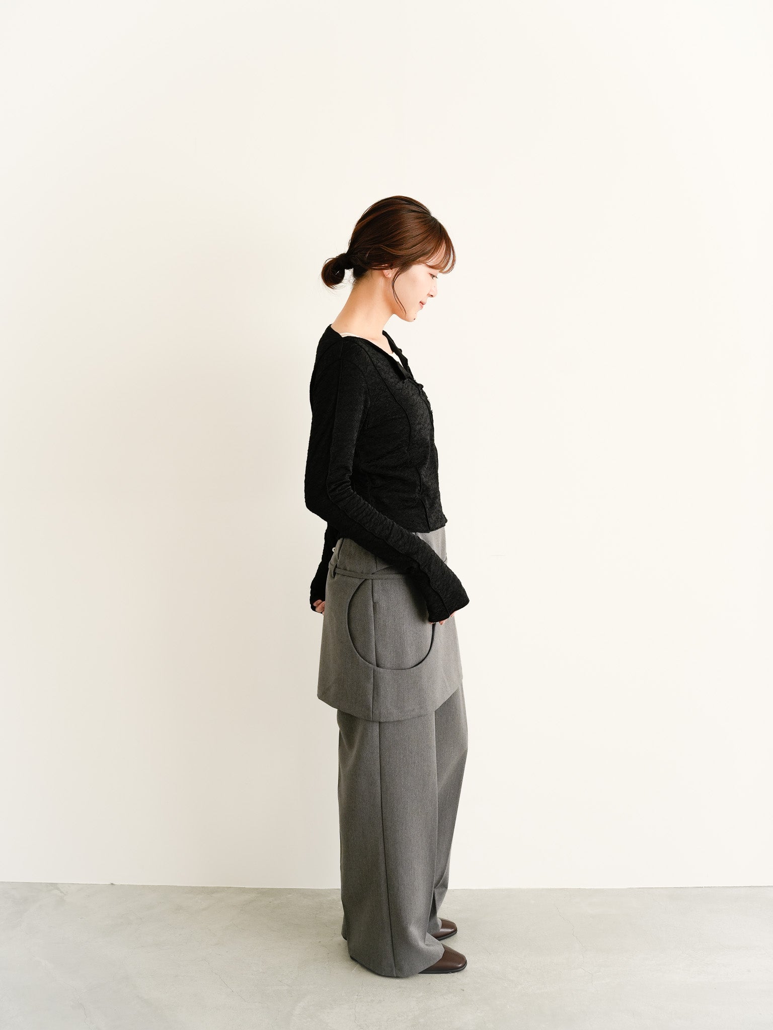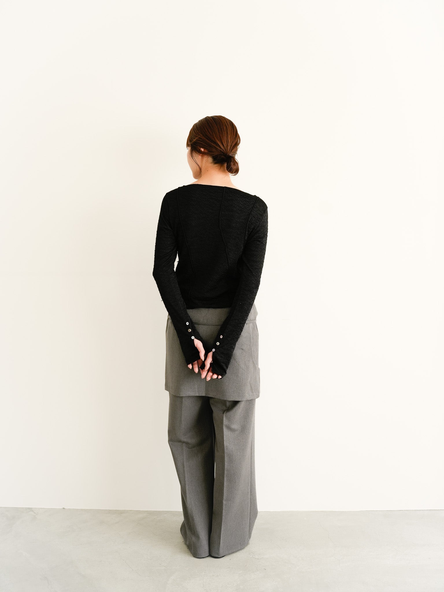 首元の開いたトップスとレイヤードパンツを合わせることでシンプルながらも、デザインで魅せるコーディネートに仕上げました。